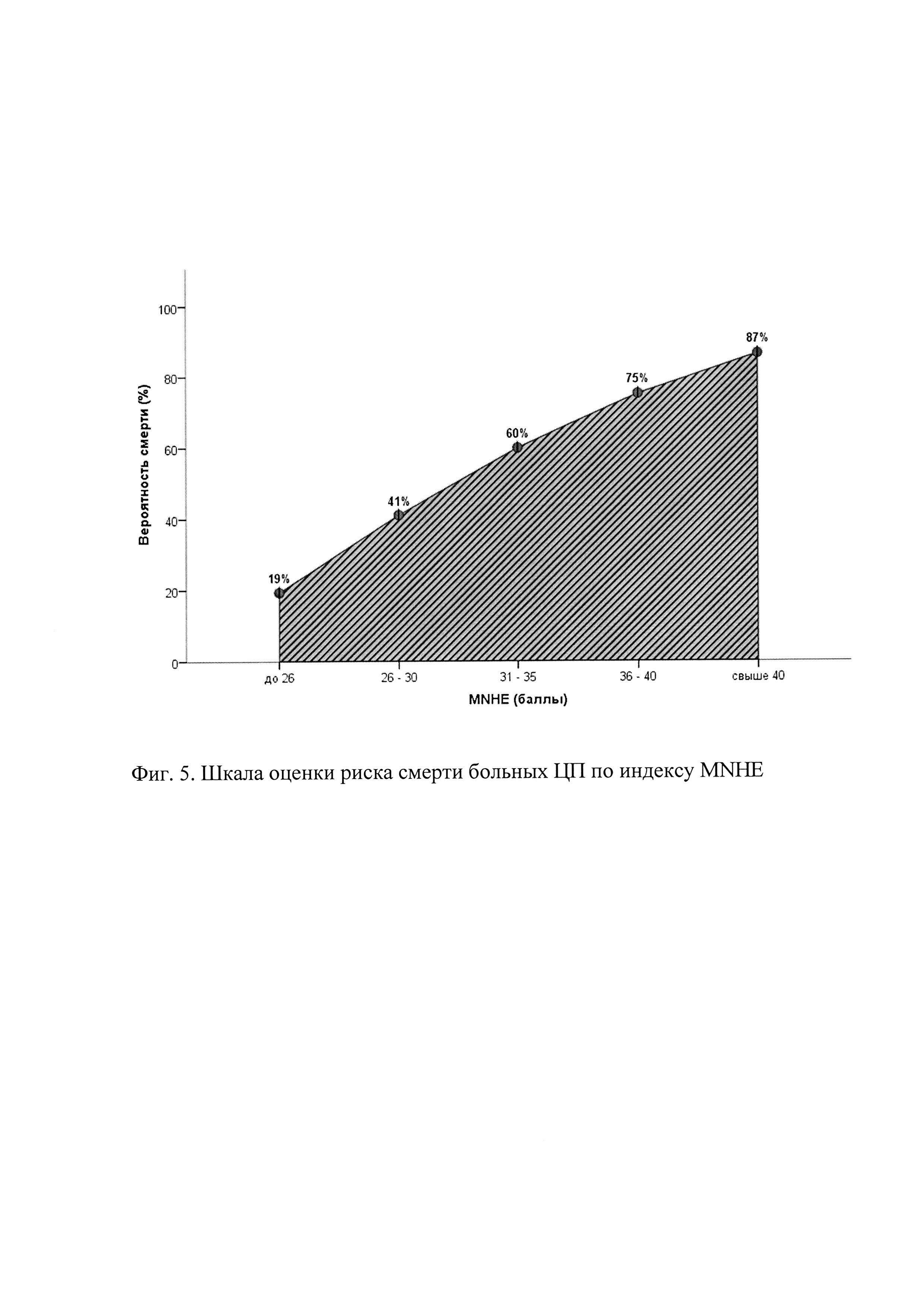Изобретение относится к медицине, в частности к гепатологии и трансплантологии, и может использоваться для оценки риска смерти при циррозе печени. Цирроз печени (ЦП) - это патологический процесс, являющийся конечной стадией различных хронических заболеваний печени и требующий обязательного лечения, единственным эффективным методом которого остается трансплантация печени (ТП). На сегодняшний день объективной причиной, сдерживающей широкое применение ТП, остается дефицит донорских органов. Поэтому время ожидания операции нередко увеличивается, что влечет за собой рост смертности больных. Стратификация потенциальных реципиентов печени, с определением их приоритетного отбора на операцию в первую очередь опирается на систему оценки статуса неотложности оперативного вмешательства, базирующуюся на клинических и лабораторных данных. Для объективизации этого процесса ведется поиск специфических факторов, усугубляющих течение цирроза, интерпретация которых может осуществляться как независимо друг от друга, так и совокупно. На основании этих данных предлагаются различные способы. Для оценки долгосрочного прогноза жизни больного ЦП используют индекс коморбидности Charlson(Charlson Comorbidity Index), который дает возможность спрогнозировать продолжительность жизни пациента на основании оценки коморбидной патологии (Charlson ME, Pompei Ρ, Ales KL, Mac Kenzie CR. A new method of classifying prognostic comorbidity in longitudinal studies: development and validation. J Chronic Dis. 1987; 40 (5): 373-383). Наличие у пациента двух и более заболеваний, синдромов или соматических расстройств, связанных между собой единым патогенетическим механизмом или совпадающих по времени, позволяет произвести расчет вероятности 10-летней выживаемости. В зависимости от степени влияния на риск смерти каждого патологического состояния ему присваивается определенное количество баллов, на основании их суммы рассчитывается вероятность смерти больного. Например, при итоговом значении равном шести баллам, десятилетняя выживаемость не превышает 2,2%. Несмотря на то, что индекс Charlson позволяет рассчитать вероятность смерти больного в течение достаточно долгого периода времени, его система оценки не включает в себя анализ лабораторных показателей, что, в случае прогрессирования основного заболевания или ухудшения соматического статуса, не позволит заблаговременно принять меры по стабилизации и улучшению состояния пациента. В таком случае данный способ оценки тяжести течения ЦП не применим. Классификация ЦП по Child-Turcotte-Pugh представляет собой методику предварительной диагностики тяжести заболевания. С ее помощью осуществляют приблизительную оценку тяжести ЦП и продолжительности жизни больного (Pugh RN, Murray-Lyon IM, Dawson JL, et. al. Transection of the oesophagus for bleeding oesophageal varices. Br J Surg. 1973; 60 (8): 646-648; Child CG, Turcotte JG. The Liver and Portal Hypertension. Philadelphia, WB Saunders Co. 1964). Тяжесть заболевания оценивается по системе баллов, которые рассчитываются исходя из оценки лабораторных данных (показателей билирубина, альбумина и свертывающей системы крови) и клинических проявлений цирроза (асцит, печеночная энцефалопатия). Баллы выставляются в зависимости от значения каждого из параметров от 1 до 3, после чего суммируются. Всего установлено три класса тяжести цирроза. Например, при ЦП класса В с суммой рассчитанных балов от 7 до 9, годичная выживаемость больных составляет 81%, а двухлетняя - 57%. 