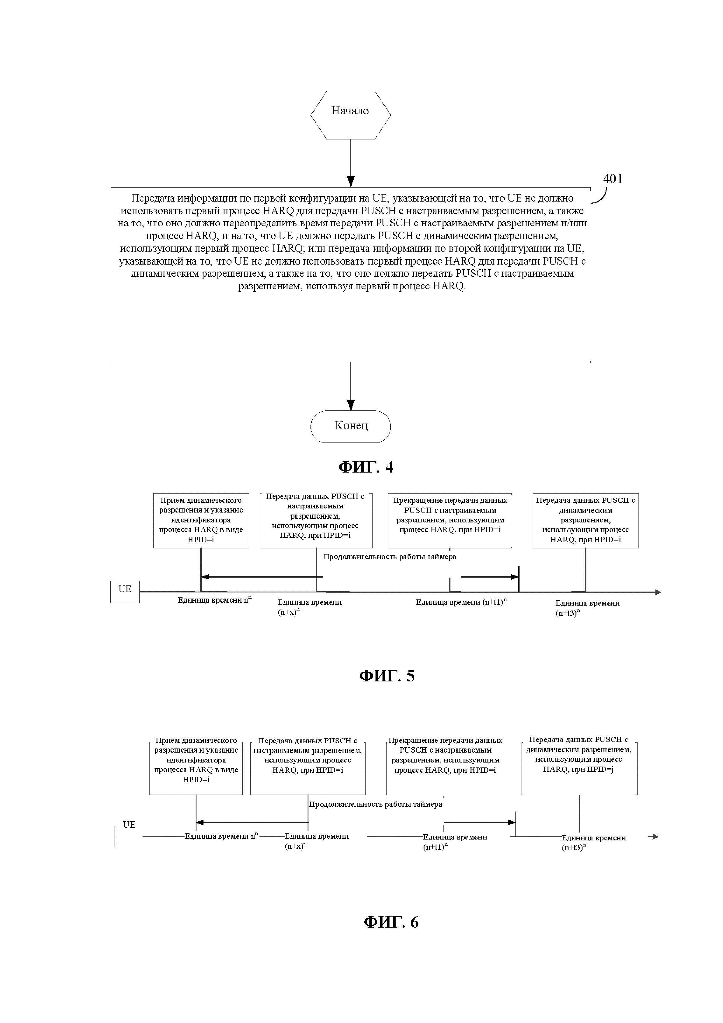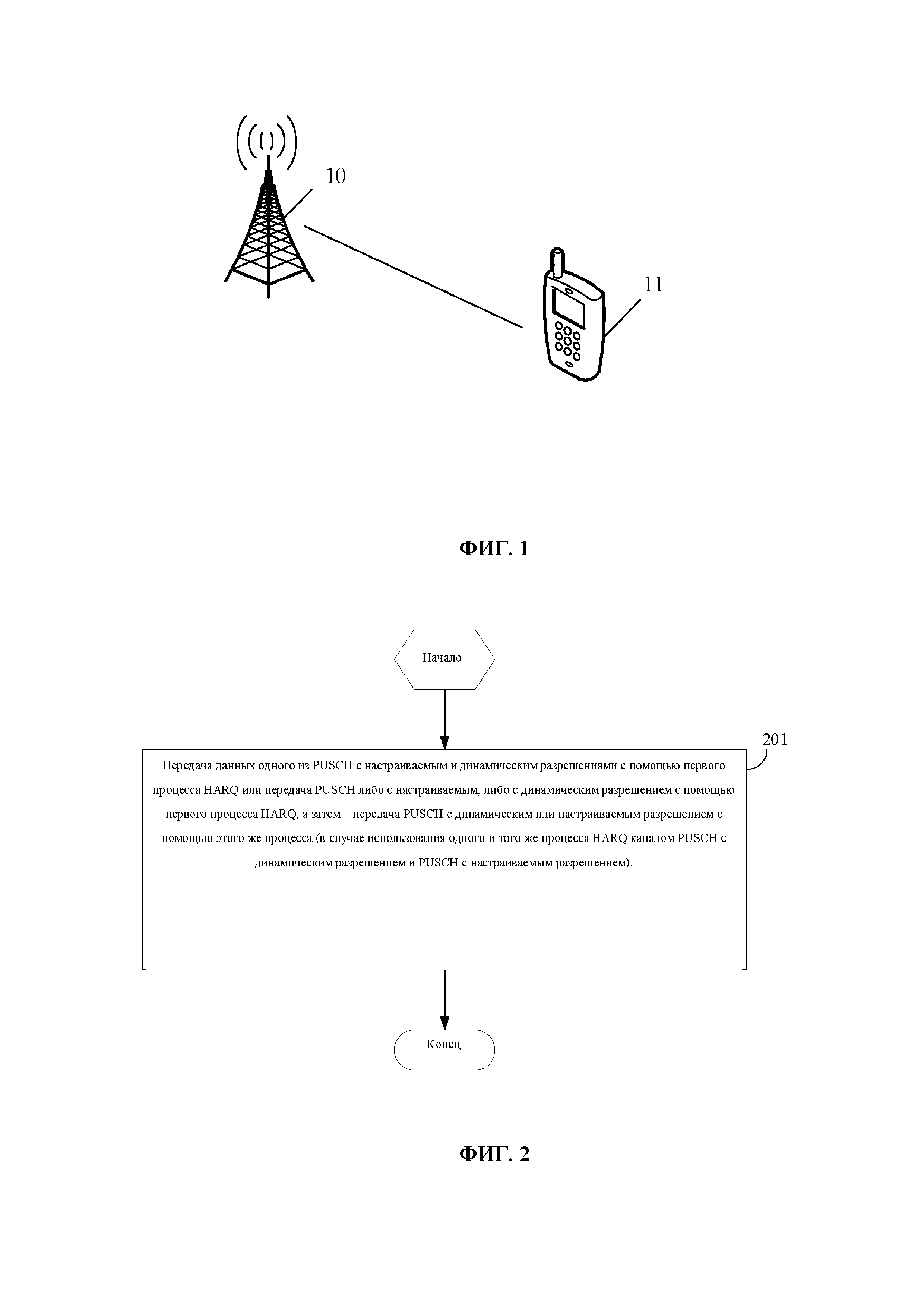 1. Способ передачи данных для пользовательского оборудования (UE), включающий: в случае использования одного и того же первого процесса гибридного автоматического запроса на повторение передачи (HARQ) физическим общим восходящим каналом (PUSCH) и PUSCH с настраиваемым разрешением передачу данных одного из PUSCH с настраиваемым и динамическим разрешениями с использованием первого процесса HARQ, при этом передача данных одного из PUSCH с настраиваемым и динамическим разрешениями с использованием первого процесса HARQ включает: отказ от использования первого процесса HARQ для передачи данных PUSCH с настраиваемым разрешением, а также передачу данных PUSCH с динамическим разрешением с использованием первого процесса HARQ; включает случаи, когда время передачи PUSCH с настраиваемым разрешением с использованием первого процесса HARQ предшествует времени передачи PUSCH с динамическим разрешением, а также когда повторение PUSCH с настраиваемым разрешением совпадает с передачей PUSCH с динамическим разрешением во временной области, происходит прекращение передачи PUSCH с настраиваемым разрешением посредством первого процесса HARQ, а передача PUSCH с динамическим разрешением посредством первого процесса HARQ осуществляется. 2. Способ передачи данных по п. 1, отличающийся тем, что передача данных одного из PUSCH с настраиваемым и динамическим разрешениями с использованием первого процесса HARQ также включает: отказ от использования первого процесса HARQ для передачи данных PUSCH с настраиваемым разрешением, повторное определение времени передачи данных PUSCH с настраиваемым разрешением и/или процесса HARQ, а также передачу данных PUSCH с динамическим разрешением с использованием первого процесса HARQ в соответствии с информацией по первой конфигурации; или отказ от использования первого процесса HARQ для передачи данных PUSCH с динамическим разрешением, а также передачу данных PUSCH с настраиваемым разрешением с использованием первого процесса HARQ в соответствии с информацией по второй конфигурации. 3. Способ передачи данных по п. 2, отличающийся тем, что первый процесс HARQ не используется для передачи данных PUSCH с настраиваемым разрешением и повторное определение времени передачи данных PUSCH с настраиваемым разрешением и/или процесса HARQ осуществляется в соответствии с информацией по первой конфигурации, включает как минимум одну из следующих функций: настройку первого таймера в соответствии с информацией по первой конфигурации, прекращение передачи данных PUSCH с настраиваемым разрешением с использованием первого процесса HARQ в пределах времени работы первого таймера, а также повторное определение времени передачи данных PUSCH с настраиваемым разрешением в пределах времени бездействия первого таймера; настройку первого таймера в соответствии с информацией по первой конфигурации, прекращение передачи данных PUSCH с настраиваемым разрешением с использованием первого процесса HARQ в пределах времени работы первого таймера, а также повторное определение времени передачи данных PUSCH с настраиваемым разрешением и процесса HARQ в пределах времени работы или бездействия первого таймера; если приоритет логического канала PUSCH с настраиваемым разрешением выше, чем приоритет логического канала PUSCH с динамическим разрешением, настройку второго таймера в соответствии с информацией по первой кон
