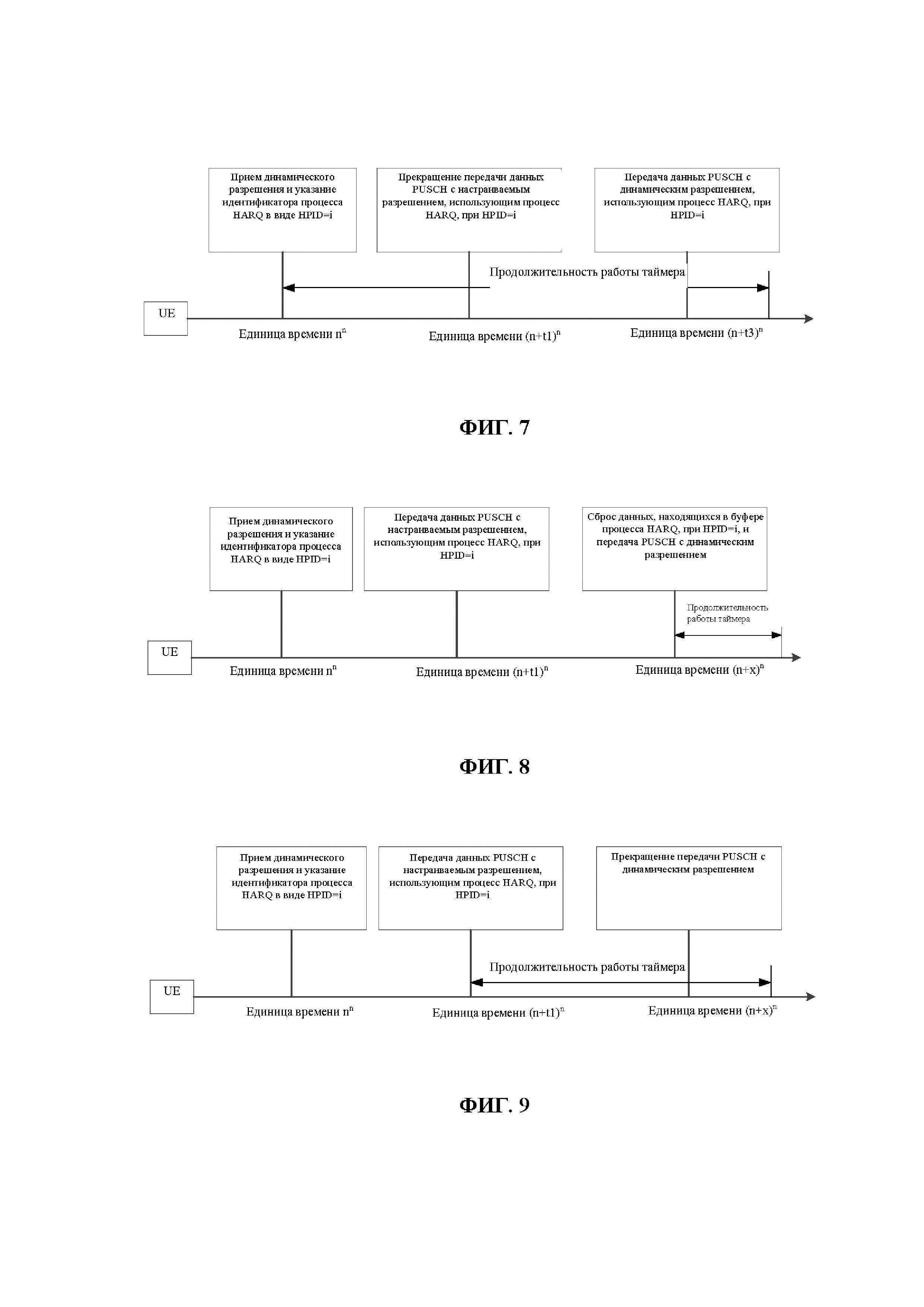 Изобретение относится к области беспроводной связи. Техническим результатом является предотвращение возникновения противоречий на пользовательском оборудовании посредством предоставления возможности пользовательскому оборудованию определения того, как передать PUSCH с динамическим разрешением и PUSCH с настраиваемым разрешением более эффективным образом. Способ передачи включает (в случае использования одного и того же процесса HARQ каналом PUSCH с динамическим разрешением и PUSCH с настраиваемым разрешением) передачу данных одного из PUSCH с настраиваемым и динамическим разрешениями с помощью первого процесса HARQ или передачу PUSCH либо с настраиваемым, либо с динамическим разрешением с помощью первого процесса HARQ, а затем - передачу PUSCH с динамическим или настраиваемым разрешением с помощью этого же процесса. 4 н. и 8 з.п. ф-лы, 13 ил.