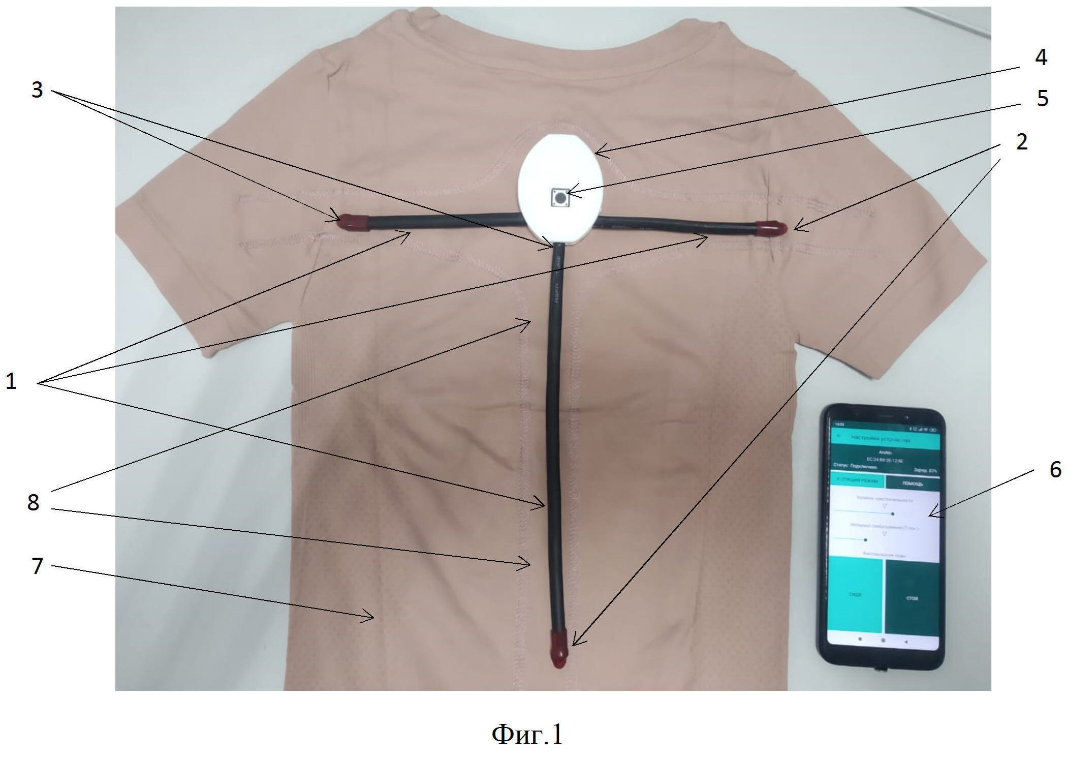 Датчики 1 с блоком 4 вставляют в специальный карман 8 футболки 7 кнопкой 5 наружу. Длительным нажатием на кнопку 5 включают блок 4. Включение подтверждается длительным вибросигналом и световой индикацией. Футболку с датчиками 1 надевают, она должна ровно и плотно прилегать к телу. Включают на смартфоне модуль Bluetooth через настройки смартфона, либо через установленное соответствующее приложение с программным обеспечением. Приложение производит подключение смартфона к блоку 4 для дальнейшей работы.