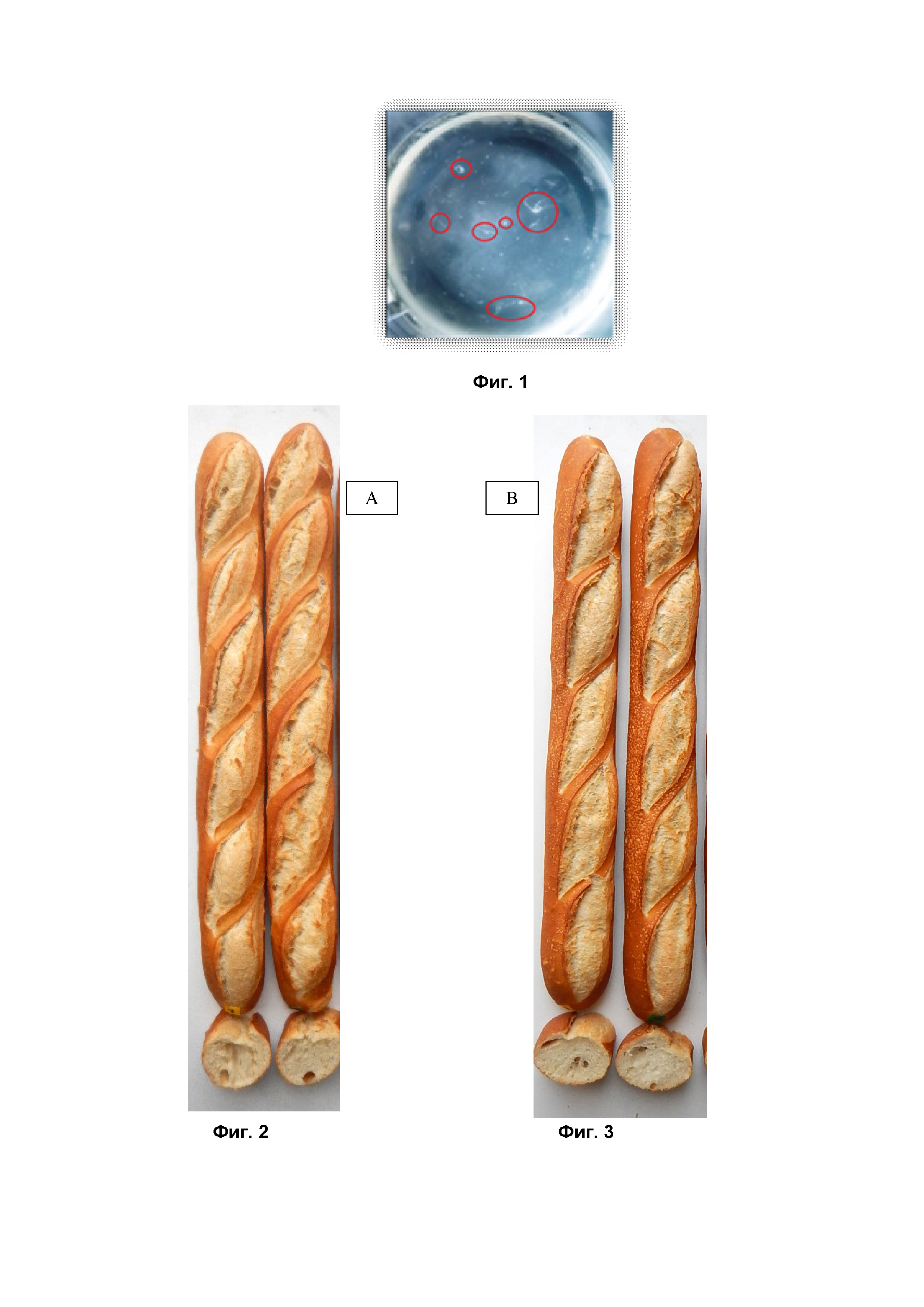 Настоящее изобретение относится к хлебопекарному улучшителю, содержащему микроорганизмы и имеющему рН от 3,5 до 5. Применение хлебопекарных улучшителей, в частности улучшителей с ферментативной активностью или активностями, известно давно. В частности, известной практикой является использование таких содержащих ферменты улучшителей в порошкообразном виде. Порошкообразные улучшители, содержащие ферменты, имеют ряд недостатков. Они показывают тенденцию к распылению в воздухе и оседанию по всему помещению. Это требует не только регулярной очистки рабочих площадей, но и может вызвать аллергические реакции у рабочих. Последнее происходит из-за того, что ферменты состоят из белков и обладают хорошо известными аллергическими свойствами. Кроме того, порошки трудно дозировать автоматизированным способом. Указанные проблемы удалось решить лишь частично за счёт применения содержащих ферменты улучшителей в форме гранул, драже или таблеток. Предлагалось также использовать жидкие улучшители, содержащие ферменты. В действительности, преимуществом указанных жидких улучшителей является то, что они не распыляются в воздухе и, тем самым, ограничивают риск возникновения аллергических реакций у тех, кто работает в пекарне. Жидкие улучшители могут также дозироваться автоматически при условии, что указанные жидкий улучшитель является гомогенным в процессе дозирования. Однако в состав жидких улучшителей обычно входят жидкие жировые ингредиенты или полиолы, или гидроколлоиды, или консерванты, использование которых в рецептурах некоторых хлебобулочных изделий и/или в некоторых странах не разрешается законодательством. Кроме того, присутствие жира обычно не одобряется сегодняшними потребителями. ЕР 1 729 586 на имя заявителя предлагает твёрдый улучшитель с ферментативной активностью, имеющий состав, специально разработанный для того, чтобы пекарь имел возможность приготовить у себя в пекарне жидкий улучшитель путём диспергирования указанного твёрдого улучшителя в воде. Однако следует отметить, что микробный состав и внешний вид жидкого улучшителя, как описано в ЕР 1 729 586, ухудшаются с увеличением времени хранения, в частности, если хранение проводится при температуре окружающей среды, а также при 4°С. Совершенно очевидно, что это представляет собой серьёзный недостаток для конечного пользователя, поскольку улучшитель в результате этого становится непригодным к употреблению. Следовательно, сохраняется потребность в обеспечении пользователей хлебопекарным улучшителем, содержащим фермент, или хлебопекарным улучшителем с ферментативной активностью, что сделает возможным устранение недостатков, упомянутых выше, и повышение стабильности в процессе хранения. Стремясь преодолеть все вышеупомянутые недостатки, авторы настоящего изобретения обнаружили, что хлебопекарный улучшитель с ферментативной активностью, содержащий микроорганизмы, может храниться при температуре ниже 10°C, предпочтительно – при температуре ниже 6°C, в течение многих дней или даже недель без изменения его внешнего вида, микробного состава и функциональности. Фактически удалось обнаружить, что присутствие достаточного количества микроорганизмов в жидком улучшителе делает возможным сохранение микробиологической стабильности последнего в течение д