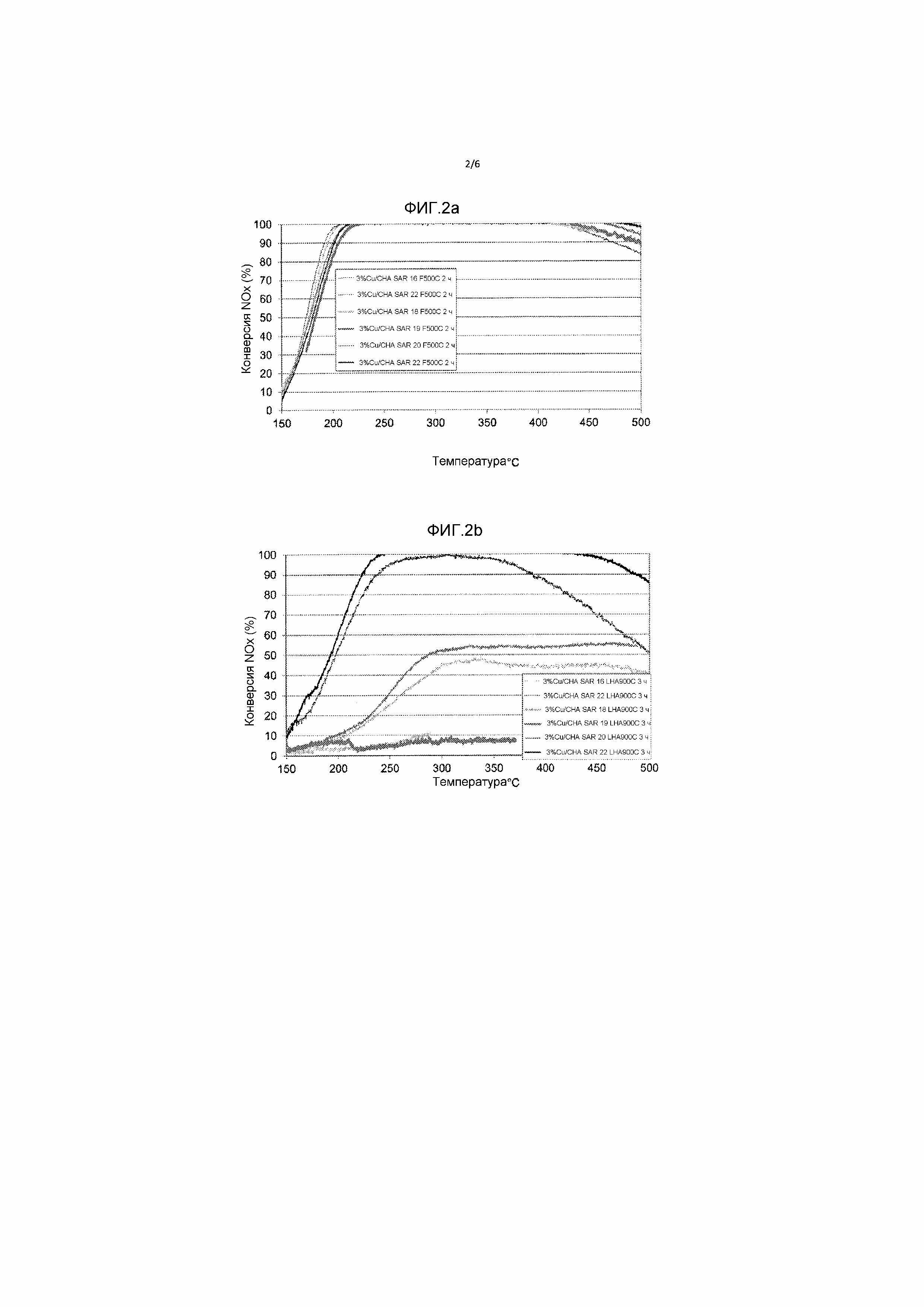 УРОВЕНЬ ТЕХНИКИ Область техники, к которой относится изобретение Данное изобретение относится к катализаторам, изделиям и способам обработки выхлопных газов от сгорания. Описание предшествующего уровня техники Сжигание углеводородного топлива на электростанциях и в двигателях производит топочные или выхлопные газы, которые содержат, в основном, сравнительно безвредные азот (N2), водяной пар (H2O) и диоксид углерода (CO2). Однако топочные и выхлопные газы также содержат, в качестве сравнительно небольшой части, вредные и/или токсичные вещества, такие как монооксид углерода (CO) от неполного сгорания, углеводороды (HC) от несгоревшего топлива, оксиды азота (NOx) от чрезмерных температур сгорания и твердые частицы (главным образом сажи). Для того, чтобы уменьшить воздействие на окружающую среду топочных и выхлопных газов, высвобождаемых в атмосферу, желательно исключить эти нежелательные компоненты или уменьшить их количество, предпочтительно способом, который, в свою очередь, не генерирует другие вредные или токсичные вещества. Обычно, топочные газы от электростанций и выхлопные газы двигателей, работающих на обедненных топливных смесях, обладают результирующим окислительным эффектом вследствие высокой доли кислорода, который предоставляют, чтобы обеспечить достаточное сгорание углеводородного топлива. В таких газах, одним из наиболее обременительных для удаления компонентов является NOx, который включает оксид азота (NO), диоксид азота (NO2) и закись азота (N2O). Восстановление NOx до N2 является особенно проблематичным, поскольку выхлопные газы содержат достаточно кислорода, чтобы способствовать окислительным реакциям вместо восстановления. Тем не менее, NOx может быть восстановлен посредством способа, известного как селективное каталитическое восстановление (SCR). Способ селективного каталитического восстановления (SCR) включает конверсию NOx, в присутствии катализатора и с помощью восстановителя, такого как аммоний, в элементарный азот (N2) и воду. В способе селективного каталитического восстановления (SCR), газообразный восстановитель, такой как аммиак, добавляют к потоку выхлопных газов перед контактированием выхлопных газов с катализатором селективного каталитического восстановления (SCR). Восстановитель абсорбируется на катализаторе, и реакция восстановления NOx протекает, когда газы проходят через катализированную основу или над ней. Химические уравнения для реакций стехиометрического селективного каталитического восстановления (SCR) с применением аммиака следующие: 4NO + 4NH3 + O2 → 4N2 + 6H2O 2NO2 + 4NH3 + O2 → 3N2 + 6H2O NO + NO2 + 2NH3 → 2N2 + 3H2O Цеолиты (т.е. алюмосиликаты), имеющие BEA, MOR, CHA или определенные другие структуры, известны как применимые в качестве катализаторов селективного каталитического восстановления (SCR). Такие цеолиты имеют молекулярно-пористую кристаллическую или псевдокристаллическую структуру, созданную в основном глиноземом и кремнеземом. Каталитическая эффективность этих цеолитов может быть улучшена посредством включения металла, например, посредством катионного обмена, в котором часть ионных компонентов, находящихся на поверхности каркасной структуры, заменяют катионами металла, такими как Cu2+. Обычно, более высокие концентрации металла соответствуют более высокой каталитической эффективности. Наряду с тем, что эффе
