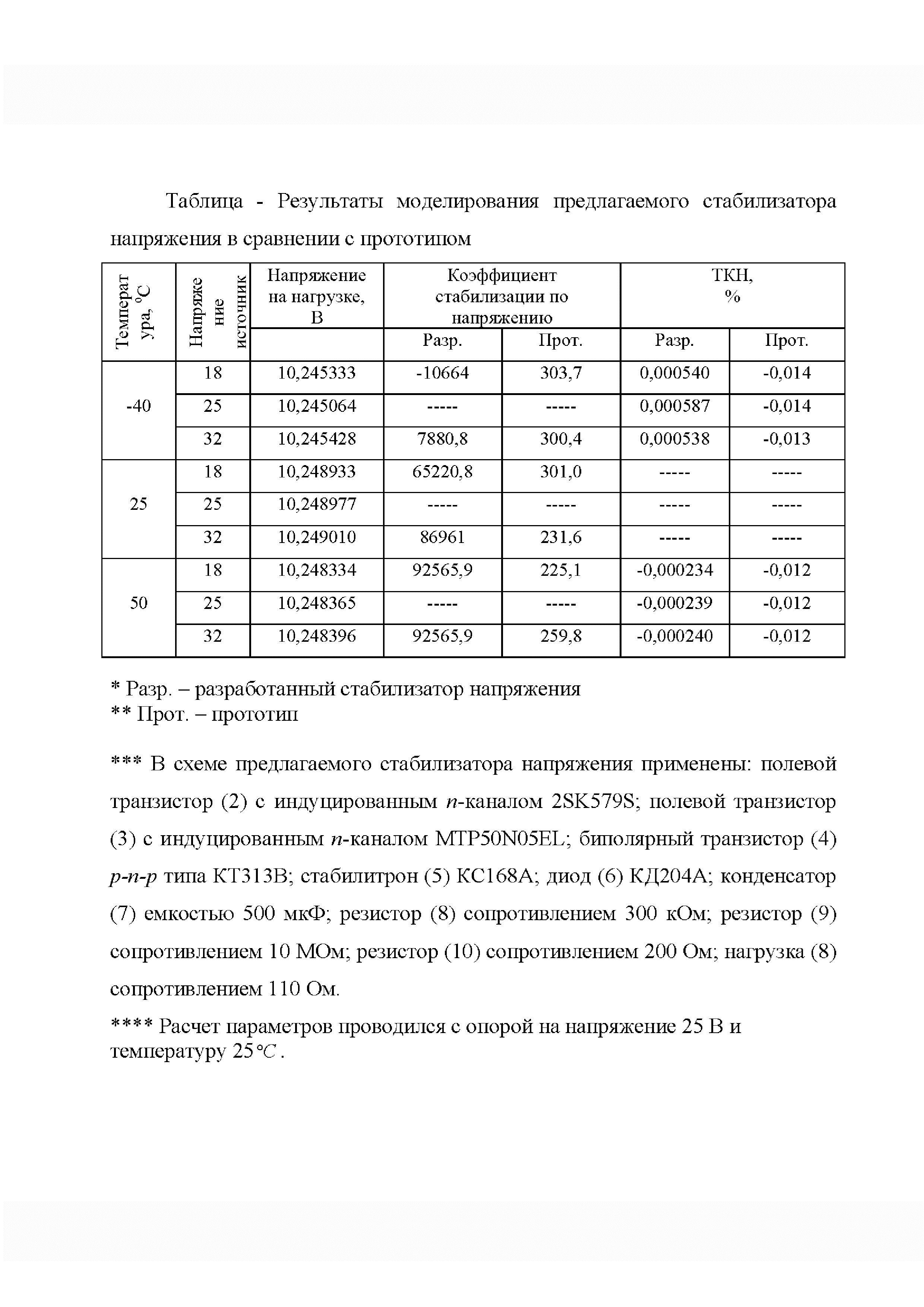 Область техники, к которой относится изобретение Изобретение относится к области радиоэлектроники и может быть использовано в качестве стабилизатора напряжения питания различных электронных устройств. Уровень техники Известен стабилизатор постоянного напряжения [SU АС № 1129594. Стабилизатор постоянного напряжения], содержащий включенный в силовую цепь регулирующий транзистор, узел обратной связи, входы которого подключены к выходному выводу и общей шине, а выход к базе регулирующего транзистора и через регулируемый двухполюсник к входному выводу, причем регулируемый двухполюсник выполнен в виде параллельно соединенных потенциометра и λ-транзистора, состоящего из двух включенных последовательно полевых транзисторов разного типа проводимости, при этом сток первого транзистора подключен к входному выводу, затвор первого транзистора соединен со стоком второго транзистора и базой регулирующего транзистора, затвор второго транзистора является управляющим выводом λ-транзистора и подключен к средней точке потенциометра, крайние выводы которого подключены между входным выводом и базой регулирующего транзистора. Недостатком данного устройства является значительная сложность схемной реализации. Известен стабилизатор напряжения питания электронных схем (патент RU № 2727713, МПК G05F 3/16). Стабилизатор напряжения питания электронных схем содержит: регулирующий биполярный транзистор Недостатком данного устройства являются ограниченные функциональные возможности, обусловленные: - низким коэффициентом стабилизации по напряжению; - низким температурным коэффициентом напряжения; - отсутствием самозащиты от перегрузки. Наиболее близким аналогом-прототипом к заявляемому техническому решению является стабилизатор напряжения питания электронных схем (патент RU № 2755670, МПК G05F 1/565). Стабилизатор напряжения питания электронных схем содержит: нестабильный источник напряжения; полевой транзистор с Недостатком данного устройства являются ограниченные функциональные возможности, обусловленные: - низким коэффициентом стабилизации по напряжению; - низким температурным коэффициентом напряжения; - отсутствием самозащиты от перегрузки. Раскрытие изобретения Технический результат, который может быть достигнут с помощью предлагаемого изобретения, сводится к расширению функциональных возможностей. Технический результат достигается тем, что в стабилизатор напряжения питания электронных схем, содержащий: нестабильный источник напряжения; полевой транзистор с индуцированным Краткое описание чертежей На фиг.1 представлена функциональная схема стабилизатора напряжения питания электронных схем. На фиг.2 представлены результаты схемотехнического моделирования - зависимость напряжения обратной связи от изменения температурного режима работы устройства ( На фиг.3 представлены результаты схемотехнического моделирования - зависимость усиленного напряжения обратной связи от изменения температурного режима работы устройства ( На фиг.4 представлены результаты схемотехнического моделирования - зависимость выходного напряжения стабилизатора от изменения температурного режима работы устройства ( На фиг.5 представлены результаты схемотехнического моделирования - зависимость выходного напряжения стабилизатора от изменения те