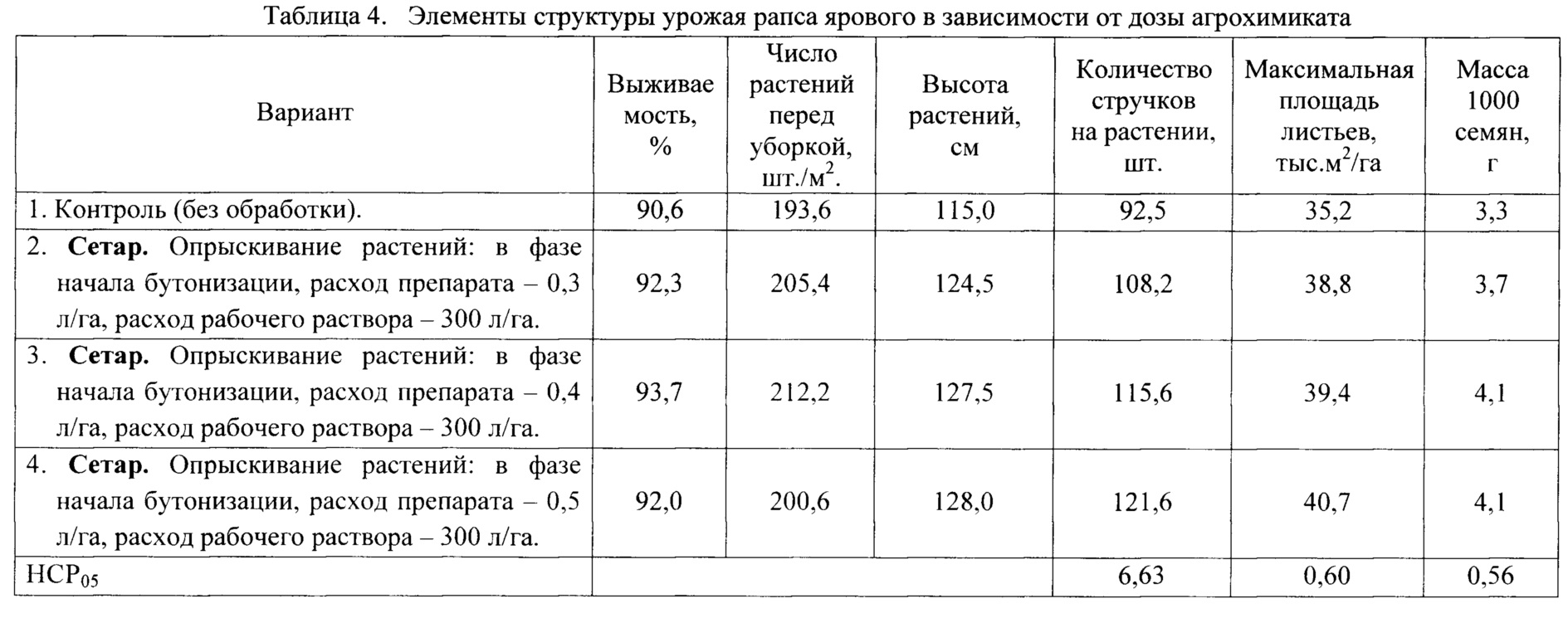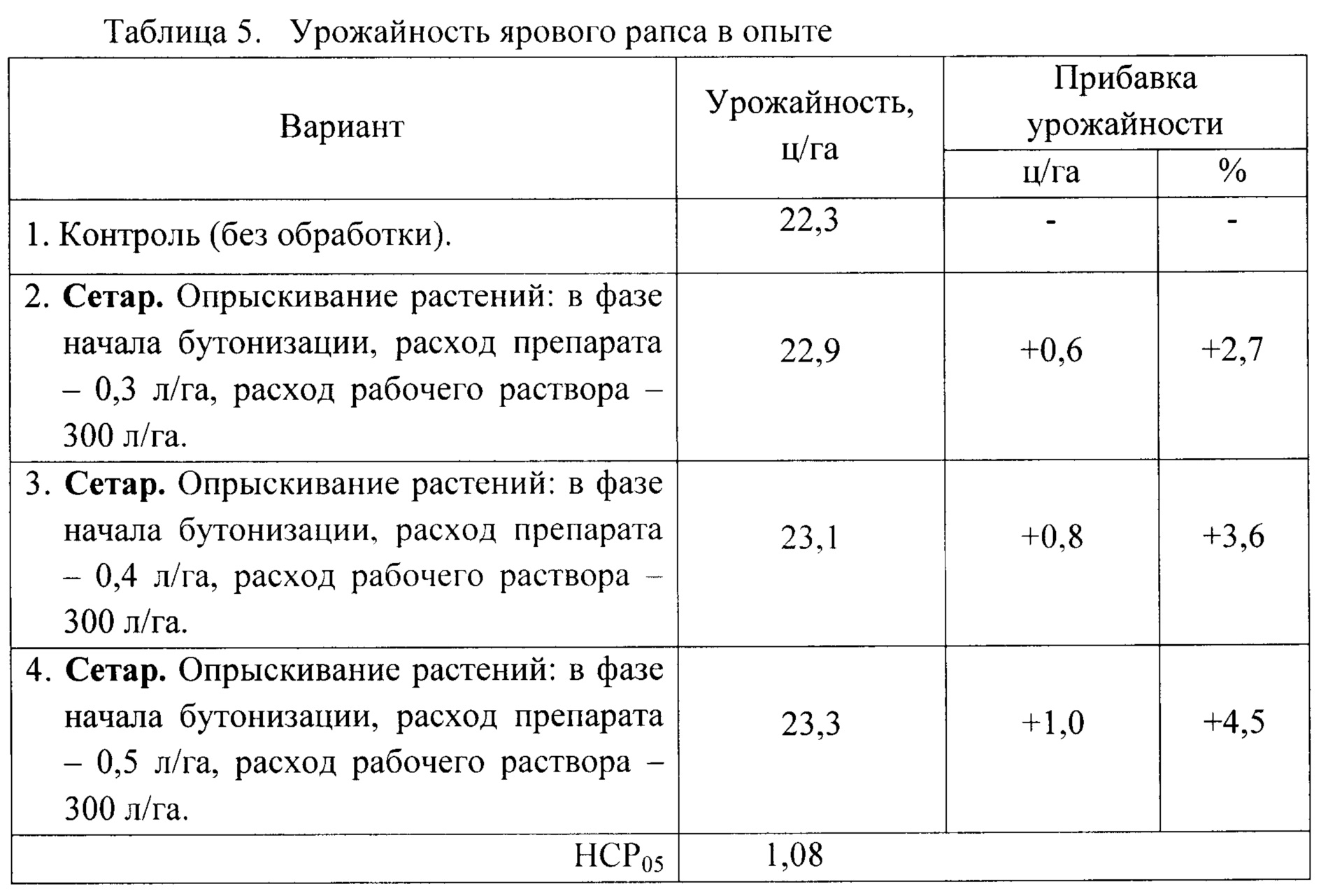 Изобретение относится к сельскому хозяйству и предназначено для повышения урожайности в ядрах масличных культур, в частности рапса. Опытной агротехнологической станции ФГБОУ ВО РГАТУ проведены испытания регистрационного агрохимиката (препарата) Сетар на рапсе яровом. Рапс - растение длинного светового дня, чувствителен к его долготе. Увеличивающемся продолжительностью дня (более 14 ч) ведет к ускорению прохождения фенологических фаз, формированию меньшего количества вегетативной массы и, как следствие, к сокращение потенциала урожайности. Лучшие почвы для рапса - плодородные с тяжелым механическим составом. Основные предшественники в России являются зерновые культуры. Чтобы избежать накопление возбудителей болезней, вредителей и семян крестоцветных сорняков, необходимо выдержать фитосанитарную паузу. В севообороте доля рапса и пораженных болезнями рапс культур (горчица, масленичная редька, сурепица и др.) не должно превышать 25%. Это означает, что возделывание этих культур на одном и том же участке возможно не чаще, чем через три-четыре года. Конечно же, лучшим предшественником для рапса, как и для многих других культур, является чистый пар. Качественный поев рапса - это основной прием агротехники, во время которого закладывается будущий урожай. Среди средств, направленных на повышение продуктивности агрокультур, очень перспективными являются испытания новых агрохимикатов (препаратов), например Сетар на рапсе яровом, состоящим из фунгицида и регулятора роста растений (ниже будет дана характеристика препарата). При нанесении этого стимулятора на вегетирующие растения, иногда в весьма малых дозах, они способны сильно влиять на физиологические процессы роста и развития растения. Это может проявляться в увеличение урожайности, в устойчивости к болезням растений (Применение регуляторов роста в растениеводстве. Справочник. Кмшинев. Штиница, 1981, с. 8; Муроманцев Г.С., Агнистова В.Н. Гормоны роста-гиббереллины. - М.: Наука, 1973, с. 254; Л.Д. Никелл. Регуляторы роста растений - применение в сельском хозяйстве - М.: Колос, 1984, с. 192; Авторское свидетельство SU №1600653, A01G 31/00, 1990). Известен способ повышения урожайности подсолнечника, предусматривающий обработку вегетирующих растений, 2,4,5 - тетрахлор-3-(N-бензил) - пиридинкарбомидом в количестве 200 г/га (Патент RU №2298322, A01N 43/40, А01Р 21/00 от 10.05.2007). Предлагаемый способ позволяет на прорастание семян влиять на рострегулирующую активность и обеспечивает прибавку урожая подсолнечника. Недостатком этого способа является то, что эффект ограничен активностью увеличению длины стебля и корня семян на всхожесть, без явного воздействия а дальнейшие развитие растений и их урожай. Известен способ выращивания рапса ярового на корм, включающий подготовку почвы и семян, посев, уход за посевами и уборку. Посев семян проводят в период массового развития крестоцветных сорняков и отмирания первой волны, перезимовавших крестоцветных блошек Phyllotreta SPP (Патент RU №2244415, A01G 1/00, А01В 79/00 от 20.01.2005). Предлагаемый способ проводился для Свердловской области и, в основном рассматривался для стабильного выращивания рапса ярового как полукосной культуры в кормовом севообороте без применения химических средств защиты растений при посеве рапса в указанные сроки и по предложенной обработке почвы, как получение корма и длительной 