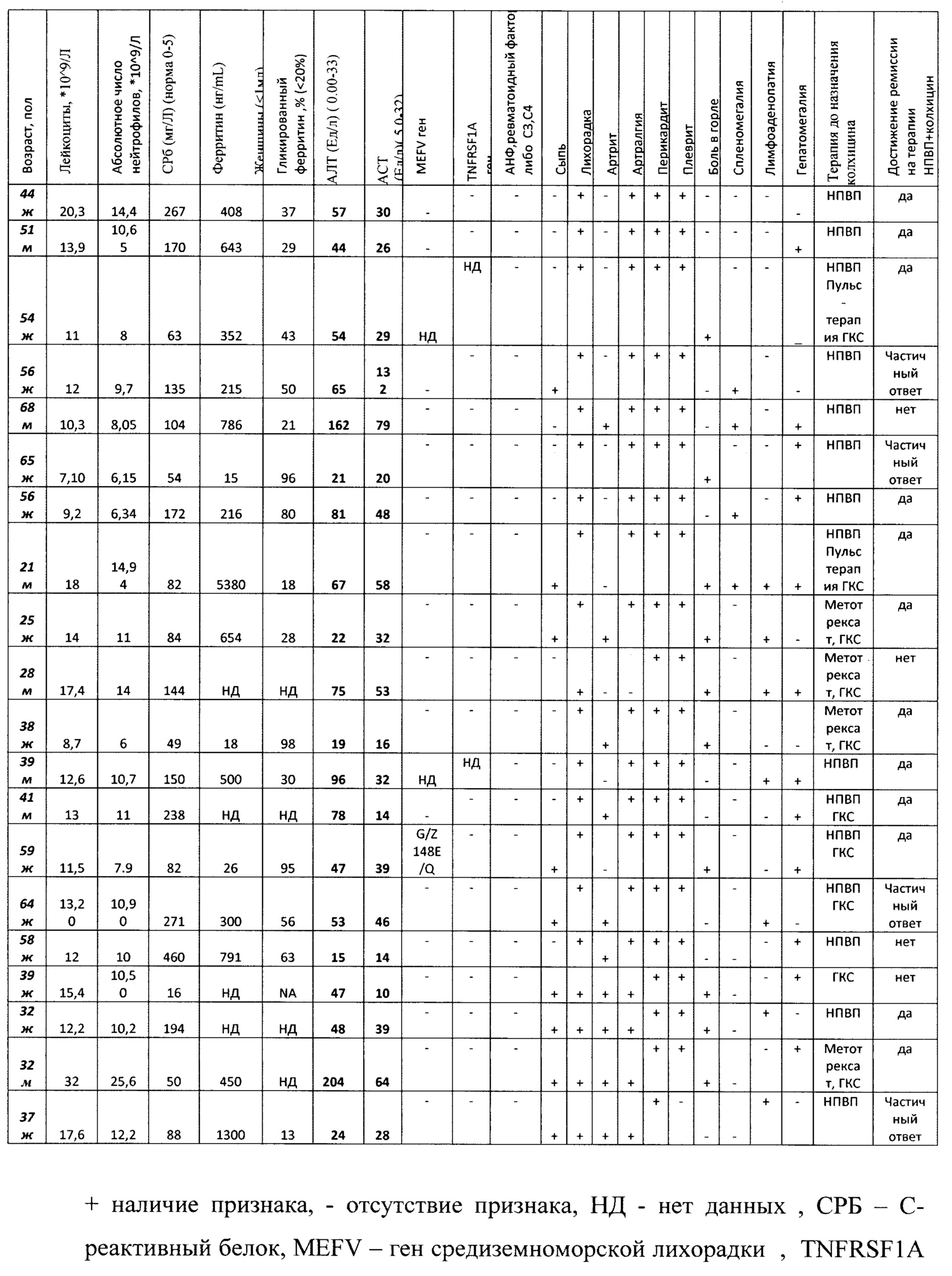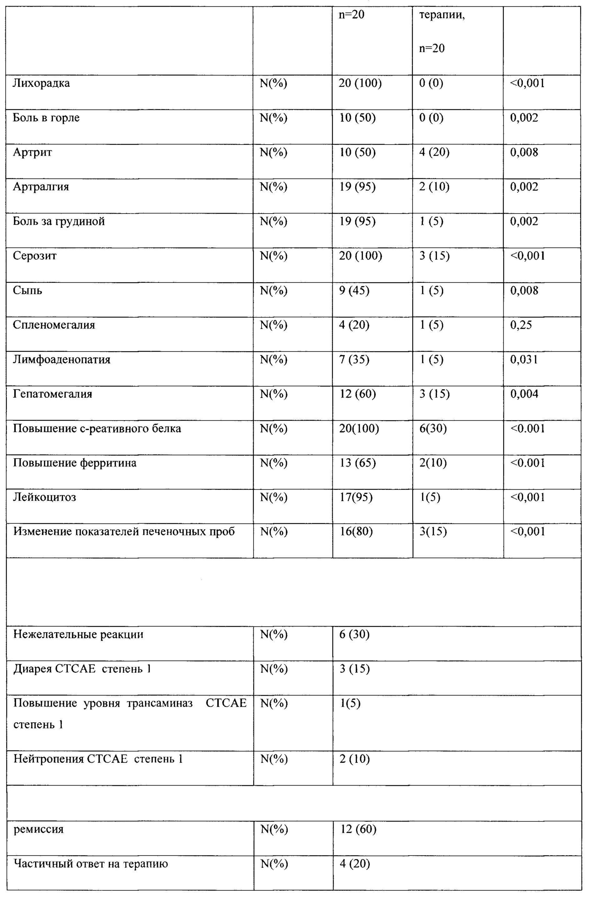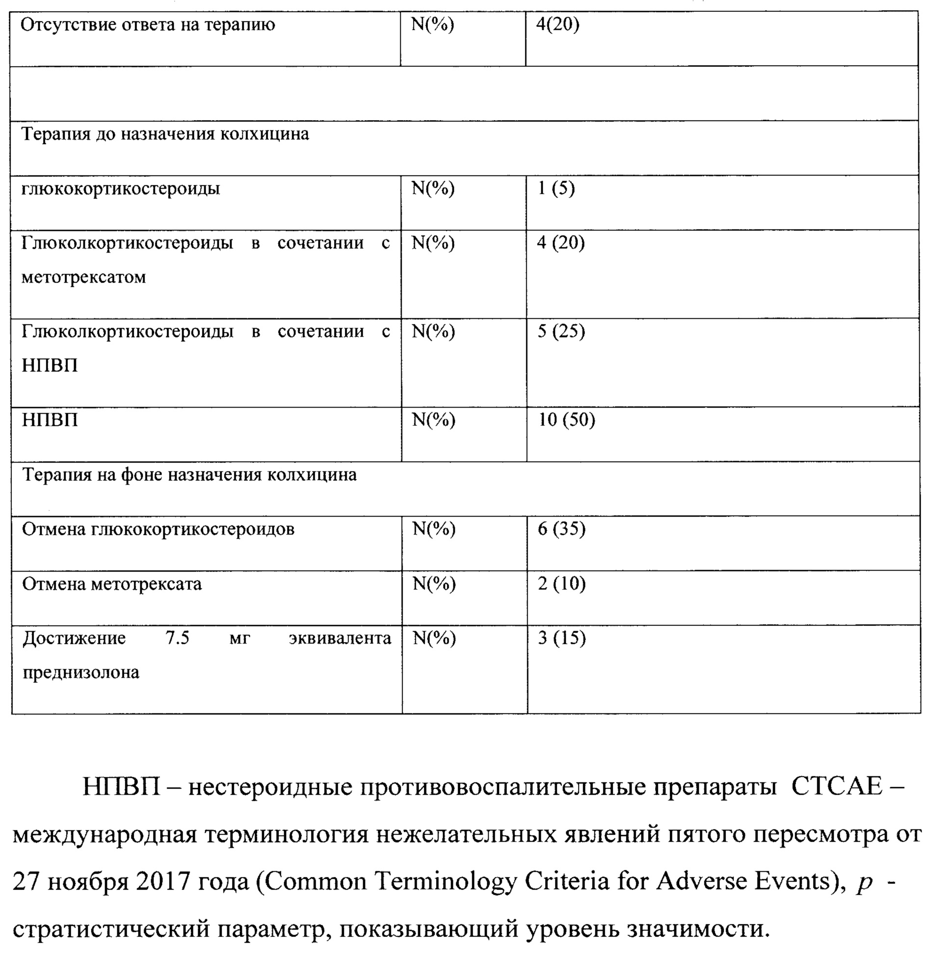 Изобретение относится к медицине, а именно к ревматологии, и может быть использовано в лечении системной формы болезни Стилла взрослых (БСВ) и его детского эквивалента ювенильного артрита с системным началом. Терапевтические рекомендации по болезни Стилла взрослых в настоящее время окончательно не разработаны и не базируются на данных рандомизированных контролируемых исследований [Hashkes PJ, Laxer RM, Simon A, Textbook of autoinflammation. Switzerland, Springer Nature, 2019.820p. https://doi.org/10.1007/978-3-319-98605-0]. Некоторыми авторами нестероидные противовоспалительные препараты (НПВП) рекомендованы при не тяжелых вариантах БСВ и в качестве 1 линии. Использование глюкокортикостероидов (ГКС) является общепринятым подходом в терапии БСВ [Feist Е, Mitrovic S, Fautrel В. Mechanisms, biomarkers and targets for adult-onset Still's disease. Nat Rev Rheumatol. 2018 Oct; 14(10):603-618. doi: 10.1038/s41584-018-0081-х. PMID: 30218025; PMCID: PMC7097309.]. Всеми авторами разделяется точка зрения 0 возможности быстрого снижения активности заболевания на фоне системного введения средних (25-60 мг), или высоких (80-200 мг) доз ГКС, однако, во многих случаях, при снижении доз до приемлемых - низких (до 10 мг), отмечается нарастание активности заболевания, формируется стероидзависимость и стероидрезистентность. В качестве стероидсберегающего препарата широко используется метотрексат. Его использование с данной целью описано в ряде клинических случаев, однако рандомизированных клинических исследований не проводилось. Последнее время появляется все больше данных об эффективности генно-инженерных препаратов, блокирующих такие цитокины, как IL-1, [Giacomelli R, Sota J, Ruscitti P, Campochiaro C, Colafrancesco S, Dagna L, Iacono D, Iannone F, Lopalco G, Sfriso P, Cantarini L. The treatment of adult-onset Still's disease with anakinra, a recombinant human IL-1 receptor antagonist: a systematic review of literature. Clin Exp Rheumatol. 2021 Jan-Feb; 39(1): 187-195. Epub 2020 May 12. PMID: 32452353.], Il-6 [Kawaguchi H, Tsuboi H, Yagishita M, Terasaki T, Terasaki M, Shimizu M, Honda F, Ohyama A, Takahashi H, Miki H, Yokosawa M, Asashima H, Hagiwara S, Kondo Y, Matsumoto I, Sumida T. Severe Adult-onset Still Disease with Constrictive Pericarditis and Pleuritis That Was Successfully Treated with Tocilizumab in Addition to Corticosteroids and Cyclosporin A. Intern Med. 2018 Apr 1; 57(7):1033-1038. doi: 10.2169/internalmedicine.9809-17. Epub 2017 Dec 21. PMID: 29269680; PMCID: PMC5919867.]. Как блокатор интерлейкина-1 [Kedor С, Listing J, Zernicke J, Эффективной базисной противовоспалительной терапии, как было описано выше, при болезни Стилла взрослых нет. Применение колхицина в качестве базисного препарата позволяет не только снизить экономическую нагрузку и отсрочить назначение генно-инженерных биологических препаратов, стоимость которых крайне высока, но также позволяет в 60% случаев избежать назначения цитостатиков, глюкокортикостероидов, имеющих большой спектр нежелательных явлений [Oray М, Abu Samra K, Ebrahimiadib N, Meese H, Foster CS. Long-term side effects of glucocorticoids. Expert Opin Drug Saf. 2016; 15(4):457-65. doi: 10.1517/14740338.2016.1140743. Epub 2016 Feb 6. PMID: 26789102]. Прототипом назначения данной терапии послужило его эффективное применение при схожем заболевании - идиопатической рецидивирующем перикардите (ИРП), где пройдены необходимые этапы верификации эффективности терапии - клинические исследования [Imazio М, Brucato А, Cemin R, Ferrua S, Belli R, Maestroni S, Trinchero R, Spodick DH, Adler Y; CORP (Colchicine for Recurrent Pericarditis) Investigators. Colchicine for recurrent pericarditis (CORP): a randomized trial. Ann Intern Med. 2011 Oct 4; 155(7):409-14. doi: 10.7326/0003-4819-155-7-201110040-00359. Epub 2011 Aug 28. PMID: 21873705] [Imazio M, Belli R, Brucato A, Cemin R, Ferrua S, Beqaraj F, Demarie D, Ferro S, Forno D, Maestroni S, Cumetti D, Varbella F, Trinchero R, Spodick DH, Adler Y. Efficacy and safety of colchicine for treatment of multiple recurrences of pericarditis (CORP-2): a multicentre, double-blind, placebo-controlled, randomised trial. Lancet. 2014] и препарат успешно вошел в как международные [Adler Y, Charron Р, Imazio М, et al. 
