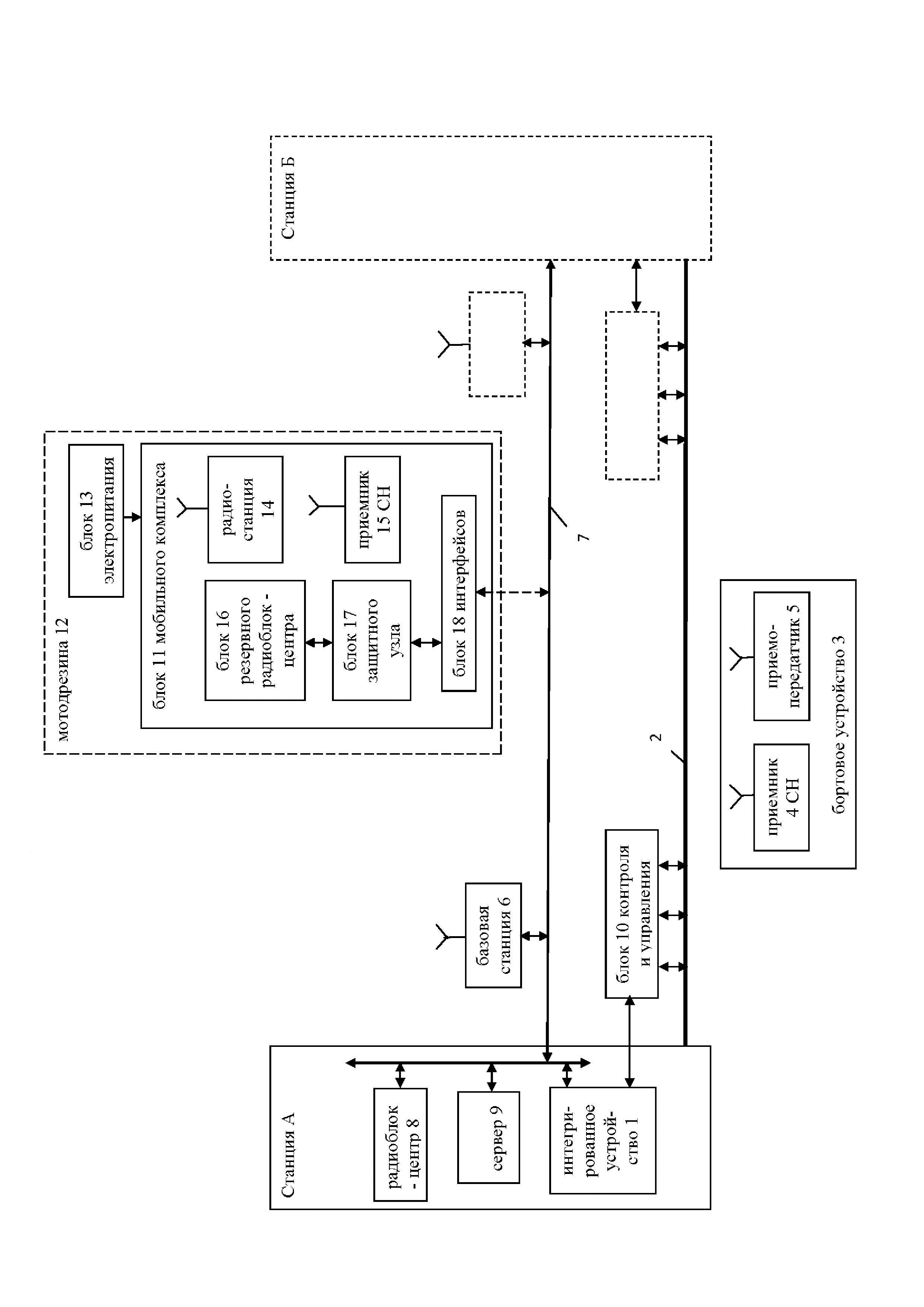 Изобретение относится к средствам интервального регулирования движения, в частности к мобильным средствам резервирования комплекта аппаратуры радиоблокировки. Система содержит размещенные на посту электрической централизации каждой станции интегрированные устройства микропроцессорной электрической централизации и автоблокировки со станционными и перегонными бесстыковыми рельсовыми цепями тональной частоты, а на локомотивах поездов - бортовые устройства автоматического управления движением поездов с приемником спутниковой навигации и приемопередатчиком мобильной радиосвязи, причем бортовые устройства автоматического управления движением поездов связанны с интегрированными устройствами микропроцессорной электрической централизации и автоблокировки через телемеханические каналы передачи информации по бесстыковым рельсовым цепям тональной частоты и через цифровые радиоканалы мобильной радиосвязи, при этом базовые станции мобильной радиосвязи подключены к железнодорожной сети передачи данных для диспетчерского контроля и управления движением поездов, к которой подсоединены интегрированные устройства микропроцессорной электрической централизации и автоблокировки, радиоблок-центры зонального управления движением поездов и серверы мобильной радиосвязи, при этом блоки контроля и управления соответствующими рельсовыми цепями конструктивно объединены с соответствующими устройствами микропроцессорной электрической централизации и автоблокировки и соединены первыми локальными проводными сетями с группами ближайших к этим устройствам соответствующих рельсовых цепей. Система так же снабжена блоком мобильного комплекса резервного комплекта аппаратуры радиоблокировки, который размещен на мотодрезине с автономным блоком электропитания, подключенным к цепям электропитания блока мобильного комплекса резервного комплекта аппаратуры радиоблокировки, включающего радиостанцию руководителя ремонтных работ, приемник спутниковой навигации и блок резервного радиоблок-центра зонального управления движением поездов, порт данных которого через блок защитного узла межсетевого взаимодействия соединен с блоком интерфейсов подключения к различным типам точек проводного и беспроводного доступа к железнодорожной сети передачи данных. Достигается повышение надежности работы и снижении задержек поездов при отказах устройств радиоблокировки. 1 ил.