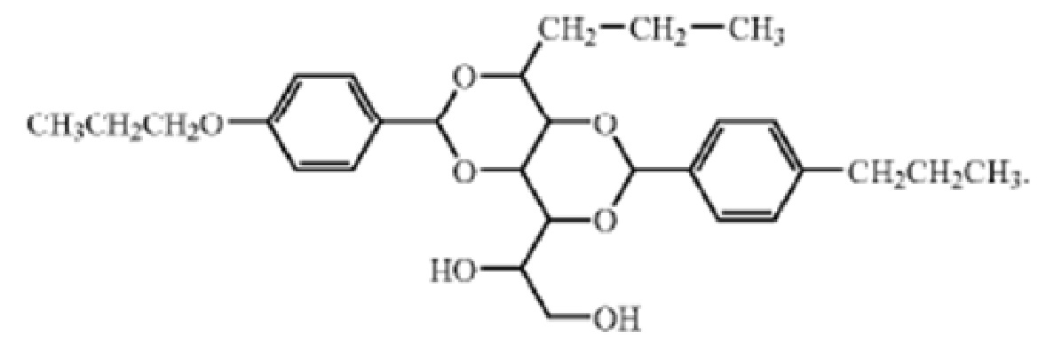 [0016] В одном варианте осуществления модификатор прочности расплава может содержать производное бензилиденсорбита. Примеры модификаторов прочности расплава включают, например, 1,3:2,4-бис(3,4-диметилдибензилиден)сорбит, 1,2,3- тридезокси-4,6:5,7-бис-O-[(4-пропилфенил)метилен]нонитол, 1,3:2,4-бис(п-нитробензилиден)сорбит, (1,3-2,4-дибензилиденсорбит), 1,3-2,4-бис(п-метоксибензилиден)сорбит, 1,3:2,4-бис(м-метоксибензилиден)сорбит, 1,3:2,4-бис(п-хлорбензилиден)сорбит, 1,3:2,4-бис(п-метилбензилиден)сорбит или их смеси. Модификатор прочности расплава в одном варианте осуществления может присутствовать в полимерной композиции в количестве, по существу превышающем около 0,6% по массе, например, в количестве превышающем около 0,8% по массе, например, в количестве превышающем около 1% по массе, например, в количестве превышающем около 1,2% по массе, например, в количестве превышающем около 1,4% по массе, например, в количестве превышающем около 1,6% по массе, например, в количестве превышающем около 1,8% по массе, например, в количестве превышающем около 2% по массе. Модификатор прочности расплава обычно присутствует в полимерной композиции в количестве менее около 10% по массе, например, в количестве менее около 5% по массе, например, в количестве менее около 4% по массе.