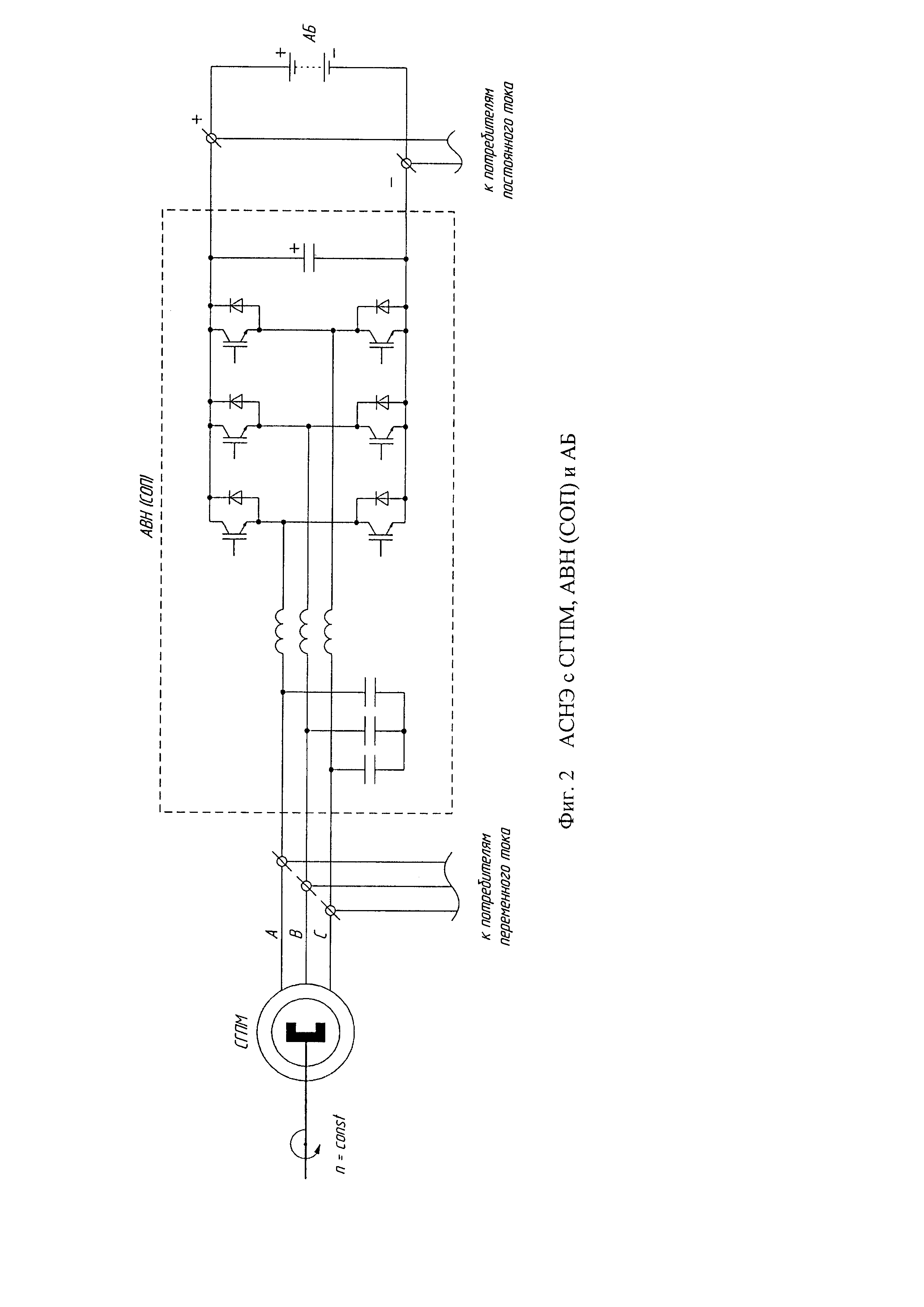 Изобретение относится к области электротехники, а именно к автономным системам надежного электроснабжения (АСНЭ), содержащим в своем составе основной источник электропитания - трехфазный синхронный генератор с постоянными магнитами (СГПМ), приводимый во вращение движителем с постоянной частотой вращения, резервный источник электропитания - аккумуляторную батарею (АБ) и устройство преобразования электроэнергии - статический обратимый преобразователь (СОП), который осуществляет двунаправленное преобразование электроэнергии от СГПМ к АБ и обратно. Особенностью СГПМ является нестабильность его выходного напряжения при изменении значения тока и коэффициента мощности нагрузки. С целью стабилизации напряжения СГПМ используются дополнительные устройства, которые осуществляют подмагничивание генератора. Такую функцию можно реализовать, в частности, с помощью активного выпрямителя напряжения (АВН). Принципиальная схема АВН, представленная, например, в [1], изображена на фиг. 1. Если к АВН со стороны переменного тока подключить трехфазный СГПМ, а со стороны постоянного тока - АБ, то посредством АВН может осуществляться двунаправленная передача энергии от сети переменного тока (СГПМ) к сети постоянного тока (АБ) и обратно, т.е. АВН будет являться СОП. Принципиальная схема АСНЭ, содержащая трехфазный СГПМ с постоянной частотой вращения n, АВН (СОП) и АБ, представлена на фиг. 2. На фиг. 2 основной сетью электропитания является трехфазная сеть переменного тока (А, В, С), а резервной сетью - сеть постоянного тока (+, -). При нормальной работе СГПМ и АБ устройство преобразования электроэнергии, работающее в качестве АВН, производит как заряд (подзаряд) АБ и питание потребителей постоянного тока резервной сети посредством регулирования и стабилизации напряжения постоянного тока на шинах +, -, так и стабилизацию напряжения СГПМ - напряжения основной сети переменного тока на шинах А, В, С. Данный режим СОП называется зарядным или выпрямительным. При выводе из работы основного источника электропитания (СГПМ) устройство преобразования электроэнергии осуществляет в режиме автономного инвертора напряжения питание потребителей основной сети переменного тока путем преобразования энергии от резервного источника электропитания (АБ) в трехфазное стабилизированное напряжение на шинах А, В, C: Данный режим СОП называется инверторным. При выводе из работы АБ устройство преобразования электроэнергии осуществляет стабилизацию напряжения СГПМ. Часть схемы фиг. 2, не содержащая АБ, представленная в [2], выбрана в качестве прототипа (фиг. 3). Данное решение позволяет стабилизировать выходное напряжение СГПМ при изменении тока и коэффициента мощности нагрузки [2]. Недостатком этой схемы при ее использовании в составе АСНЭ, содержащей АБ, является наличие гальванической связи между сетями переменного и постоянного тока и несогласованность значений напряжения в данных сетях. Для гальванической развязки и согласования значений напряжения сетей переменного и постоянного тока используют трансформатор с применением СОП (см., например, [3]). На фиг. 4 представлена принципиальная схема АСНЭ, содержащая СГПМ, АВН (СОП), АБ и трансформатор Т. В случае если потребители переменного тока используют стандартную частоту 50 Гц, СГПМ и Т также должны быть выполнены на часто