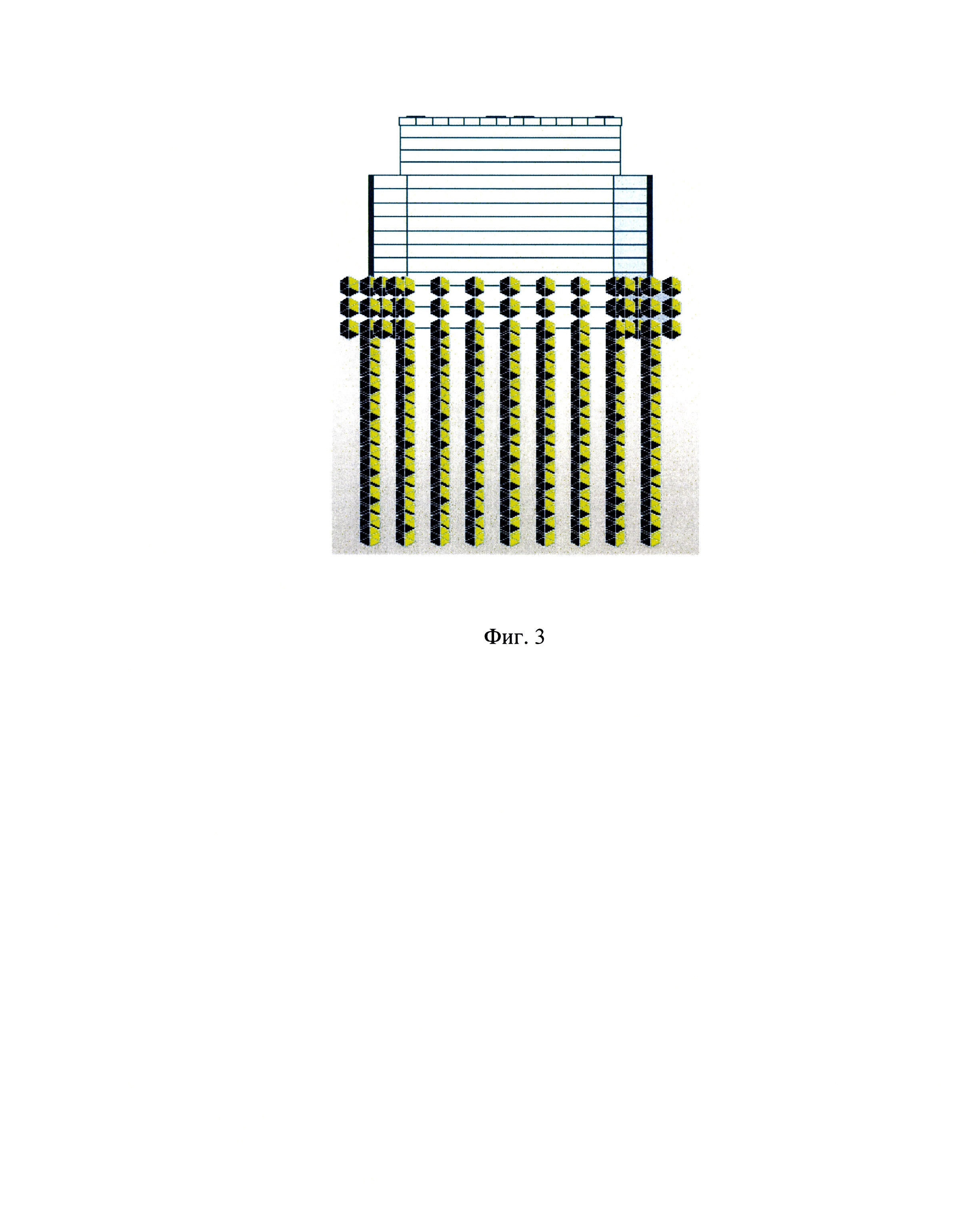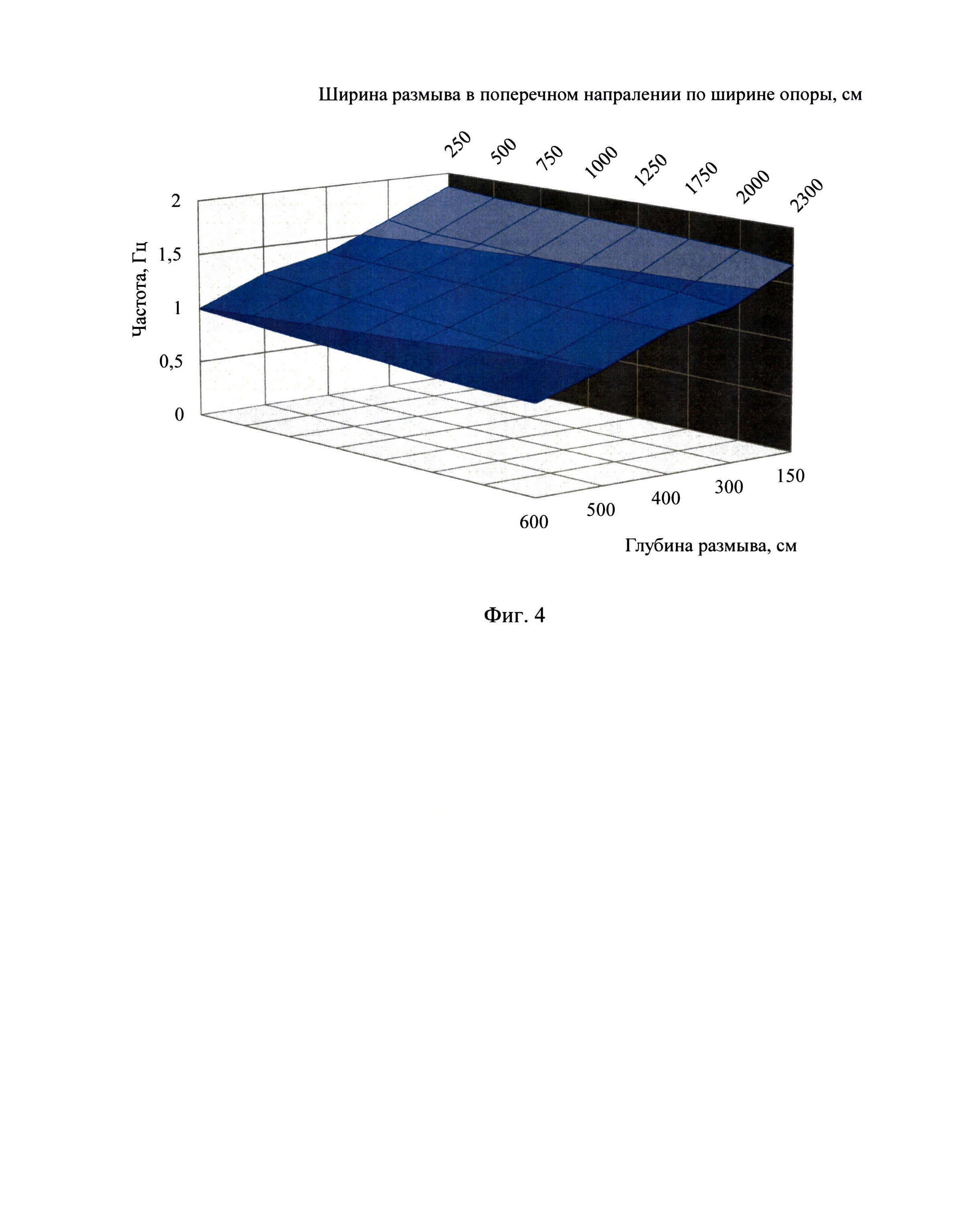 была создана конечно-элементная модель исследуемых опор (см. фиг. 3) и произведены расчеты первых частот собственных колебаний при моделировании различных ситуаций взаимодействия фундамента опоры с грунтом (различных значениях глубины h и ширины размыва b), результаты которых представлены в таблице 1. По результатам выполненных расчетов была получена поверхность изменения частоты свободных колебаний опоры от глубины и ширины размыва (см. фиг. 4).