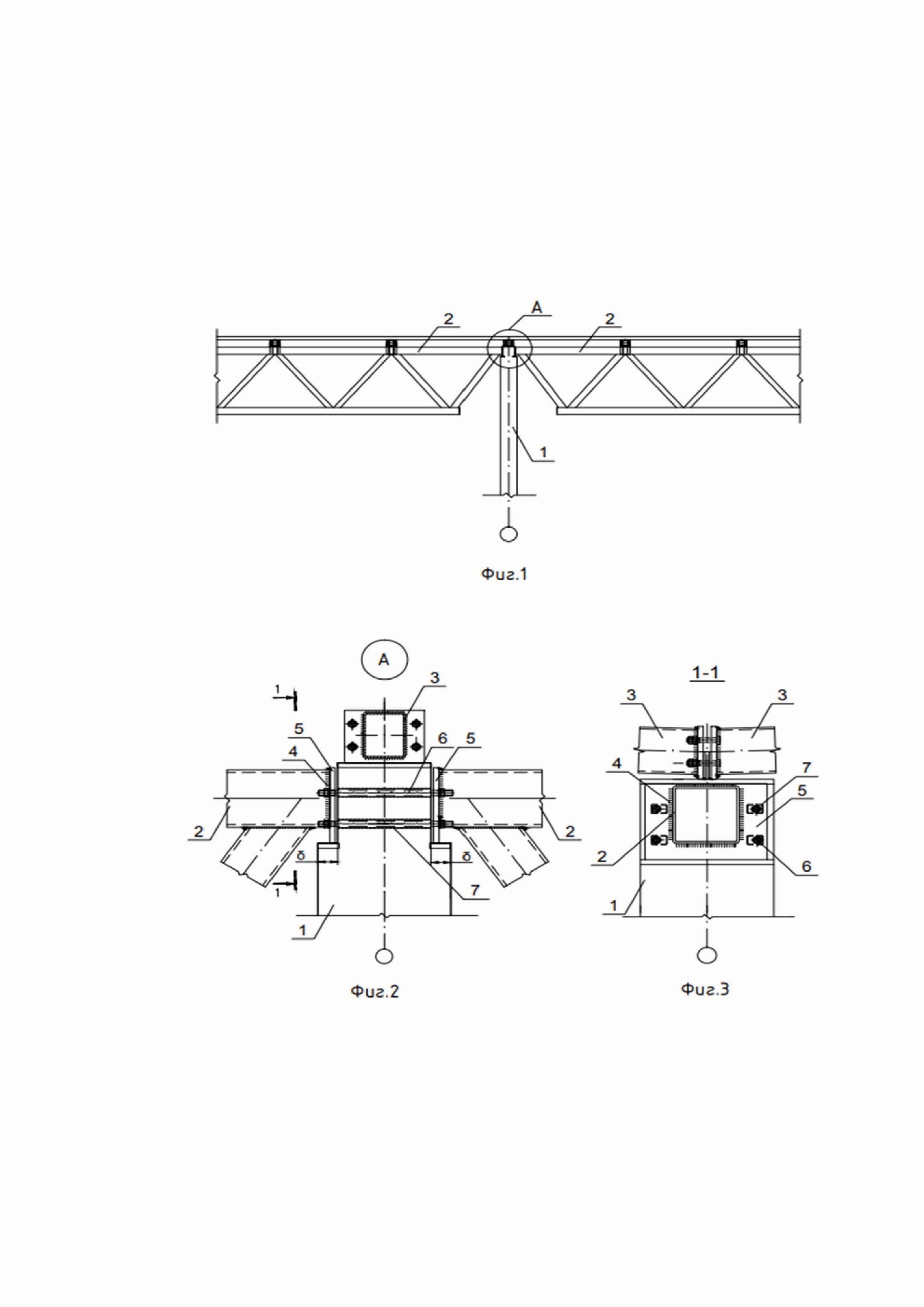 На Фиг. 1 показана железобетонная колонна, стальные подстропильные и стропильная фермы, где опорный узел выполнен по предложенному техническому решению;