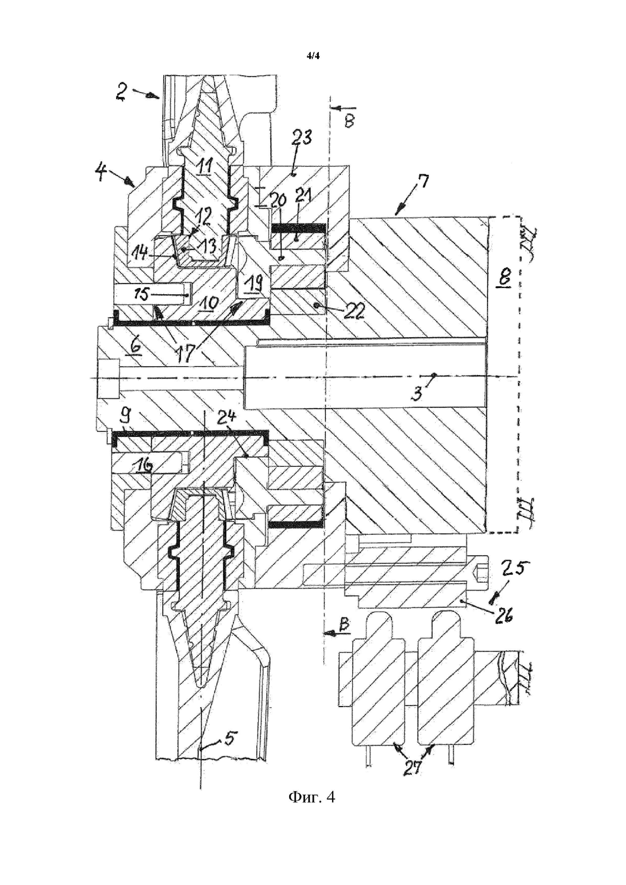 на фиг. 4 – увеличенный вид в разрезе, взятый по линии B–B, показывающий область ступицы с соединениями привода для приведения в действие ступицы и лопастей вентилятора, которые соответственно закреплены в ступице для регулировки углов лопастей вентилятора.