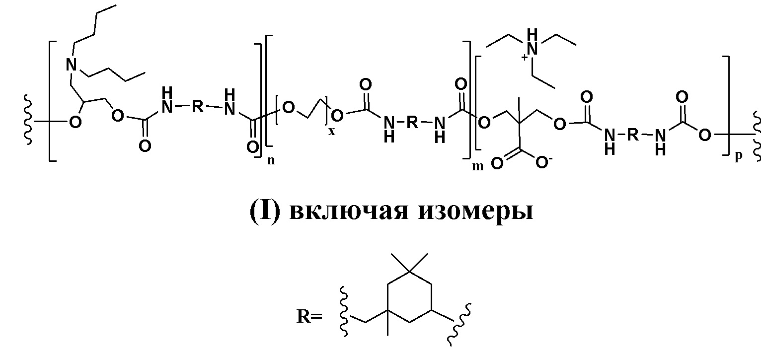 Изобретение относится к химии полимерных соединений, а именно - к ингибиторам гидратообразования и коррозии на основе полиуретанов общей формулы I (включая изомеры). где сумма n, m, x и p представляет собой число, достаточное для получения средней молекулярной массы 4 кДа (килодальтон). Данные соединения могут найти применение в нефтегазовой отрасли в процессах добычи, переработки и транспортировки углеводородного сырья для предотвращения коррозии и образования газовых гидратов - соединений, которые в процессе агломерации способны формировать гидратные пробки, препятствующие свободному потоку флюидов. В природном газе, газовом конденсате и нефти присутствуют такие соединения, как углеводороды алканового ряда С1-С4, диоксид углерода, сероводород, азот, которые при определенной температуре и давлении могут образовывать с водой соединения включения - газовые гидраты (клатраты). Газовые гидраты в процессе добычи и транспортировки углеводородов образуются при надлежащих термобарических условиях, например, в стволе скважин, трубопроводах и оборудовании при внедрении низкомолекулярных соединений в полости кристаллической решетки, формируемой молекулами воды посредством водородных связей. Данные образования в процессе агломерации формируют гидратные пробки, препятствующие свободному потоку флюидов, тем самым способствуя различного рода техногенным авариям. Помимо этого, сероводород и диоксид углерода в присутствии воды способны вызывать коррозию трубопровода или других контактных стальных элементов, используемых при добыче, транспортировке, хранении и переработке углеводородов, что снижает срок их (трубопроводов и др.) эксплуатации и также может приводить к авариям. Среди доступных методов предотвращения закупорки трубопроводов, таких как снижение давления, повышение температуры и дегидратация, химическая обработка ингибиторами является наиболее экономически эффективным методом [ Введение в поток большого количества нефтепромысловых реагентов требует более мощной инфраструктуры (дополнительные резервуары для хранения, инжекционные насосы и распределительные трубопроводы) и сложного процесса последующей регенерации введенных добавок [ Следует также отметить, что снижение количества используемых в области нефтехимии реагентов и их номенклатуры может благоприятно сказаться на окружающей среде и здоровье человека. Данный аспект на дату представления заявочных материалов также является актуальным. Таким образом, разработка эффективных нефтепромысловых реагентов двойного назначения - ингибиторов газовых гидратов и ингибиторов коррозии - представляется на сегодняшний день актуальным направлением развития нефтепромысловой химии. Получение соединений, обладающих комплексным действием, должно обеспечить возможность существенного снижения экономических затрат, направленных на обеспечение стабильности потока углеводородов, при этом такие соединения значительно расширяют арсенал средств указанного назначения. Следует иметь в виду, что ингибиторы гидратообразования применяют в концентрациях от 0.25% до 2% по массе от водной фазы, в то время как ингибиторы коррозии используются в меньших концентрациях. Однако принимая во внимание задачу заявленного технического решения - создание реагента именно б
