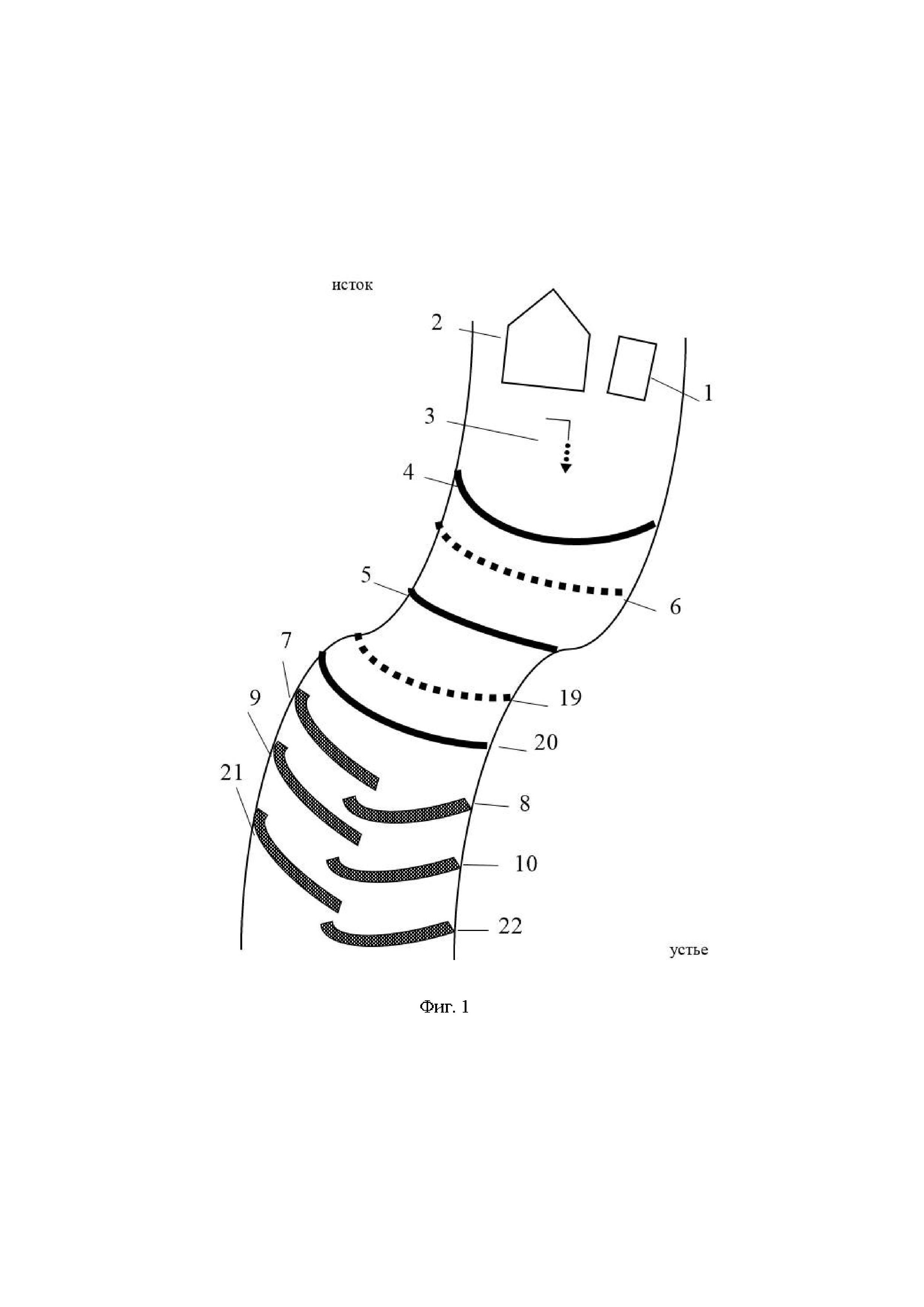 Изобретение относится к области охраны окружающей среды и предназначено для очистки природных и искусственных водотоков, дно которых загрязнено нефтью и нефтепродуктами. Способ очистки донных отложений и воды в водотоках от нефти и нефтепродуктов включает размыв донных отложений водовоздушной струей под давлением, поднятие нефти и нефтепродуктов на поверхность воды, применение боновых заграждений в области размыва донных отложений, сбор нефтяной пленки на поверхности воды, применение сорбирующих бонов, ниже области размыва донных отложений на поверхности водотока последовательно устанавливают диагонально, с полным перекрытием русла водотока, первый и второй ряды боновых заграждений, между которыми по дну водотока размещают диагонально, от берега до берега, средство для создания воздушно-пузырьковой завесы, ограничивая область очистки толщи воды; после второго ряда боновых заграждений, в области очистки поверхности воды от остаточных растворенных нефти и нефтепродуктов, устанавливают ряды сорбирующих бонов, каждый из которых поочередно закрепляют на противоположных берегах водотока, смещая относительно друг друга, с обязательным перекрытием предыдущего ряда, под острым углом к берегу водотока; перед размывом донных отложений создают воздушно-пузырьковую завесу, которой улавливают вторичные нефть и нефтепродукты, сбор нефтяной пленки и вторичной нефтяной пленки на поверхности воды осуществляют механическими орудиями для сбора нефти и нефтепродуктов. Технический результат изобретения - повышение эффективности очистки водотоков, путем одновременного снижения содержания нефти и нефтепродуктов в донных отложениях, толще воды и на поверхности воды. 2 з.п. ф-лы, 2 ил., 3 табл., 3 пр.