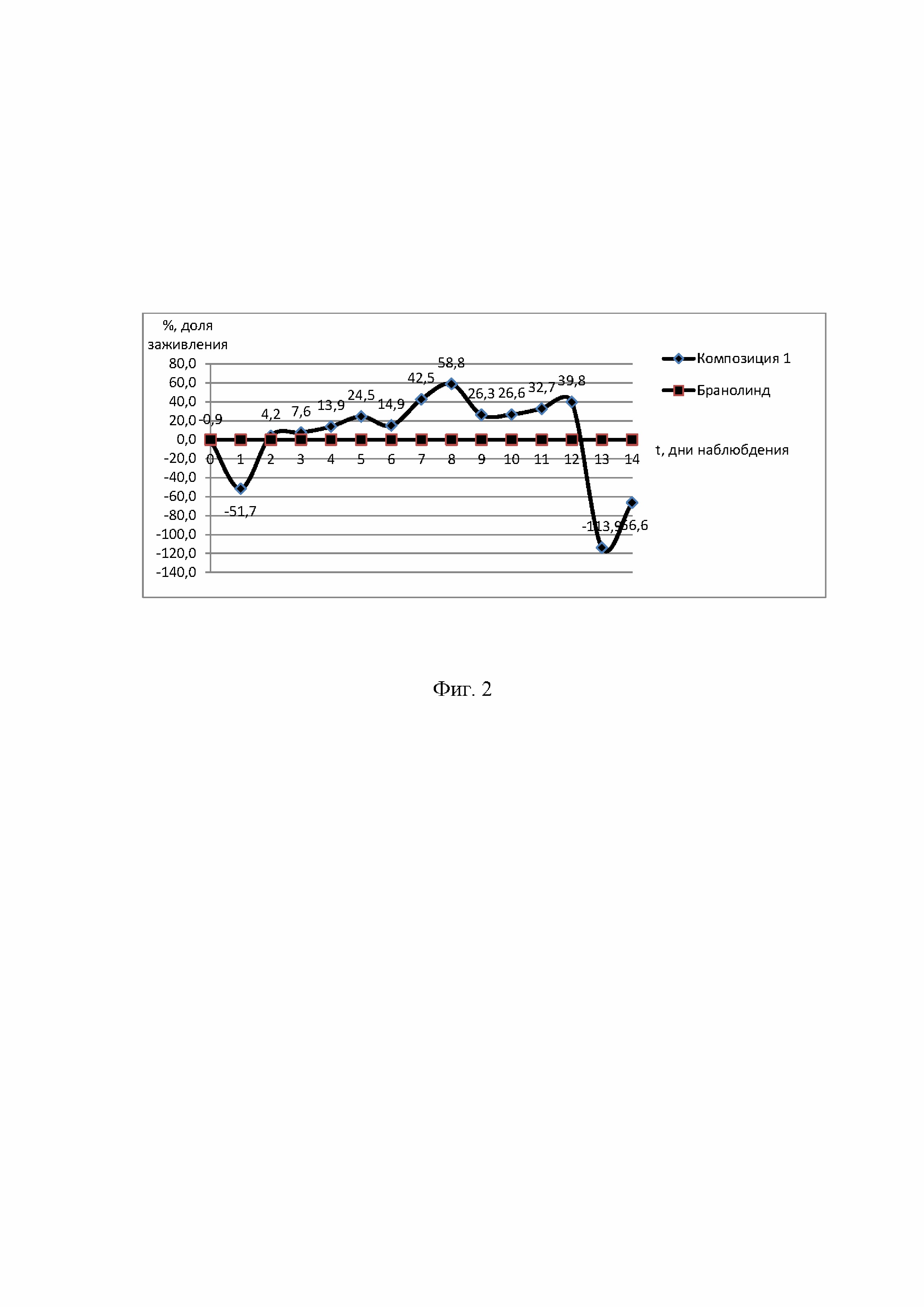 норма по ТУ 32.50.50-009-15886239-2021Антимикробная активность (зона задержки роста микрофлоры по St. epidermidis) не менее 2 мм рH водной вытяжки 6.0±1.0 Толщина сетки с мазью, мм от 0.5 до 1.0 мм Показатели Контроль Опытный образец Препарат сравнения «Левомеколь» Выраженность болевых ощущений в ране (спокойное поведение крыс) +++ ++++ ++++ Характер раневого отделяемого Гной, экссудат