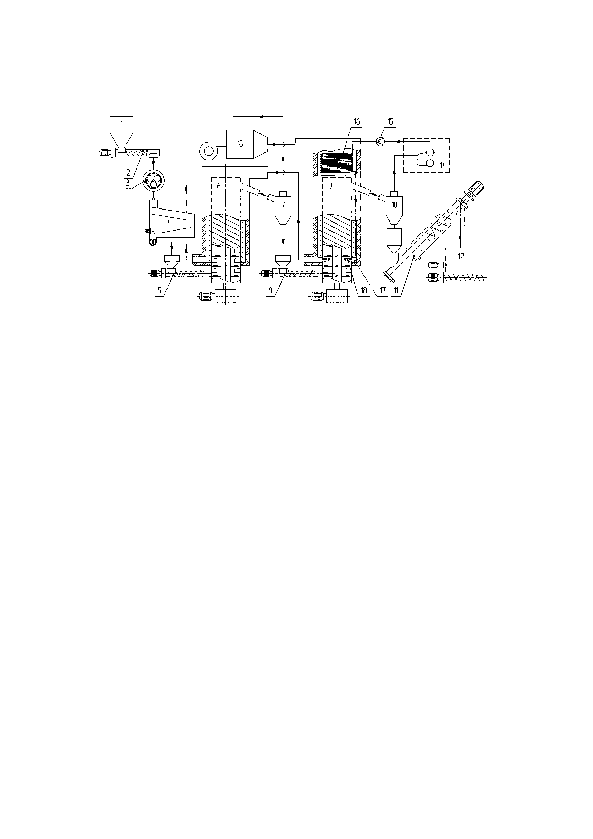 Изобретение относится к термическому способу переработки сыпучих органических отходов, таких как отходы зерноперерабатывающей промышленности (лузга гречихи, подсолнечника, риса, соломы и пр.) и лесной промышленности (древесных опилок) и получения активированного угля с увеличенной адсорбционной поверхностью. Все перечисленные материалы имеют схожий химический состав: лигнин 20-35%, целлюлоза 30-50%, поэтому способ и оборудование для переработки этих материалов в высокопрочные пеллеты будут идентичны. Так, из уровня техники известны способы и установки переработки органических веществ и отходов. Из описания к патенту RU 2749665 C1 (опубликован 16.06.2021) известен способ термической деструкции органических веществ и отходов, включающий этапы, на которых сырье размером фракции 1-5 мм и влажностью 4-12 % подают шнековым транспортером, снабженным частотным приводом, в вертикальный реактор, включающий корпус, прошитый металлическими пластинами, находящимися одновременно в контакте с дымовыми газами и с продуктами пиролиза, а также ротор с лопатками, размещенными с одинаковым шагом от нижних лопаток к верхним, посредством вращательного движения которых сырье перемещают снизу вверх, проходя через камеру, разогретую до 750-850°С, где сырье распадается на кокс и газовую составляющую. Далее кокс, смешанный с газом, перемещается в верхнюю часть реактора, разогретую до 980-1000°С и представляющую собой зону крекинга, время нахождения смеси в зоне крекинга от 0.5 до 1.5 секунд, после чего смесь газов по патрубку поступает на охлаждение и очистку перед дальнейшим использованием, кокс перемещается самотеком через выгрузное окно вниз по накопителю в шнековый спиральный транспортер, оборудованный водяной рубашкой и установленный под углом 45° к горизонту, откуда выгружается в накопительный бункер. Основными недостатками данного способа являются: - полученный кокс совершенно не пригоден для получения активированного угля из-за полного отсутствия в нем летучих веществ и спекания углерода, высокие температуры не позволяют при активации раскрыть поры; - для увеличения теплопередачи используются тепловые элементы, прошивающие корпус реактора и находящиеся одновременно в контакте с топочными газами и с обрабатываемым продуктом внутри реактора, позволяющие увеличить обе поверхности на 40%, при такой конструкции дальнейшее увеличение поверхности невозможно; - большие теплопотери и перерасход топлива из-за того, что дымовые газы двигаются сверху вниз, дельта температур газов на входе и выходе из печи не превышает 150°С. Также из описания к патенту RU 2721696 С1 (опубликован 21.05.2020) известен способ и установка получения активированного угля из угольного остатка, полученного после термохимического процесса пиролиза при переработке органического сырья в установке пиролиза. Способ переработки углеродного материала включает этапы, на которых посредством горизонтального шнека спирального типа подают углеродный материал на вход камеры активации с лопатками, перемещающими углеродный материал по зоне паровой активации, в которой под действием пара, подающегося форсунками в нижней части камеры паровой активации под давлением от 5 до 20 бар и с температурой 900-1000°С, и вращающегося ротора с лопатками углеродный материал перемещается к верхней части камеры паровой акт