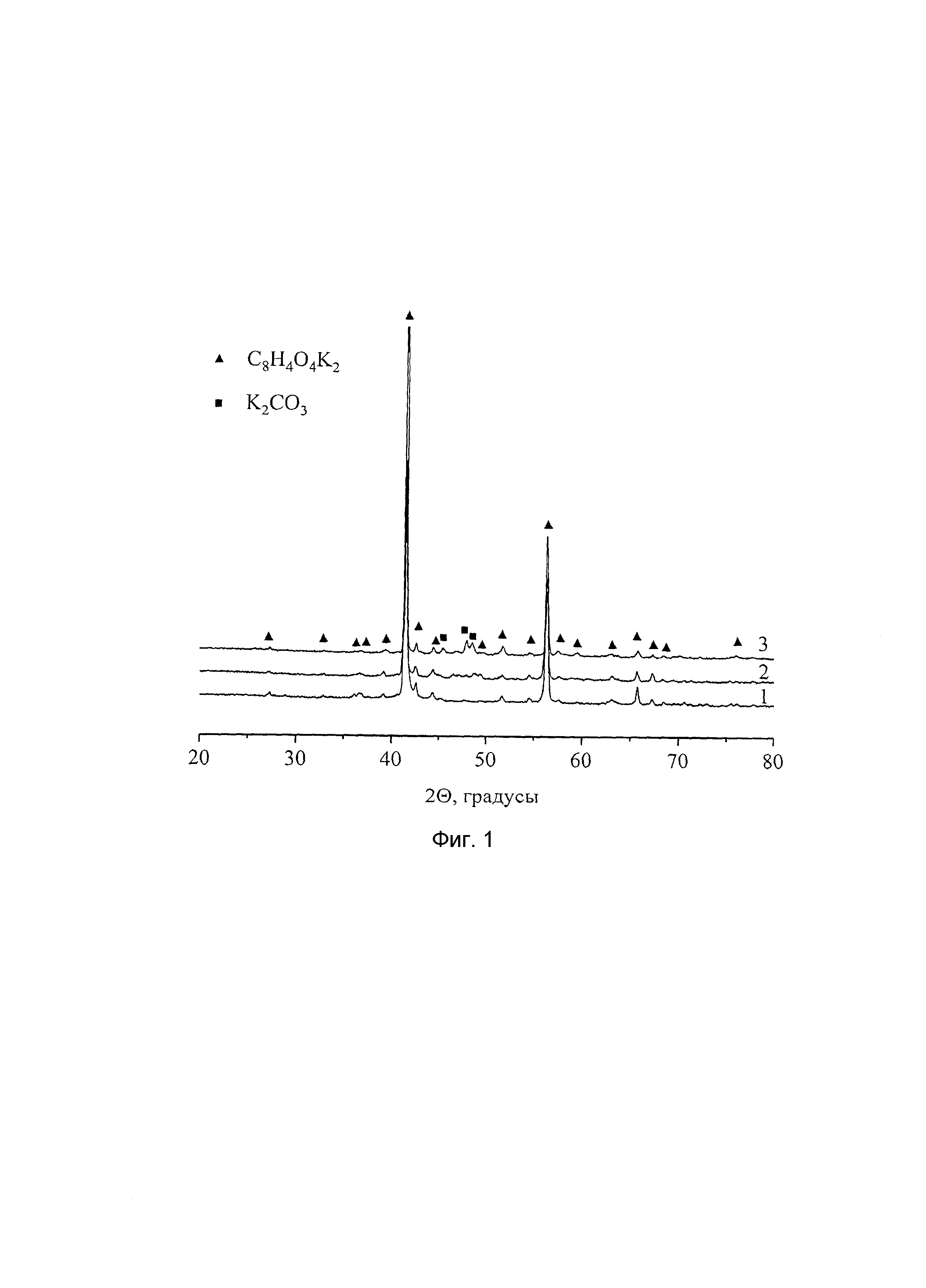 Изобретение относится к области переработки отходов полимеров, в частности к способам переработки отходов полиэтилентерефталата в углеродный материал, обладающий высокой величиной удельной площади поверхности, и может быть использовано при изготовлении адсорбционных материалов с целью их дальнейшего использования для очистки промышленных сточных и поверхностных вод. Под отходами полиэтилентерефталата (ПЭТФ) понимаются изделия, выбывшие из употребления, основным компонентом которых является полимер ПЭТФ. К ним относятся контейнеры для расфасовки и упаковки пищевой продукции, бытовой химии и т.д. Полиэтилентерефталат является одним из самых востребованных пластиков в повседневной жизни. Относительная инертность к природному воздействию, низкая разлагаемость полимера в естественных условиях и увеличивающиеся объемы отходов из полиэтилентерефталата делают вопросы его переработки в ценные продукты крайне актуальными как с экономической, так и с экологической точек зрения. В связи с этим, отходы ПЭТФ являются ценным вторичным сырьем, из которого могут быть регенерируемы различные продукты, в том числе исходные мономеры. В настоящий момент разработано достаточно большое количество способов переработки полиэтилентерефталата. Известен способ переработки отходов ПЭТФ в волокнистые материалы [1], в котором очищенные, измельченные и высушенные отходы ПЭТФ расправляют и экструдируют через фильеру волокне-образующей головки. Волокна наносят на поверхность формообразователя или собирают их с образованием полимерной ваты. Недостатками данного способа являются сложность технологических процессов, так как исходное сырье должно быть тщательно очищено, формовка осуществляется под давлением, и необходимо использование дополнительных химических реагентов - термостабилизаторов, кристаллизующих добавок и наполнителей. Известен способ каталитического пиролиза отходов ПЭТФ с получением бензойной кислоты, который включает в себя нагрев смеси измельченных отходов полиэтилентерефталата до 250-350°С в течение 1 часа 20 минут при атмосферном давлении, без доступа кислорода воздуха, в присутствии ацетилацетонатного комплекса железа (III) в качестве катализатора с последующей конденсацией образующейся бензойной кислоты и ее последующее выделение [2]. Выход бензойной кислоты в присутствии катализатора достигал 81,5%. Оставшаяся часть приходится на твердый остаток (технический углерод) и газообразные углеводороды ряда С2-С5 (горючие газы). Основными недостатками каталитического пиролиза ПЭТФ являются необходимость использования катализатора и энергетические затраты (пиролиз осуществляют при температуре 250-350°С в течение 1 часа 20 минут). Одним из перспективных способов химической переработки полиэтилентерефталата считается щелочной гидролиз в водных, водно-спиртовых и спиртовых растворах. Под действием сильных щелочей, как правило KOH или NaOH, при высоких температурах (150 - 190°С) и давлении порядка 1 МПа полиэтилентерефталат деполимеризуется с образованием соли терефталевой кислоты и этиленгликоля. При подкислении раствора происходит осаждение терефталевой кислоты, которая затем отфильтровывается, промывается и сушится. Полученная терефталевая кислота, в зависимости от достигнутой чистоты, может в дальнейшем быть исполь