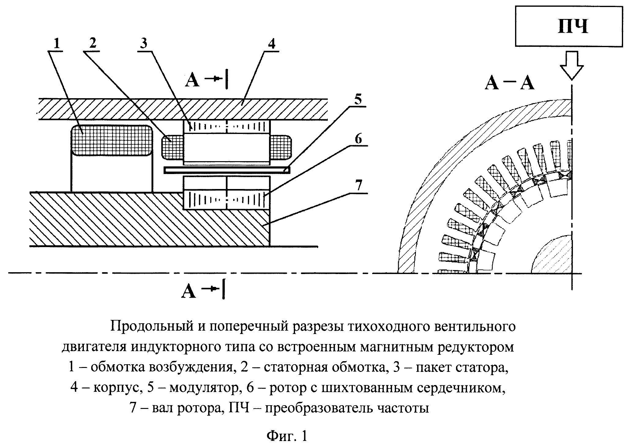 1. Тихоходный вентильный двигатель индукторного типа со встроенным магнитным редуктором, содержащий трехфазную малополюсную обмотку на неподвижном статоре с числом пар полюсов р1 от 1 до 3, обмотку возбуждения постоянного тока на подшипниковом щите, модулятор с числом ферромагнитных стержней Z, ротор с шихтованным сердечником, на наружной поверхности которого расположены Z2=Z-р1 открытых зубцов, отличающийся тем, что вращающийся ротор выполнен без постоянных магнитов и имеет выходной вал, модулятор закреплен неподвижно. 2. Тихоходный вентильный двигатель индукторного типа со встроенным магнитным редуктором по п. 1, отличающийся тем, что ротор закреплен неподвижно, а выходной вал соединен с вращающимся модулятором.