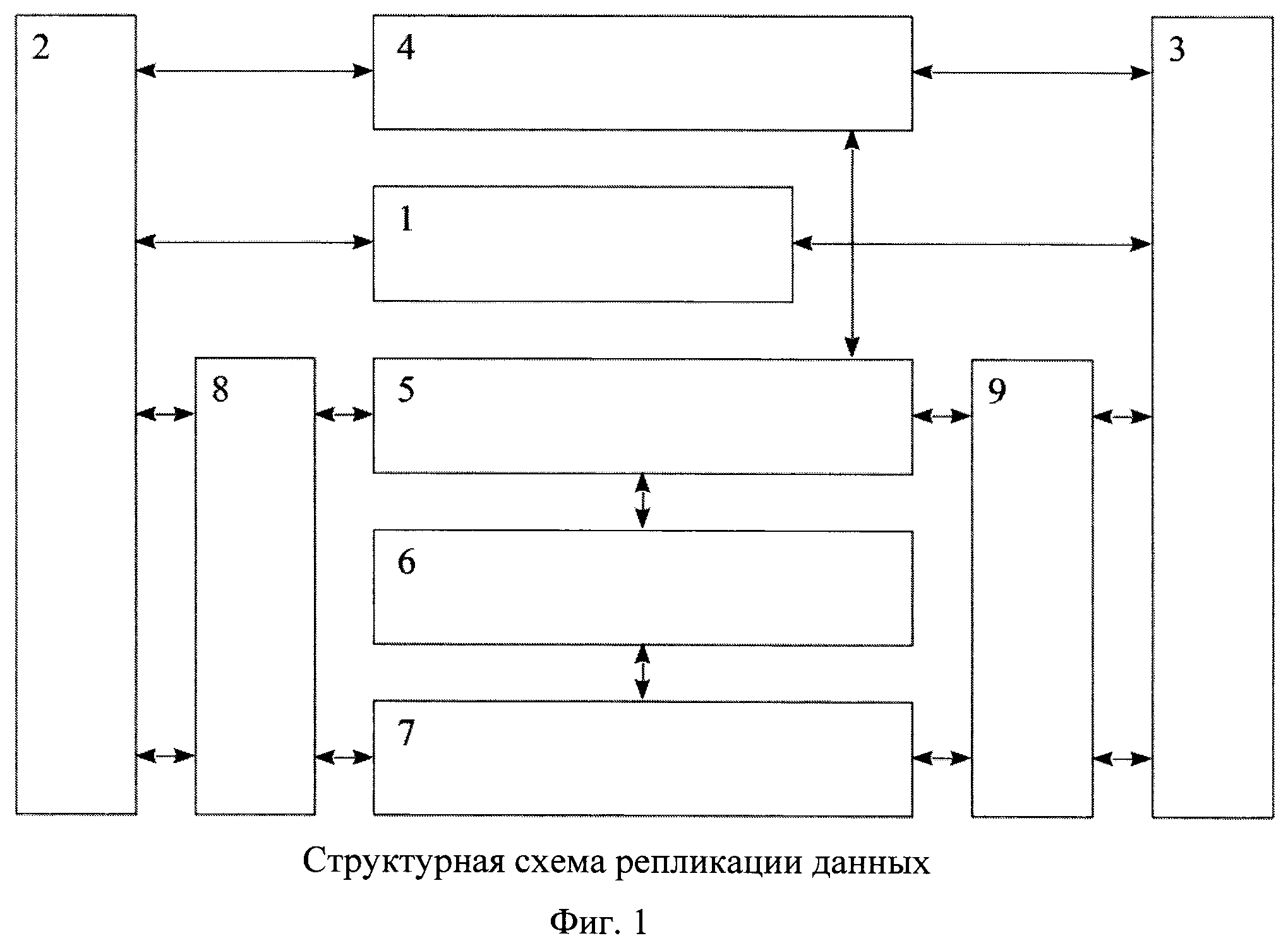 При реализации рассмотренного способа репликации данных предложенная система используется следующим образом. Блок 1, первый и второй входы-выходы которого соединены с первыми входами-выходами первого 2 и второго 3 компьютеров, соответственно, обеспечивает локальную сеть между первым 2 и вторым 3 компьютером, содержащими синхронизируемые базы данных. Блок 4 синхронизации режимов работы компьютеров, первый и второй входы-выходы которого соединены со вторыми входами-выходами первого 2 и второго 3 компьютеров, соответственно, обеспечивает перевод первого 2 и второго 3 компьютеров поочередно в режим компьютера-приемника и компьютера-источника. Блок 5 сравнения данных в изменяемых базах данных, первый вход-выход которого соединен с третьим входом-выходом блока 4 синхронизации режимов работы компьютеров, производит сравнения в изменяемых базах данных первого 2 и второго 3 компьютеров, а блок 6 выделения несовпадающих фрагментов в изменяемых базах данных, первый вход-выход которого соединен с четвертым входом-выходом блока 5 сравнения данных в изменяемых базах данных, выделяет фрагменты для замены (обновления) изменяемых баз данных, которые с помощью блока 7 внесения изменений в изменяемые базы данных вносятся в виде изменений в изменяемые базы данных. Блоки 8 и 9 кодирования-декодирования данных, первый и второй входы-выходы которых соединены с третьими и четвертыми входами-выходами первого 2 и второго 3 компьютера соответственно, а третьи и четвертые входы-выходы блоков 8 и 9 кодирования-декодирования данных соединены со вторыми и третьими входами-выходами блоков 5 сравнения данных в изменяемых базах данных и 7 внесения изменений в изменяемые базы данных соответственно осуществляют прямое преобразование данных к сжатому (закодированному) виду при их передаче и обратное преобразование данных к развернутому (раскодированному) виду при их приеме во время осуществления информационного обмена по каналам связи от первого компьютера ко второму и от второго компьютера к первому.
