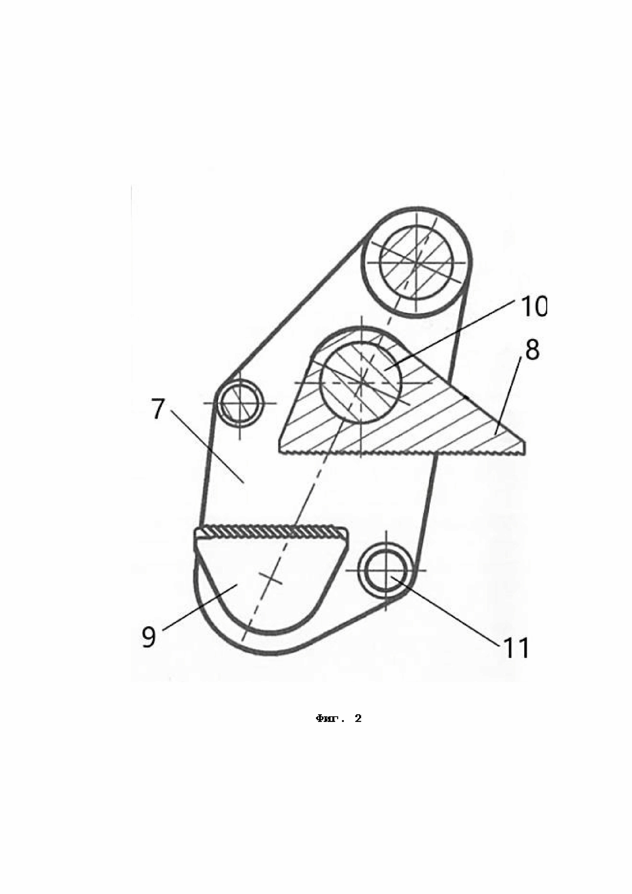 ОБЛАСТЬ ТЕХНИКИ Изобретение относится к средствам для перемещения тяжеловесного груза по временно установленным рельсам и может быть использовано в любой отрасли промышленности, где необходимо перемещение тяжеловесного оборудования к месту строительно-монтажных и ремонтных работ. УРОВЕНЬ ТЕХНИКИ Известно устройство для перемещения тяжеловесного оборудования по рельсам (разработка ООО "Гидросфера", сайт в Интернете www.gidros.ru). Устройство включает два двусторонних гидроцилиндра, корпус с двумя клиньями для зацепления с рельсом и ручной механизм привода клиньев с одной стороны и плавающей опорой, закрепленной, с другой стороны. Недостатком данной конструкции является сложность эксплуатации вследствие необходимости вручную переставлять устройство для повторного цикла перемещения груза. Известно устройство для перемещения тяжеловесного оборудования по рельсам, патент РФ №2414414, патентообладатель ЗАО "ЭНЕРПРЕД", сайт www.enerpred.com. Устройство содержит гидроцилиндр двустороннего действия, установленные на корпусе гидроцилиндра узлы подачи гидравлической жидкости, первый и второй захваты головки рельса, установленные на корпусе и штоке гидроцилиндра посредством узлов крепления. Узлы крепления захватов содержат кронштейны, соединенные осями с захватами. На поверхности кронштейнов, сопрягаемой с рычагами захватов, выполнены опорная часть и канавка. Паз рычагов захватов выполнен с горизонтальным и наклонным участками для проворота и обеспечения последовательного отклонения захватов в сторону, противоположную перемещению штока. Недостатком данной конструкции является наличие высоких изгибающих моментов силы, действующих на захваты и головку рельса при работе устройства, что приводит к повреждению захватов, снижению их срока службы, к проскальзыванию захватов, повреждению головки рельса. Это объясняется тем, что захваты при работе заклиниваются своей кромкой в нижнюю часть головки рельса. В этих случаях прерывается автоматическое движение устройства по рельсу и требуется его ручная перестановка. СУЩНОСТЬ ИЗОБРЕТЕНИЯ Технической задачей заявляемого изобретения является создание устройства, обеспечивающего увеличение его надежности и срока службы. Поставленная задача решается тем, что предлагаемое устройство для перемещения тяжеловесного оборудования по рельсу, включает: гидроцилиндр (1), имеющий корпус и шток поршня, упор (5), установленный на конце упомянутого штока, первый (3) и второй (2) захваты для головки рельса, в котором: упомянутый первый (3) захват имеет верхнюю часть, шарнирно соединенную с концом штока упомянутого гидроцилиндра посредством оси (13) и снабженную опорой (14), выполненной с возможностью качения или скольжения вдоль верхней части головки рельса, а также нижнюю часть, имеющую зону скольжения и зону трения, выполненные таким образом, что упомянутая зона скольжения имеет минимальную площадь пятна контакта с нижней частью головки рельса или вообще не касается нижней части головки рельса при удлинении гидроцилиндра (1) и соответствующем наклоне захвата (3) относительно вертикальной плоскости, а зона трения вплотную примыкает к нижней части головки рельса при укорочении гидроцилиндра (1) и соответствующем отклонении захвата (3); упомянутый второй (2) захват имеет верхнюю часть, шарнирно соединен