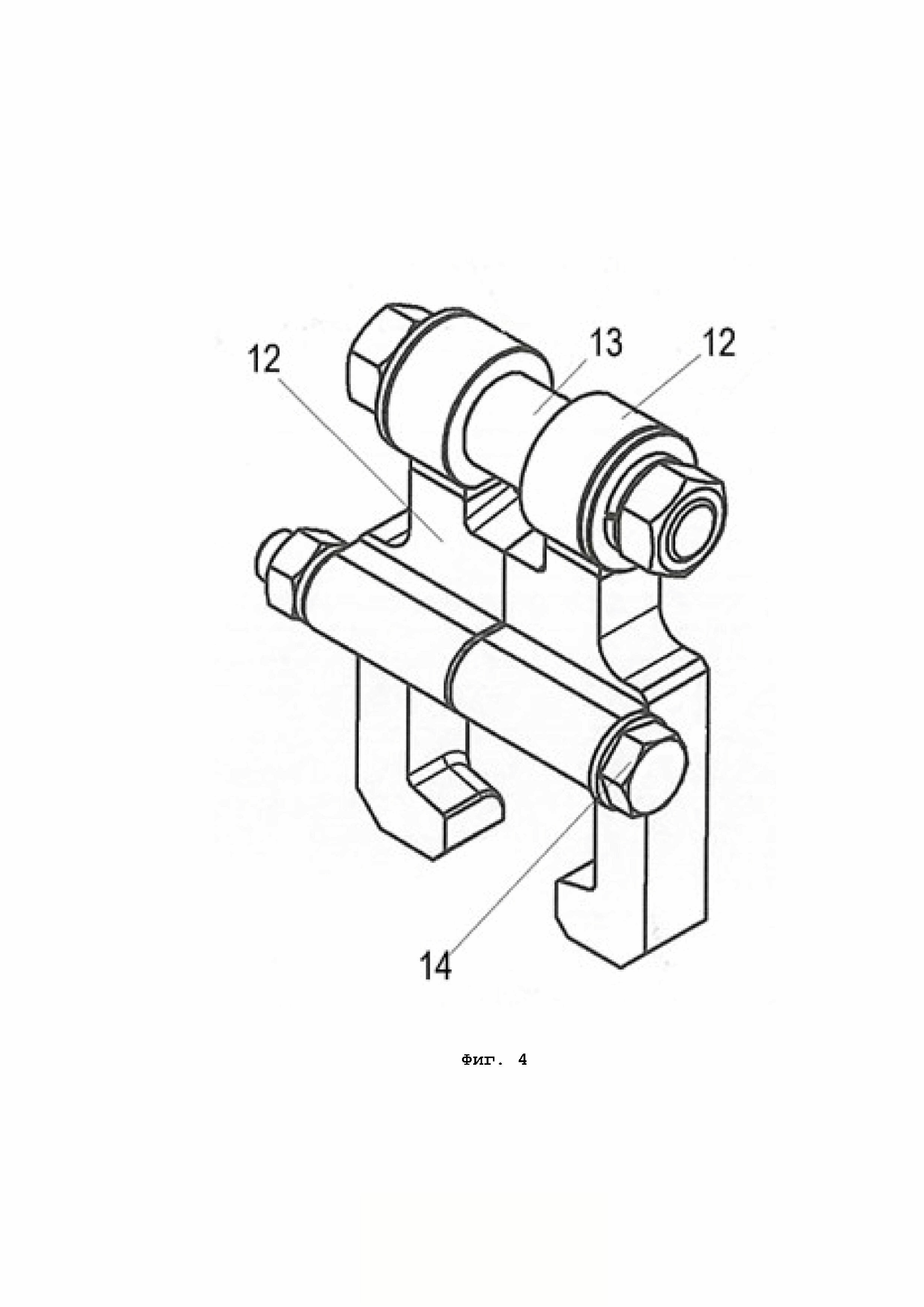 1. Устройство для перемещения тяжеловесного оборудования по рельсу, включающее: гидроцилиндр (1), имеющий корпус и шток поршня, упор (5), установленный на конце упомянутого штока, первый (3) и второй (2) захваты для головки рельса, в котором упомянутый первый (3) захват имеет верхнюю часть, шарнирно соединенную с концом штока упомянутого гидроцилиндра посредством оси (13) и снабженную опорой (14), выполненной с возможностью качения или скольжения вдоль верхней части головки рельса, а также нижнюю часть, имеющую зону скольжения и зону трения, выполненные таким образом, что упомянутая зона скольжения имеет минимальную площадь пятна контакта с нижней частью головки рельса или вообще не касается нижней части головки рельса при удлинении гидроцилиндра (1) и соответствующем наклоне захвата (3) относительно вертикальной плоскости, а зона трения вплотную примыкает к нижней части головки рельса при укорочении гидроцилиндра (1) и соответствующем отклонении захвата (3); упомянутый второй (2) захват имеет верхнюю часть, шарнирно соединенную с упомянутым корпусом гидроцилиндра, и нижнюю часть, снабженную верхним (8) и нижним (9) кулачками, имеющими в своей нижней и верхней частях, соответственно, площадки для упора в верхнюю часть и нижнюю часть головки рельса соответственно, при этом кулачки установлены шарнирно с возможностью поворота относительно оси таким образом, что плоскости упомянутых площадок могут совмещаться с плоскостями верхней и нижней частей головки рельса; упомянутый второй (2) захват снабжен опорой (11), выполненной с возможностью качения или скольжения вдоль верхней части головки рельса и расположенной таким образом, что при укорочении гидроцилиндра (1) второй захват (2) наклоняется, при этом упомянутый верхний (8) кулачок поднимается, а упомянутый нижний (9) кулачок опускается, тем самым освобождая головку рельса, а при удлинении гидроцилиндра (1) упомянутый верхний (8) кулачок опускается, а упомянутый нижний (9) кулачок поднимается, тем самым зажимая головку рельса. 2. Устройство по п.1, в котором вышеупомянутый второй зажим (2) имеет два нижних (9) кулачка, выполненных с возможностью расположения слева и справа относительно головки рельса, и один верхний (8) кулачок. 3. Устройство по п.1, в котором вышеупомянутая опора (11) и/или (14) представляет собой ролик. 4. Устройство по п.3, в котором вышеупомянутый ролик снабжен подшипниками качения. 5. Устройство по п.3, в котором вышеупомянутый второй (2) зажим снабжен двумя опорами (11) в виде роликов (11), расположенных слева и справа относительно головки рельса. 6. Устройство по п.1, в котором вышеупомянутые площадки для упора выполнены с возможностью зацепления нижней части головки рельса, представляют собой рифление или группы расположенных параллельно друг другу борозд и гребней. 7. Устройство по п.1, отличающееся тем, что содержит приспособление для его быстрого возврата к краю рельса, состоящее из клина распорного, ручки и тросика.