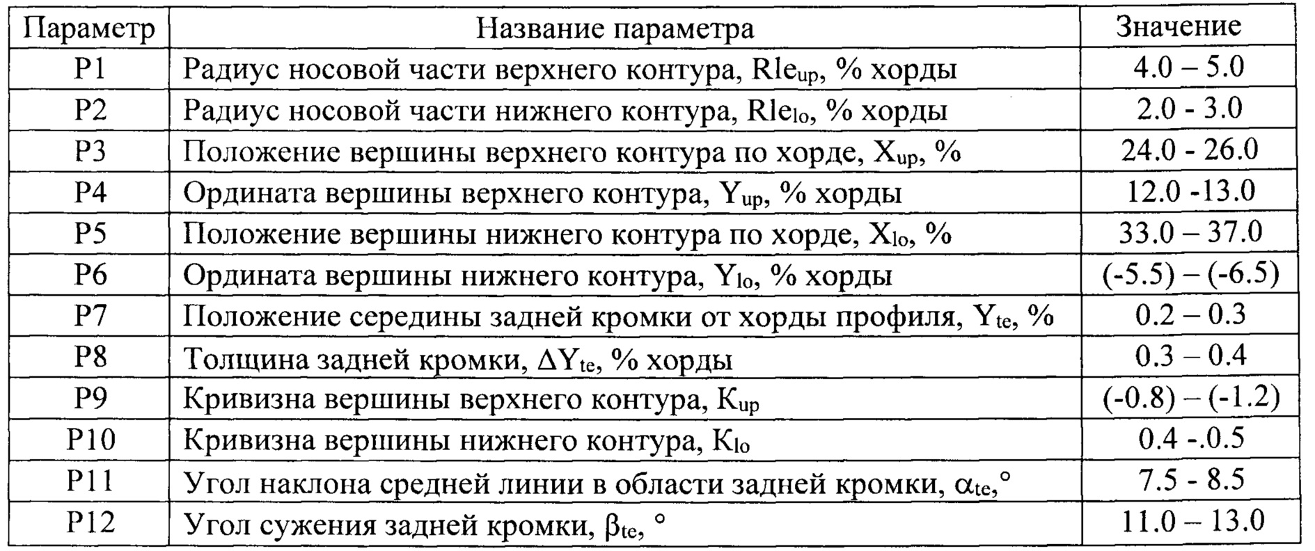 Изобретение относится к авиационной технике и может быть использовано при разработке новых компоновок крыльев региональных пассажирских и транспортных самолетов. Региональными самолетами принято называть небольшие самолеты, рассчитанные на перевозку 40-80 пассажиров и грузов до 6-8 тонн, осуществляемую обычно в пределах одной страны или близлежащих стран и регионов страны (например, в России). Типичная дальность полета региональных самолетов в Европе составляет 500-600 км, в то время как в России она возрастает до 1500-2500 км. С учетом полетов с промежуточной посадкой необходимое расстояние может быть уменьшено до 1500 км. Принципиальное отличие для России заключается в большом количестве эксплуатируемых аэропортов и аэродромов с ограничением по длине взлетно-посадочной полосы. Также существенным требованием для России является возможность взлета и посадки с грунтовых взлетно-посадочных полос. Последние обстоятельства приводят к необходимости повышения несущих свойств крыла и усложнению его механизации, что приводит к дополнительному увеличению веса планера самолета, Аэродинамическими требованиями к профилям крыла регионального самолета, непосредственно влияющими на дальность полета и несущие свойства крыла на взлетно-посадочных режимах, являются возможно меньшее значение коэффициента аэродинамического сопротивления Сх на крейсерском режиме полета и возможно большее значение коэффициента максимальной подъемной силы Cymax на взлетно-посадочных режимах. Для уменьшения сопротивления самолета, связанного с его продольной балансировкой на крейсерском режиме полета, аэродинамические профили крыла регионального самолета также должны иметь возможно меньшее абсолютное значение коэффициента продольного момента при нулевой подъемной силе mz0. Форма аэродинамических профилей крыла оказывает большое влияние на аэродинамические характеристики крыла самолета. Известно большое количество дозвуковых аэродинамических профилей, крыла различных геометрических форм. Все известные аэродинамические профили для дозвуковых скоростей, которые используются на крыльях летательных аппаратов, включают следующие основные элементы: носовую часть округлой формы, верхний и нижний контуры, плавно сопрягающиеся с носовой частью и хвостовую часть, являющуюся областью соединения верхнего и нижнего контуров с задней кромкой профиля. Для описания формы аэродинамических профилей в патентной и научно-технической литературе используются различные геометрические параметры: верхних и нижних контуров профилей, средних линий и симметричных частей профилей, а также координаты верхних и нижних контуров профилей (смотри, например, патенты US 4,455,003 и RU 2 685 372). В данной заявке, для описания и сравнения форм заявляемого аэродинамического профиля и его прототипа, используется набор геометрических параметров (признаков) для описания профилей крыла по известному методу PARSEC (Sobieczky, H. Parametric Airfbilsand Wings, Noteson Numerical Fluid Mechanics, 1998, Vol.16, pp.71-88.). Данный метод параметризации контура профиля был разработан на основе рассмотрения реальной геометрии различных дозвуковых профилей крыла для сокращения количества параметров, описывающих основные особенности геометрии профилей крыла с достаточной определенностью, влияющие на аэродинамические характеристики про