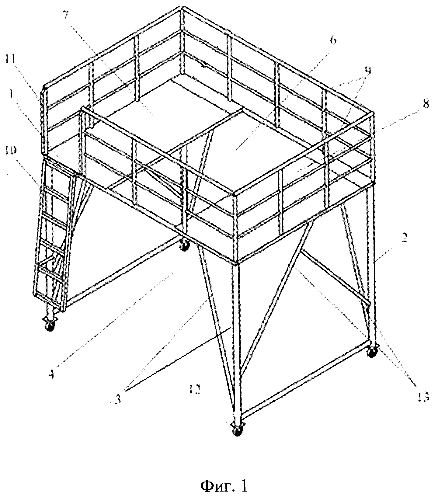 Изобретение относится к строительным сооружениям используемым для сварочных и монтажных работ при изготовлении крупных горизонтальных цилиндрических емкостей и может применяться при сварке у них поворотных, продольных и кольцевых стыков, а также контроля качества их проведения. Известно устройство для проведения сварочных работ на крупногабаритных цилиндрических изделиях (SU 1098726, 23.06.1984). Недостатком данного способа является невозможность его использования в помещениях, в которых отсутствуют технологические тали, или козловые краны. Известно устройство для выполнения сварочно-монтажных работ на высоте содержащее установленное на опоры каркасное основание и размещенную на нем рабочую площадку (RU 2073779 от 20.02.1997). Недостатком такого устройства является то, что его невозможно использовать для сварки цилиндрических изделий. Наиболее близким по своей технической сущности является площадка передвижная для выполнения сварочно-монтажных работ крупногабаритных цилиндрических изделий включающая рабочую платформу, каркас укосины, перила, стойки, лестницу (RU 119006, 10.08.2012). Ее недостатком является то, что с нее невозможно выполнять сварочно-монтажные работы, в тех случаях, если свариваемый объект находится под рабочей платформой, а это значит невозможно сваривать крупногабаритные цилиндрические емкости. Задачей решаемой настоящим изобретением является разработка конструкции передвижной площадки позволяющей вести сварку и монтаж цилиндрических изделий под рабочей платформой. Техническая сущность заключается в том, чтобы создать надежное не металлоемкое малогабаритное передвижное устройство позволяющее вести с него сварку и контроль качества швов горизонтальных и продольных цилиндрических емкостей изготавливаемых в малоприспособленных производственных помещениях или полевых условиях. Настоящая задача решается тем, что в площадке передвижной для выполнения сварочно-монтажных работ при изготовлении крупногабаритных цилиндрических изделий, включающей рабочую платформу размещенную на опорах с укосинами, ее ограждение, лестницу, рабочая платформа разделена проемом на две части, каждая пара опор соединены жестким каркасом и крепятся к разным частям платформы, каркас выполнен в виде треугольной призмы, в сечении которой заложен разносторонний треугольник, с углом между меньшей и средней по величине сторонами больше или равным 90°, при этом меньшая сторона треугольника лежит в плоскости рабочей платформы, а подплатформенное пространство выполнено с возможностью перемещения под ним изготавливаемого цилиндрического изделия. На нижних концах каждой из опор размещены по два колеса. Проем рабочей платформы выполнен прямоугольной формы и размещен длинной стороной в направлении меж каркасного пространства опор. На фиг. 1 изображена площадка передвижная в аксонометрической проекции. На фиг. 2 вид площадки передвижной спереди. На фиг. 3 вид площадки передвижной сбоку. На фиг. 4 вид площадки передвижной сверху. Площадка передвижная для выполнения сварочно-монтажных работ при изготовлении крупногабаритных цилиндрических изделий состоит из рабочей платформы 1, размещенной на опорах 2, каркас которых выполнен в виде треугольной призмы 3. В поперечном сечении призмы заложен разносторонний треугольник, с углом α, лежащим