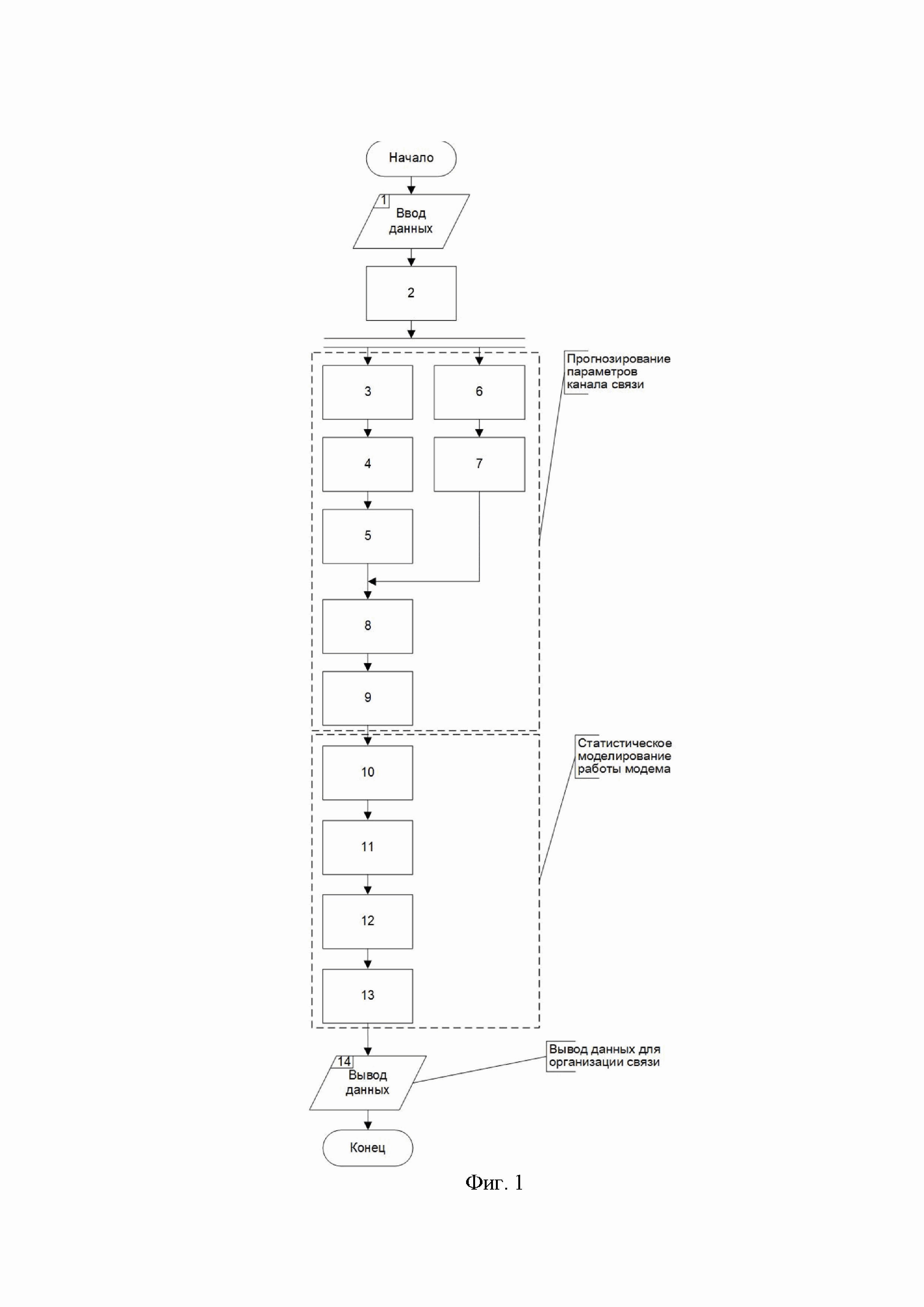 Способ адаптации декаметровой радиосвязи по ширине спектра передаваемых сигналов за счет мониторинга текущего состояния ионосферы, включающий подключение к антеннам связного приемника многоканального обзорного приемника и последовательную настройку его на резервные частоты связи, оценку пространственного спектра помех на каждой из резервных частот, расчёт усредненных параметров канала связи на текущий момент времени устройством прогнозирования характеристик канала связи для каждой из резервных частот, измерение мощности принимаемого сигнала на частоте ведения связи по сигналу, принимаемому связным приемником, расчет фактического коэффициента ослабления сигнала слоем D-ионосферы на основании прогноза мощности и измеренной мощности принимаемого сигнала на частоте ведения связи, расчет коэффициентов поглощения для всех резервных частот связи, уточнение значений ожидаемой мощности принимаемого сигнала по известным величинам поглощения для каждой из резервных частот, загрузку в имитатор канала связи данных прогноза на резервных частотах, уточненных значений мощности принимаемого сигнала, характеристик пространственного спектра помех, во всех допустимых режимах работы модема передачи данных пропуск через имитатор сигнала используемого модема передачи данных, передающего текстовую последовательность данных, подсчет ошибок в тестовой последовательности на ее длине, достаточной для обеспечения требуемой статистической точности оценки, ранжирование списка резервных частот путем сравнения их величин BER для выбора резервной частоты с минимальным значением BER, отличающийся тем, что ранжированный список резервных частот записывают на носитель в машиночитаемом виде и заблаговременно для проведения расчетов вводят исходные данные, после ввода исходных данных для каждой из рабочих и резервных частот определяют параметры трассы, для каждой из рабочих и резервных частот определяют значения дифракционного параметра, принимают радионавигационные сигналы ГЛОНАСС/GPS с помощью двухчастотной аппаратуры приема ГЛОНАСС/GPS, измеряют фазовые пути на частотах приема сигналов ГЛОНАСС/GPS, вычисляют значения полного электронного содержания в отдельные моменты времени, определяют значения регулярной составляющей полного электронного содержания и среднеквадратического отклонения полного электронного содержания, определяют значение интенсивности неоднородностей ионосферы и значения среднеквадратического отклонения флуктуаций фазового фронта волны для каждой из рабочих и резервных частот; для каждой из рабочих и резервных частот определяют интервалы частотной корреляции, для каждой из рабочих и резервных частот проверяют выполнение условия отсутствия частотно-селективных замираний с учетом возможных значений ширины спектра передаваемых сигналов и отсеивают все значения ширины спектра передаваемых сигналов на каждой из рабочих частот, для которых условие отсутствия частотно-селективных замираний не выполняется, формируют списки разрешенных и запрещенных значений ширины спектра для каждой из рабочих и резервных частот и записывают их на носитель в машиночитаемом виде, выбирают наилучшие по критерию BER частоты для назначения их рабочими и для выбранных частот назначают режимы работы исходя из шир