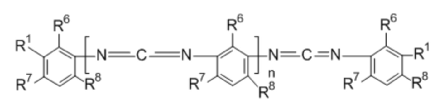 Настоящее изобретение касается композиций, содержащих полимеры на основе карбодиимидов, эпоксидов и сложных полиэфиров, их получения и применения для ингибирования гидролиза. Доказано, что широко разнообразные карбодиимиды полезны во многих областях применения, например, в качестве ингибиторов гидролиза для термопластов, полиолов на основе сложных эфиров, полиуретанов, триглицеридов, смазочных масел и т.д. Однако у них есть недостатки: эмиссия газов, возможно, вредных для здоровья, и очень высокая стоимость и сложность производства. Производство эпоксидов дешевле, но у них есть недостаток, они не достигают активности по стабилизации в отношении гидролиза карбодиимидов даже при очень высоких концентрациях. Они действуют лишь как поглотители кислот и обеспечивают только недостаточную долговременную стабилизацию при более высоких температурах. В частности, в приложениях с очень высокими требованиями, например, в условиях высокой атмосферной влажности и температуры они имеют недостаточную активность в качестве ингибиторов гидролиза, так как пластмассы на основе сложных эфиров обычно обрабатывают при температурах выше 200°C. В DE 10349168 A1 описан ингибитор гидролиза, составленный из эпоксидированных эфиров жирных кислот и глицеридов и их смеси с мономерным карбодиимидом. Описанные там стабилизаторы действуют как поглотители кислот в маслах. Однако при обработке в указанных выше условиях термопластмасс на основе сложных эфиров они демонстрируют недостаточную активность (если вообще демонстрируют) по долговременной устойчивости к гидролизу. Кроме того, в результате применения мономерных карбодиимидов возрастает эмиссия токсичных газов. Таким образом, целью настоящего изобретения является получение новых, экономически эффективных композиций, которые устойчивы к гидролизу, демонстрируют пониженную эмиссию газов, и производство их экономически эффективно. В настоящее время неожиданно обнаружено, что указанной выше цели можно достичь, используя комбинацию, по меньшей мере, одного полимерного ароматического карбодиимида, по меньшей мере, одного эпоксида, имеющего, по меньшей мере, 2 эпоксидных группы, и, по меньшей мере, одного полимера на основе сложного полиэфира, в частности, полиалкилентерефталата или полилактида. Таким образом, настоящее изобретение касается композиции, содержащей (a) по меньшей мере, один полимерный ароматический карбодиимид формулы (I) R1-R2-(-N=C=N-R2-)m-R1 (I), где m представляет собой целое число от 2 до 500, предпочтительно от 3 до 20, особо предпочтительно от 4 до 10, R2 представляет собой C1-C12-алкил-замещенные арилены, C7-C18-алкиларил-замещенные арилены и необязательно C1-C12-алкил-замещенные C1-C8-алкилен-мостиковые арилены, содержащие всего от 7 до 30 атомов углерода, и арилен, предпочтительно где R6, R7 и R8каждый независимо представляет собой метил или этил, где каждое бензольное кольцо несет только одну метильную группу и n=от 1 до 10, и R1 обозначает -NCO, -NCNR3-NHCONHR3, -NHCONR3R4 или -NHCOOR5, где R3 и R4 одинаковые или разные и представляют собой C1-C12-алкильный, C6-C12-циклоалкильный, C7-C18-аралкильный или арильный радикал, и R5 представляет собой C1-C22-алкильный, C6-C12-циклоалкильный, C6-C18-арильный или C7-C18-аралкильный радикал и ненасыщенный алкильный радикал, имеющий 2-22 атома углерода, или алкоксиполиоксиалкиленовый радикал, (b) по меньшей мере