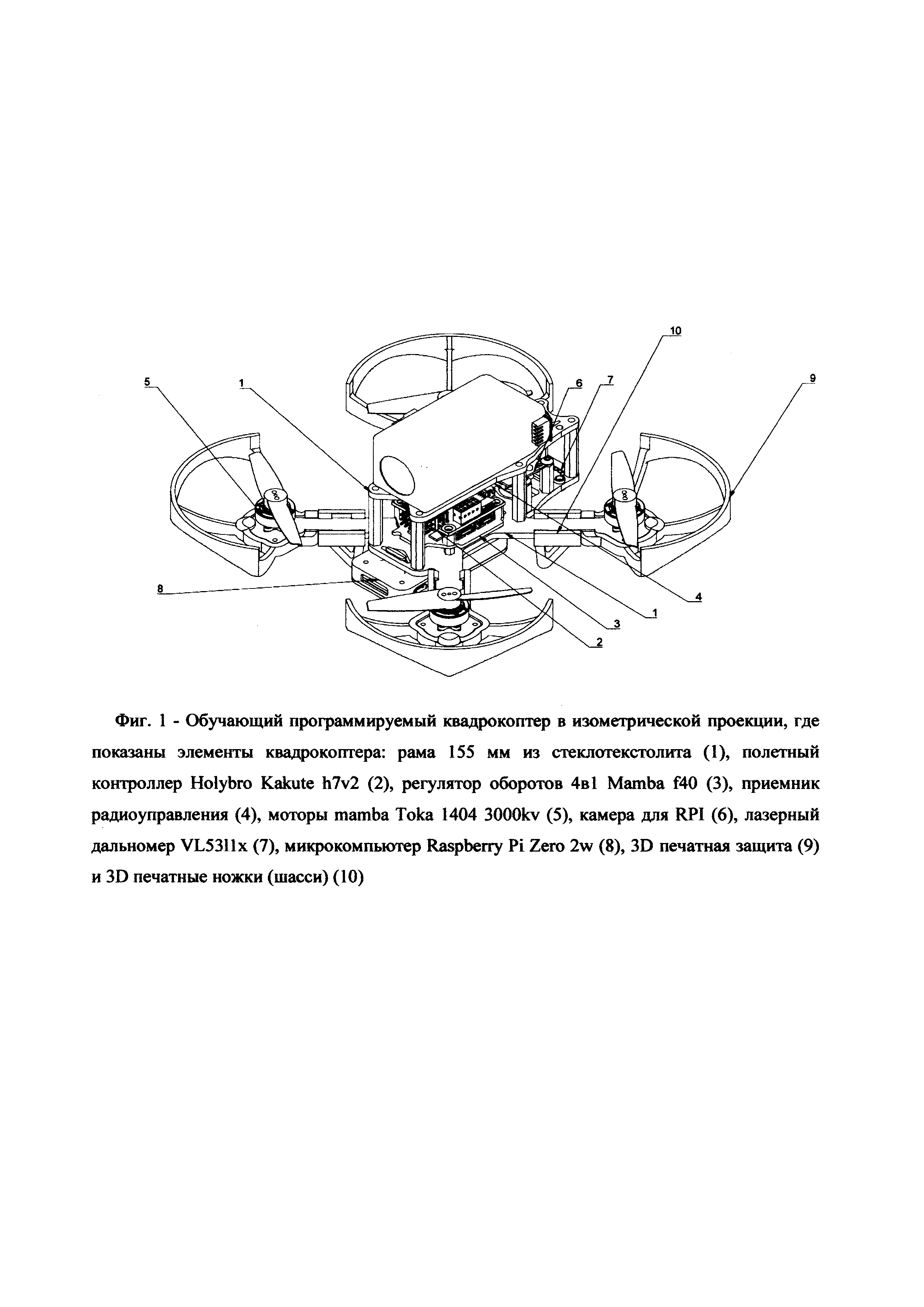 Сущность изобретения поясняется чертежами, где на фиг. 1 изображен обучающий программируемый квадрокоптер в изометрической проекции, а на фиг. 2 - вид снизу на раму квадрокоптера, где введены следующие обозначения: рама 155 мм из стеклотекстолита (1), полетный контроллер Holybro Kakute h7v2 (2), регулятор оборотов 4 в 1 Mamba f40 (3), приемник радиоуправления (4), моторы Mamba Тока 1404 3000kv (5), камера для RPI (6), лазерный дальномер VL53Hx (7), микрокомпьютер Raspberry Pi Zero 2w (8), 3D печатная защита (9) и 3D печатные ножки (шасси) (10).
