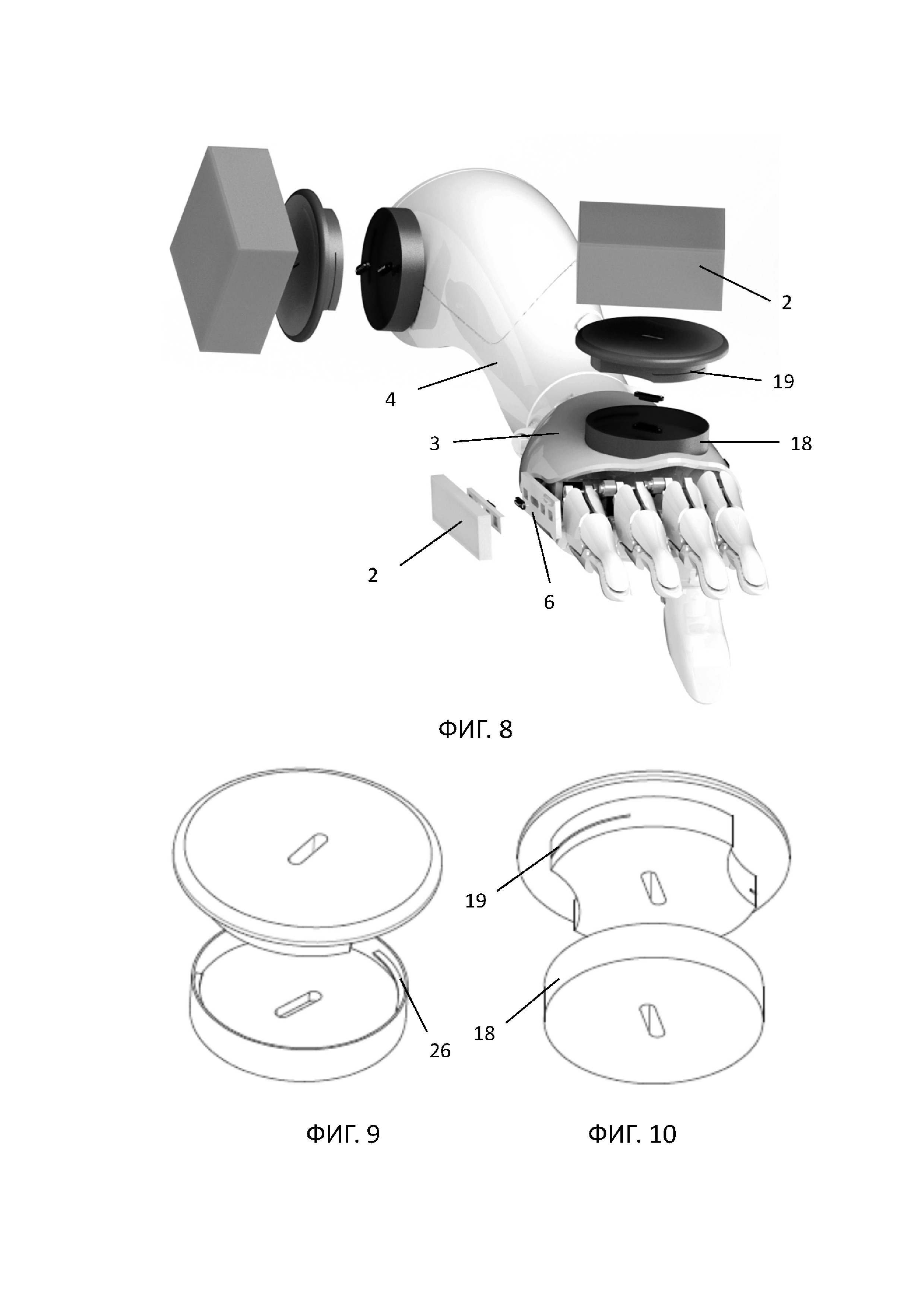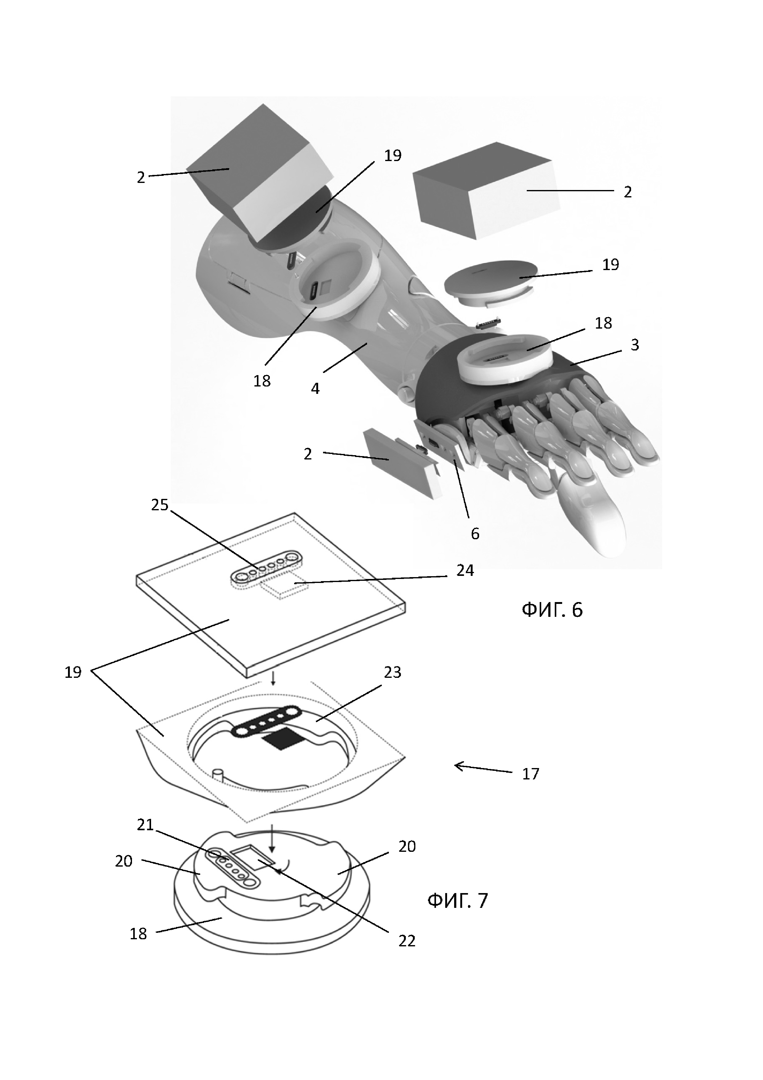 1. Протез, преимущественно кистевой или предплечья, содержащий кисть, связанную с гильзой, надеваемой на травмированную руку вместо ампутированной ее части, встроенный в гильзу или кисть процессорный контроллер для формирования управляющих сигналов, снабженный интерфейсом управления внешним устройством, и узел прикрепления на поверхности гильзы или кисти внешнего устройства, отличающийся тем, что процессорный контроллер выполнен с выходным интерфейсом подключения внешних электронных или электромеханических устройств, при этом на поверхности гильзы или кисти выполнен по крайней мере один узел прикрепления одного внешнего устройства в виде гнезда или посадочного места, представляющего собой ответную часть крепления на внешнем устройстве, а на поверхности этой ответной части размещены контакты для связи присоединяемого внешнего устройства к выходному интерфейсу процессорного контроллера для управления внешним устройством. 2. Протез по п. 1, отличающийся тем, что узел прикрепления внешнего устройства в виде гнезда или посадочного места представляет собой ответную часть магнитного крепления или байонетного крепления или выполнен в виде планки Пикатини или Вивера или выполнен в виде «ласточкина хвоста». 3. Протез по п. 1, отличающийся тем, что интерфейс процессорного контроллера для управления внешним устройством выполнен в виде миоинтерфейса или нейроинтерфейса. 4. Протез по п. 1, отличающийся тем, что содержит ЭМГ-датчики, размещаемые на поверхности руки. 5. Протез по п. 1, отличающийся тем, что интерфейс процессорного контроллера для управления внешним устройством содержит сенсорную панель, размещаемую на поверхности гильзы или кисти. 6. Протез по п. 1, отличающийся тем, что интерфейс процессорного контроллера для управления внешним устройством содержит по крайней мере одну кнопку, размещаемую на поверхности гильзы или кисти или узла прикрепления внешнего устройства. 7. Протез по п. 1, отличающийся тем, что процессорный контроллер выполнен с возможностью загрузки программных приложений для управления внешних устройств, а также выгрузки данных, файлов, статистики и мониторинга в реальном времени по беспроводной связи в режиме WiFi или Bluetooth. 8. Узел прикрепления внешнего устройства к протезу, выполненному по пп. 1-4, характеризующийся тем, что он содержит ответную часть, закрепляемую на гильзе или кисти протеза или выполненную заодно с этой гильзой или кистью, и часть, закрепляемую на подлежащем прикреплению внешнем устройстве или выполненную заодно с ним, при этом на посадочном месте ответной части размещены неодимовые магниты и сформирована контактная площадка, на поле которой расположены контакты связи с питанием и процессорным контроллером, а часть узла прикрепления, располагаемая на внешнем устройстве, повторяет конструкцию ответной части по расположению неодимовых магнитов и контактов. 9. Узел прикрепления по п. 8, отличающийся тем, что контакты на ответной части и/или на части закрепляемой на внешнем устройстве выполнены подпружиненными. 10. Узел прикрепления внешнего устройства к протезу, выполненному по пп. 1-4, характеризующийся тем, что он содержит часть в виде планки Пикатини или Вивера, закрепляемую на гильзе или кисти протеза или выполненную заодно с этой гильзой или кистью, и ответную форме планки Пик