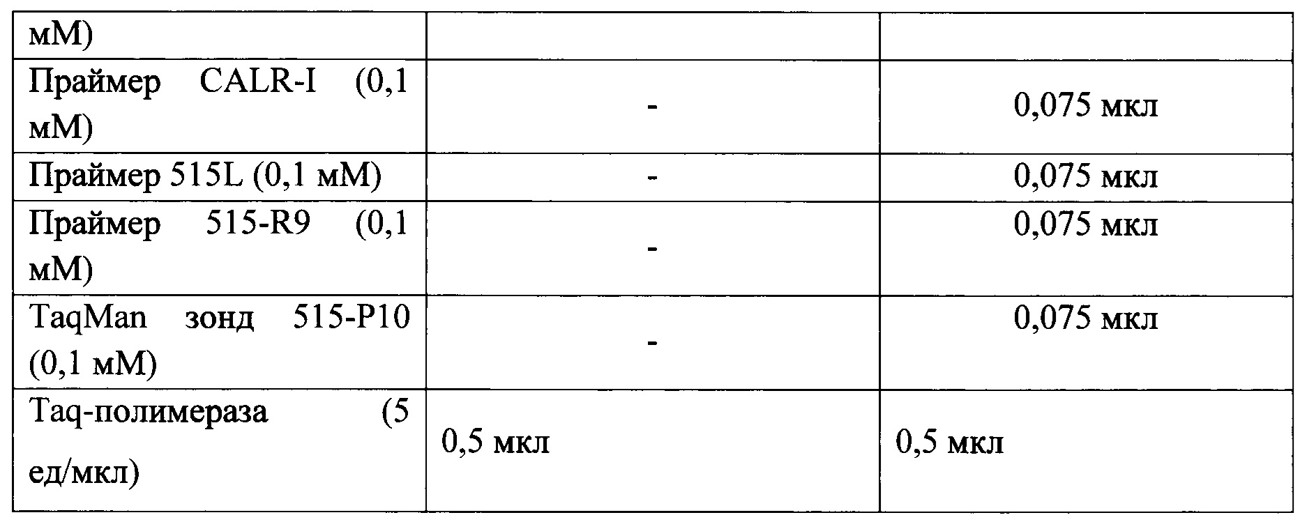 Группа изобретений относится к области медицины, в том числе к диагностике онкогематологических заболеваний, и предназначена для использования при проведении молекулярно-генетических исследований в клинико-диагностических лабораториях с целью выявления генетических маркеров хронических Ph-негативных миелопролиферативных новообразований. В соответствии с клиническими рекомендациями [Barbui Т., Thiele J., Gisslinger Н., Finazzi G., Vannucchi A.M, Tefferi A. The 2016 revision of WHO classification of myeloproliferative neoplasms: Clinical and molecular advances. Blood Reviews, 2016. 30: 453-459] основным диагностическим критерием для постановки диагноза Ph-негативных миелопролиферативных новообразований, а именно истинной полицитемии (ИП), эссенциальной тромбоцитемии (ЭТ) и первичного миелофиброза (ПМФ) является выявление одной из пяти наиболее частых патогенетических соматических мутаций в генах янускиназы-2 (JAK2 V617F), кальретикулина (CALR 1 типа - с. 1092_1143del и 2 типа - с. 1154_1155insTTGTC) и рецептора тромбопоэтина (MPL W515L и W515K). Наиболее распространенные в практике клинико-диагностических лабораторий методы и наборы реагентов для детекции мутаций предусматривают возможность проведения исследования только мутаций в отдельных генах, выполнение полного лабораторного тестирования всех основных мутаций ассоциированных с миелопролиферацией занимает достаточно большой промежуток времени. Известно одновременное исследование различных мутаций в разных генах с использованием методов секвенирования ДНК [Langabeer SE, Andrikovics Н, Asp J, et al. Molecular diagnostics of myeloproliferative neoplasms. Eur J Haematol. 2015, 95:270-279] и микрочипов (https://tools.mermofisher.com/content/sfs/brochures/genomewide_snp6_datasheet.pdf). Однако требования к оборудованию и квалификации персонала, а также высокая трудоемкость выполнения и стоимость тестирования осложняет широкое использование данных методов в реальной практике клинико-диагностических лабораторий. Известен способ, который заключается в использовании аллель-специфичных праймеров с регистрацией результатов ПЦР в режиме реального времени с использованием флуоресцентно-меченных проб. Реакционная смесь включает праймеры, отличающиеся для каждого аллеля, и общие для двух аллелей праймер и пробу, а также общий флуоресцентный зонд [RU, пат. 2445373, МПК C12Q 1/68, опубл. 20.03.2012 г., бюл. №8]. Недостатки способа заключаются в невозможности проведения мультиплексной реакции в виду использования одного флуоресцентного зонда общего для двух анализируемых аллелей. Наиболее близким к заявляемому набору реактивов и способу диагностики на его основе по совокупности признаков является набор реактивов для выявления Ph-негативных миелопролиферативных новообразований, предусматривавший использование при выполнении мультиплексной полимеразной цепной реакции четырех реакционных смесей, включающих специфические праймеры и TaqMan зонды [RU пат. 2679653, МПК G01N 33/533, опубл. 12.02.2019, Бюл. №5 (прототип)]. В патенте 2679653 предложен набор, содержащий специфичные праймеры и флуоресцентно-меченые ДНК-зонды. Праймеры имеют следующий нуклеотидный состав (5'-3'-): JAK2-W-F, JAK2-W-R, JAK2-W-P, JAK2-M-F, JAK2-M-R, JAK2-M-P, CALR-1-F, CALR-1-R, MPL-K-F, MPL-K-R, CALR-1-P, MPL-K-P, CALR-2-F, CALR-2-R, MPL-L-F, MPL-L-R, CALR-2-P, MPL-L-P. В TaqMan зондах на 5' конце применяют красители: флуоресцеин (FAM) и хлорированный флуоресцеин (HEX). Для тушения флуоресценции используют Black Hole Quencher-1 (BHQ1) на 3' конце. Данное техническое решение позволяет проводить одновременное исследование нескольких мутац
