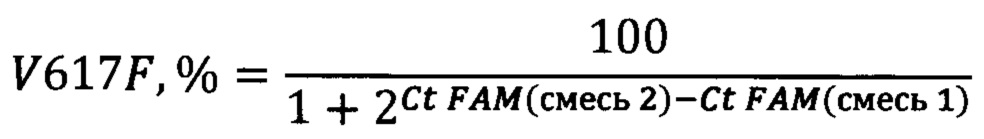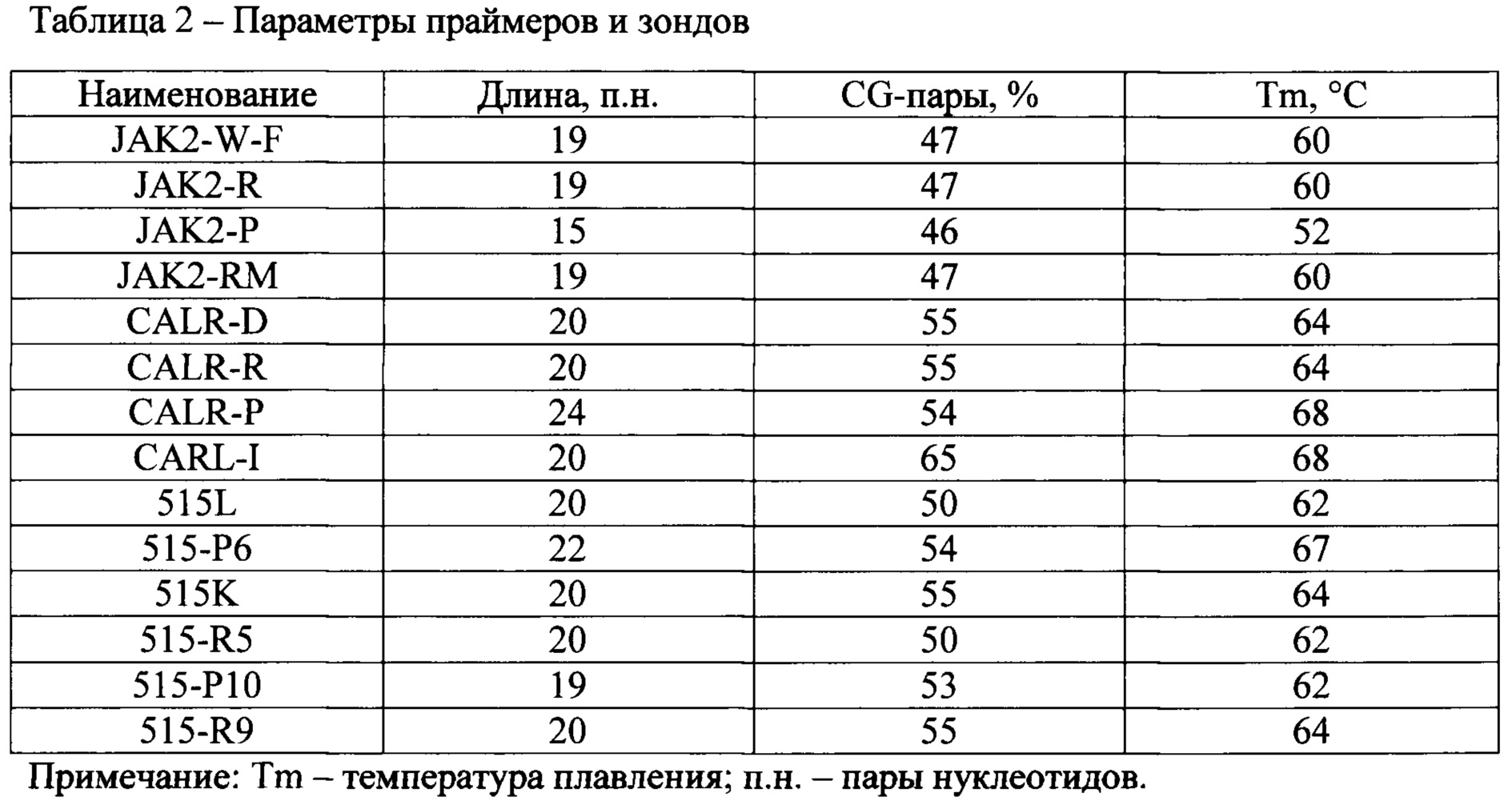 1. Набор реактивов для одновременного выявления пяти основных соматических мутаций Ph-негативных миелопролиферативных новообразований, содержащий специфичные праймеры и флуоресцентно-меченые ДНК-зонды, в качестве источника флуоресценции в TaqMan зондах на 5' конце используют красители: флуоресцеин (FAM) и хлорированный флуоресцеин (HEX), а для тушения флуоресценции используют Black Hole Quencher-1 (BHQ1) на 3' конце, отличающийся тем, что для анализа одного биологического образца используют две реакционные смеси, при этом первая смесь включает праймеры: JAK2-W-F, JAK2-R, CALR-D, CALR-R, 515K, 515-R5 и TaqMan зонды: JAK2-P, CALR-P, 515-Р6, а вторая смесь включает праймеры: JAK2-W-F, JAK2-R, CALR-R, JAK2-RM, CALR-I, 515L, 515-R9 и TaqMan зонды: JAK2-P, CALR-P, 515-Р10 и имеют следующий нуклеотидный состав (5'-3'-): JAK2-W-F: AGCAGCAAGTATGATGAGC, JAK2-R: GATGCTCTGAGAAAGGCAT, JAK2-P: FAM-CACAGACACATACTC-BHQ1, JAK2-RM: GATGCTCTGAGAAAGGCAT, CALR-D: GAGGAGTTTGGCAACGAGAC, CALR-R: ССТСАТССТССТСАТССТСА, CALR-P: HEX-AGGAGCAGAGGACAAGGAGGATGA-BHQ2, CALR-I: GCAACGAGACGTGGGGCGTA 515-R9: TAGCCTGGATCTCCTTGGTG, 515L: ACAGAGCGAACCAAGAATGC, 515-P6: HEX-TGCTGCTGAGGAAGCAGTTTCC-BHQ2, 515K: TAGCCTGGATCTCCTTGGTG, 515-R5: ACAGAGCGAACCAAGAATGC, 515-P10: HEX-CTGCTGAGGTTGCAGTTTC-BHQ2, дополнительно в качестве источника флуоресценции в TaqMan зондах на 5' конце используют краситель карбокси-Х-родамин (ROX), а для тушения флуоресценции используют Black Hole Quencher-2 (BHQ2) на 3' конце. 2. Способ диагностики Ph-негативных миелопролиферативных новообразований, включающий проведение мультиплексного варианта полимеразной цепной реакции в режиме реального времени путем смешивания буфера, дНТФ, специфичных праймеров, TaqMan зондов, Taq-полимеразы, MgCl2 и воды в оптимальных объемах, с последующей амплификацией, которую проводят в следующем режиме: предварительная активация при 95°С - 5 минут и последующие циклы, включающие денатурацию при 95°С - 15 секунд, отжиг и элонгацию при 60°С - 60 секунд, цикл повторяют 50 раз, отличающийся тем, что мультиплексную полимеразную цепную реакцию проводят одновременно в двух реакционных смесях, первая смесь включает праймеры: JAK2-W-F, JAK2-R, CALR-D, CALR-R, 515K, 515-R5 и TaqMan зонды: JAK2-P, CALR-P, 515-Р6, вторая смесь включает праймеры: JAK2-W-F, JAK2-R, CALR-R, JAK2-RM, CALR-I, 515L, 515-R9 и TaqMan зонды: JAK2-P, CALR-P, 515-Р10, имеющих следующий нуклеотидный состав (5'-3'-): JAK2-W-F: AGCAGCAAGTATGATGAGC, JAK2-R: GATGCTCTGAGAAAGGCAT, JAK2-P: FАМ-СACAGACACATACTC-BHQ1, JAK2-RM: GATGCTCTGAGAAAGGCAT, CALR-D: GAGGAGTTTGGCAACGAGAC, CALR-R: ССТСАТССТССТСАТССТСА, CALR-P: HEX-AGGAGCAGAGGACAAGGAGGATGA-BHQ2, CALR-I: GCAACGAGACGTGGGGCGTA 515-R9: TAGCCTGGATCTCCTTGGTG, 515L: ACAGAGCGAACCAAGAATGC, 515-P6: HEX-TGCTGCTGAGGAAGCAGTTTCC-BHQ2, 515K: TAGCCTGGATCTCCTTGGTG, 515-R5: ACAGAGCGAACCAAGAATGC, 515-P10: HEX-CTGCTGAGGTTGCAGTTTC-BHQ2, дополнительно в качестве источника флуоресценции в TaqMan зондах на 5' конце используют краситель карбокси-Х-родамин (ROX), а для тушения флуоресценции используют Black Hole Quencher-2 (BHQ2) на 3' конце, а результат признают положительным, если значение порогового цикла (Ct) для образца не больше 35.