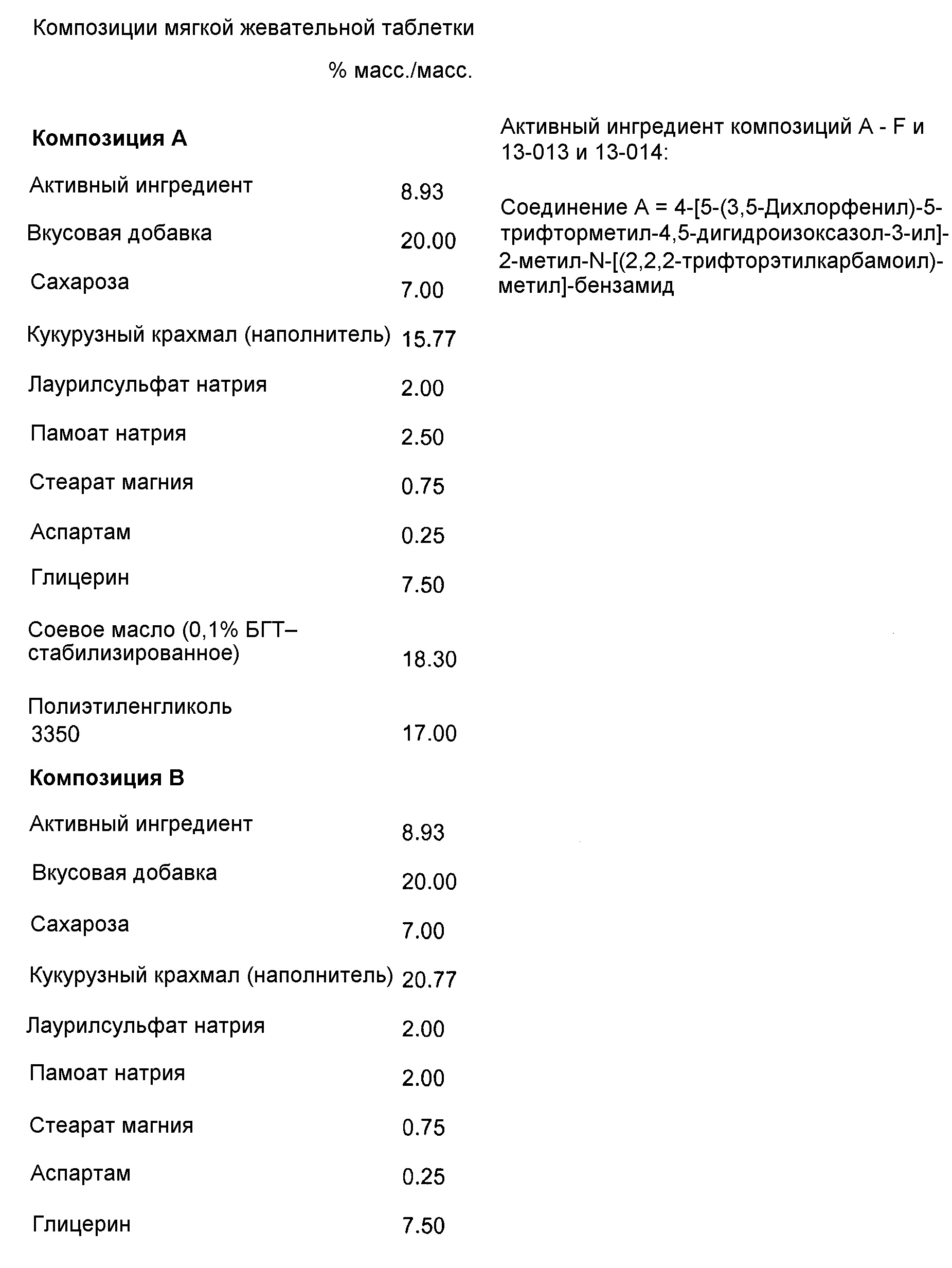 1. Способ производства полупластичного фармацевтического препарата, где полупластичный фармацевтический препарат представляет собой мягкий жевательный ветеринарный фармацевтический продукт для перорального введения, включающий следующие стадии: a) смешивание, по меньшей мере, одного активного фармацевтического ингредиента с, по меньшей мере, одним сухим и/или жидким компонентом с получением предварительной смеси, b) нагревание формующего агента до плавления, c) смешивание предварительной смеси и формующего агента вместе, с получением пасты, d) загрузка пасты в контейнер, связанный с роторной формовочной машиной, и e) формование пасты в роторной формовочной машине с получением мягкого жевательного ветеринарного фармацевтического продукта в виде дозированных форм, которые выпускаются из форм формовочной машины без применения выбивного или пробойного механизма. 2. Способ по п. 1, где роторная формовочная машина содержит формующие изложницы с вогнутыми краями. 3. Способ по п. 1 или 2, где формующим агентом является полиэтиленгликоль. 4. Способ по любому из пп. 1-3, где температура пасты на стадии d) составляет от 35 до 45°C. 5. Способ по любому из пп. 1-4, где полупластичным фармацевтическим препаратом является мягкий жевательный ветеринарный фармацевтический продукт для перорального введения, имеющий массу около 2 г или менее. 6. Способ по любому из пп. 1-5, где каждую мягкую жевательную таблетку затем отдельно упаковывают в подходящий упаковочный материал. 7. Способ по любому из пп. 1-6, где активным фармацевтическим ингредиентом является 4-[5-(3,5-дихлорфенил)-5-трифторметил-4,5-дигидроизоксазол-3-ил]-2-метил-N-[(2,2,2-трифторэтилкарбамоил)-метил]-бензамид.