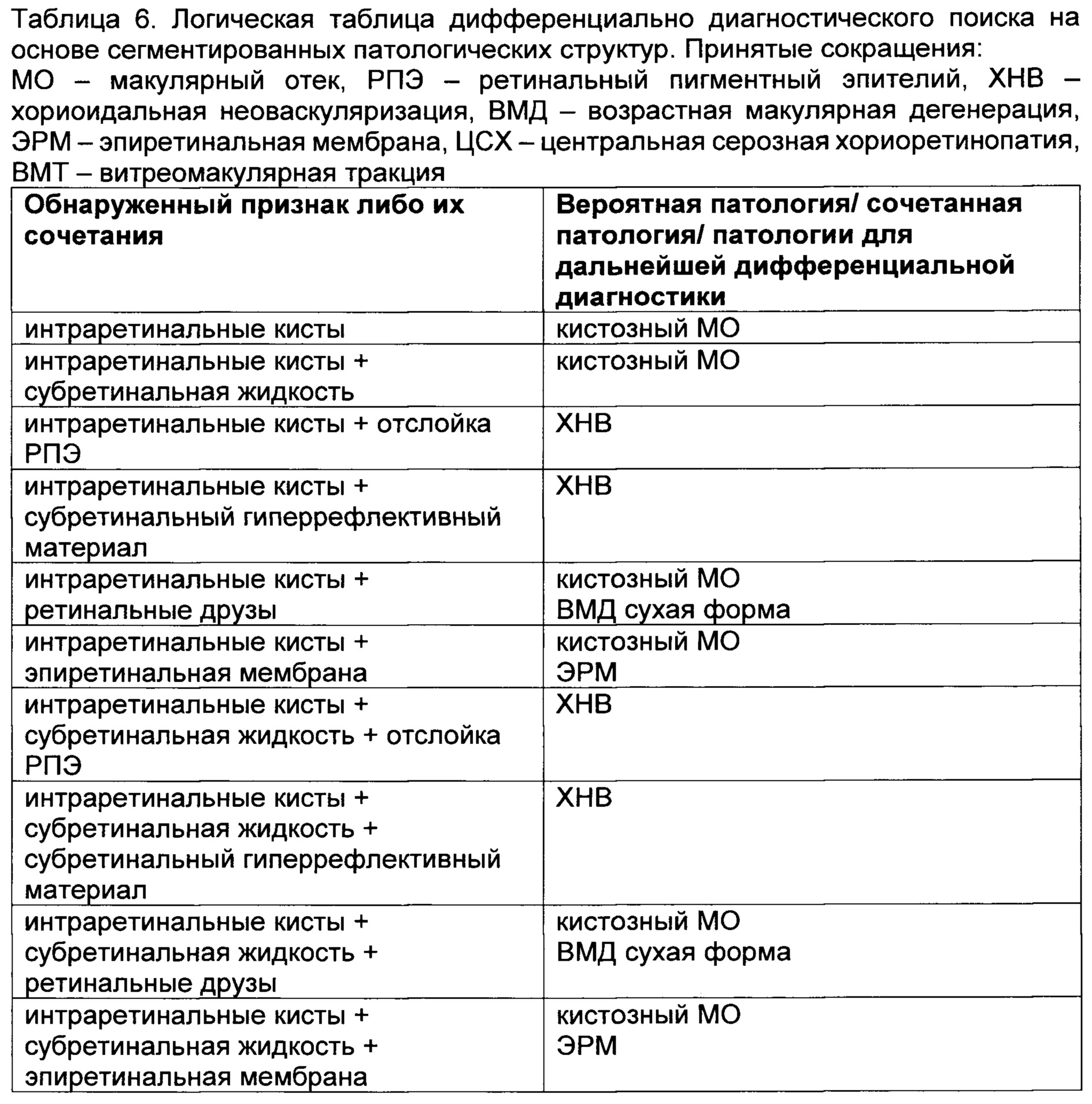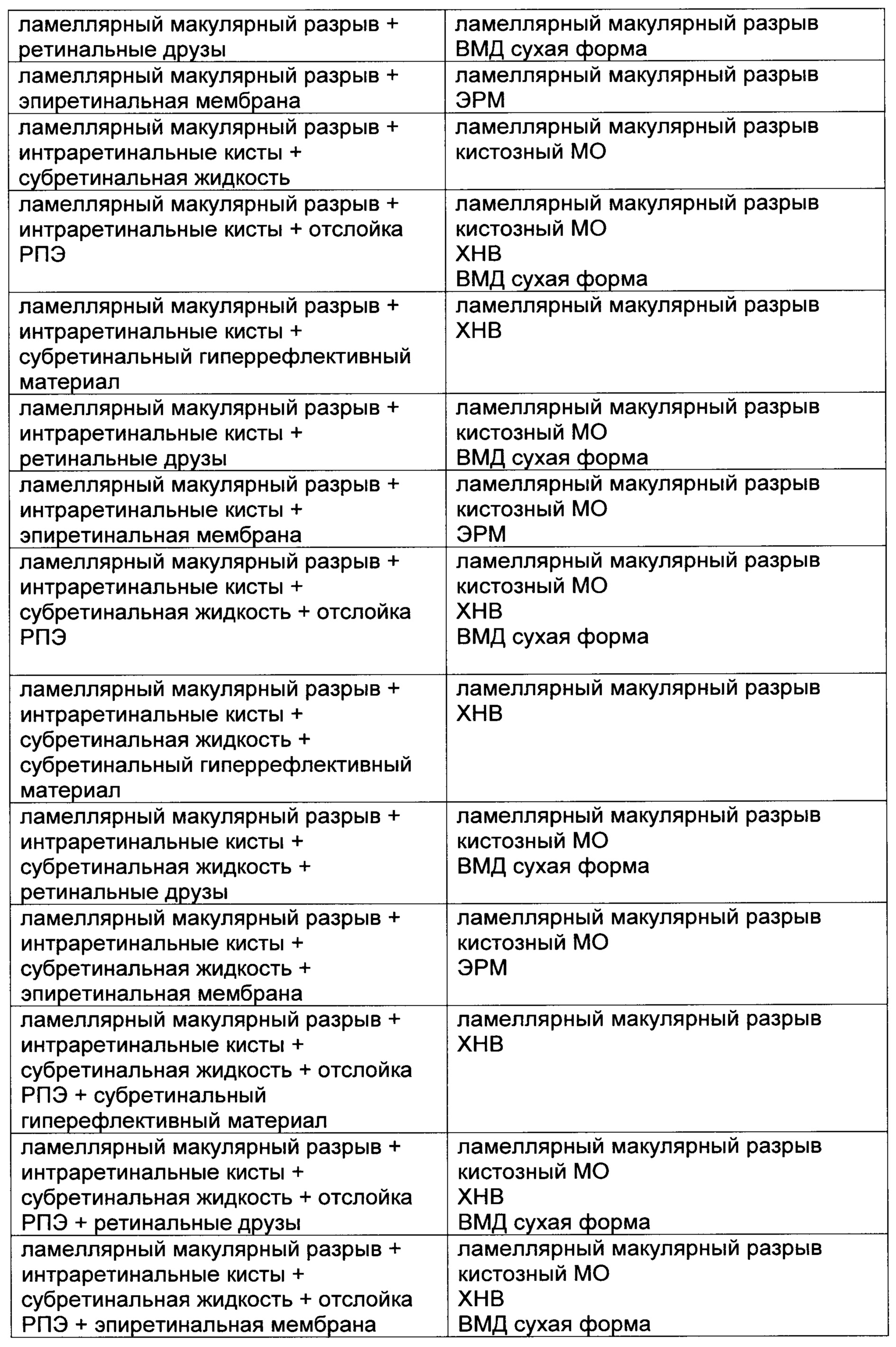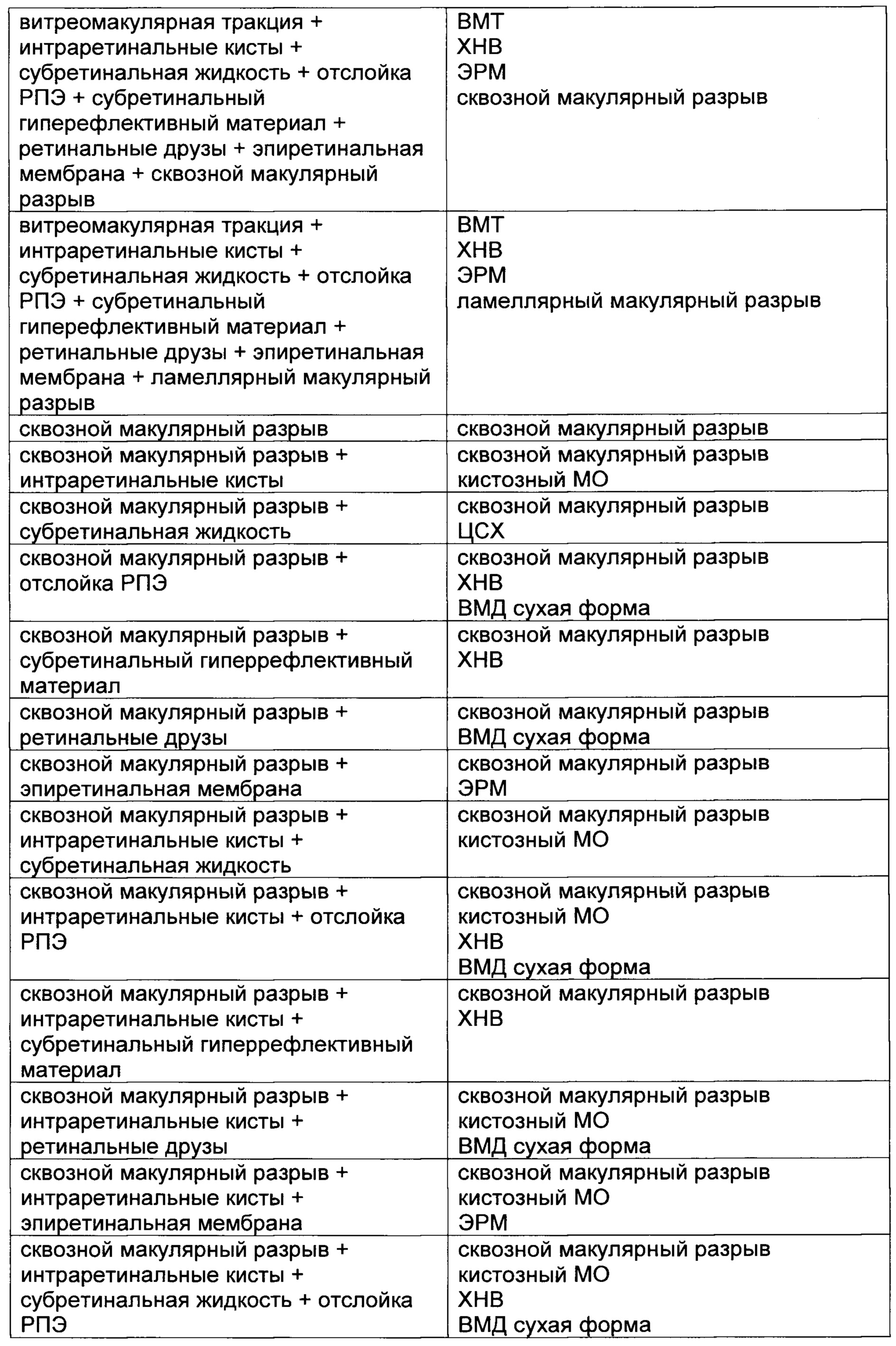 Изобретение относится к системам поддержки принятия врачебных решений (СППВР) и может применяться для визуализации патологических структур, слоев сетчатки глаза и зон разрушения слоев сетчатки на сканах структурной оптической когерентной томографии (ОКТ). На основе наличия и сочетаний обнаруженных патологических признаков осуществляется дифференциально-диагностический поиск наиболее вероятной патологии, либо сочетания патологий. На основе сегментации слоев сетчатки осуществляется поиск зон разрушения слоев сетчатки с целью определения зрительного прогноза пациента. Алгоритм визуализации включает следующие патологические структуры: интраретинальные кисты, субретинальная жидкость, отслойка ретинального пигментного эпителия, субретинальный гиперрефлективный материал, ретинальные друзы, эпиретинальная мембрана, витреомакулярная тракция, сквозной макулярный разрыв, ламеллярный макулярный разрыв. Алгоритм дифференциально-диагностического поиска включает следующие заболевания: диабетический макулярный отек, кистозный макулярный отек, возрастная макулярная дегенерация (сухая форма и хориоидальная неоваскуляризация), центральная серозная хориоретинопатия, аномалии витреомакулярного интерфейса (витреомакулярная тракция, эпиретинальная мембрана, сквозной макулярный разрыв, ламеллярный макулярный разрыв). Алгоритм визуализации слоев сетчатки включает следующие слои: слой нервных волокон, комплекс ганглиозных клеток и внутреннего плексиформного слоя, внутренний ядерный слой, наружный плексиформный слой, комплекс волокон Генле и наружного ядерного слоя, наружная пограничная мембрана, миоидная зона фоторецепторов, эллипсоидная зона фоторецепторов, наружные сегменты фоторецепторов, комплекс ретинального пигментного эпителия и мембраны Бруха, ретинальный пигментный эпителий, мембрана Бруха. Алгоритм поиска зон разрушения слоев сетчатки включает следующие признаки: дезорганизация внутренних слоев сетчатки, деструкция эллипсоидной зоны фоторецепторов, деструкция наружной пограничной мембраны, атрофия ретинального пигментного эпителия. По данным Всемирной организации здравоохранения (ВОЗ), 422 млн человек в мире страдают сахарным диабетом (СД) [1]. Прогнозируемое число больных к 2040 г. составляет 645 миллионов [2]. Диабетическая ретинопатия (ДР) и диабетический макулярный отек (ДМО) являются офтальмологическими осложнениями СД, ведущими (при отсутствии лечения) к слепоте и инвалидности по зрению. Каждый пациент с СД, в зависимости от наличия и тяжести ДР и ДМО, нуждается в офтальмологическом обследовании от одного раза в 2 года до 12 раз в год [3]. Это создает большую нагрузку на систему здравоохранения. Разработка программ скрининга остается серьезной проблемой даже для стран с высокими ресурсами. Согласно исследованиям, около половины пациентов с СД остаются недостаточно диагностированными [4]. ВОЗ рассматривает программы скрининга и раннего выявления патологии как наиболее эффективный инструмент борьбы со слепотой и слабовидением вследствие ДР и ДМО [5]. Возрастная макулярная дегенерация (ВМД) - это хроническое прогрессирующее заболевание, которое характеризуется поражением центральных отделов сетчатки глаза с необратимой потерей центрального зрения. На сегодняшний день в мире насчитывается 170 м