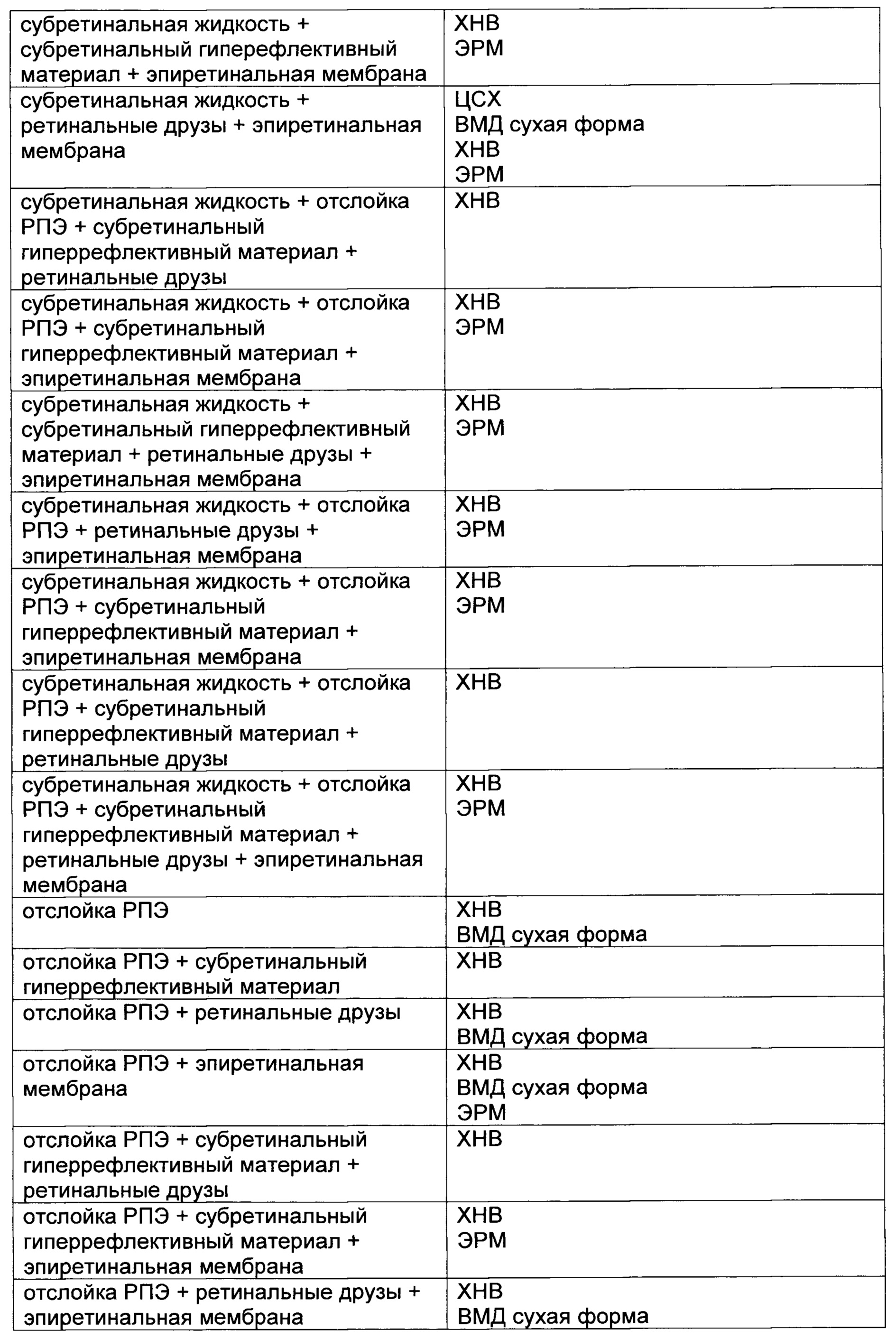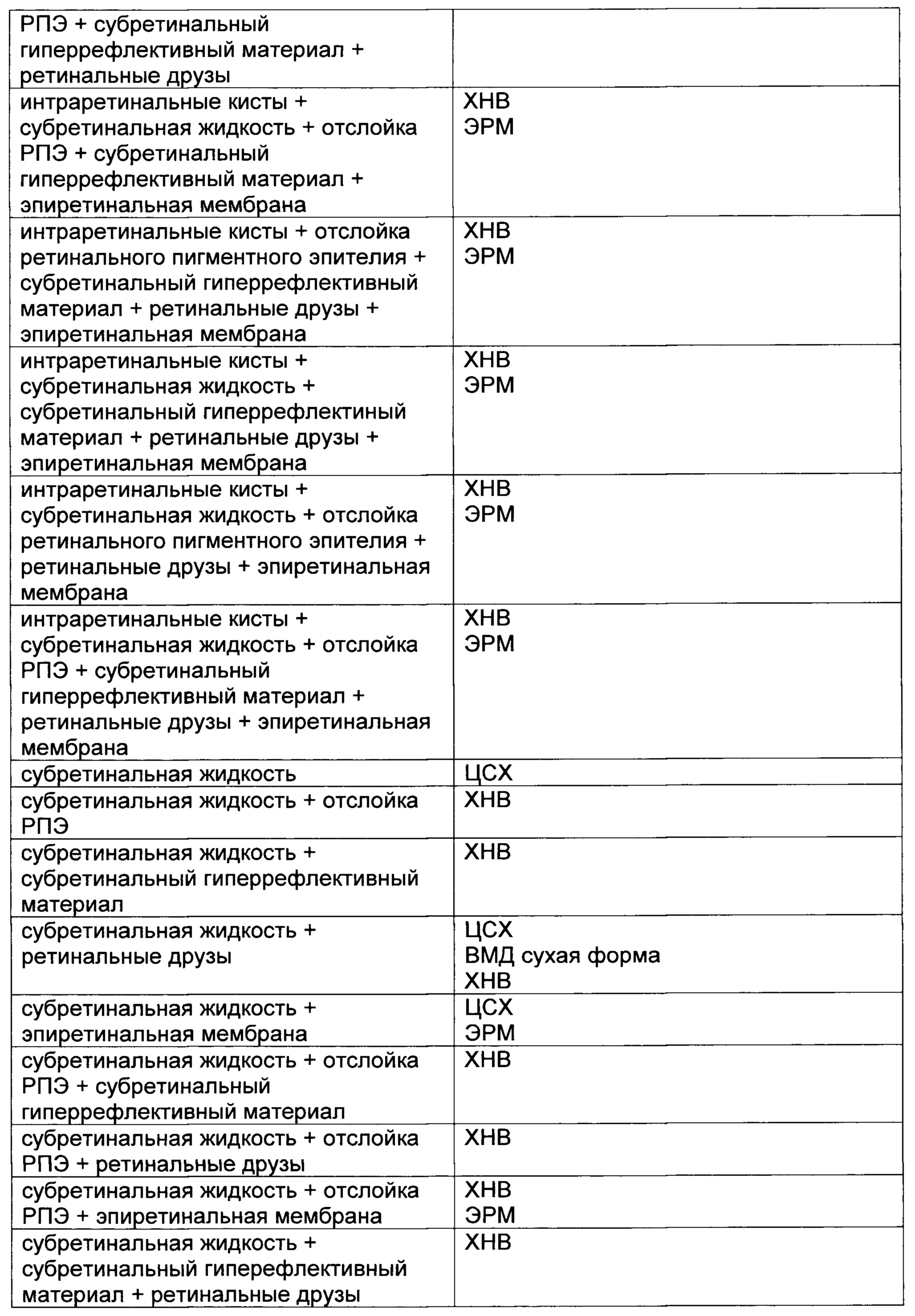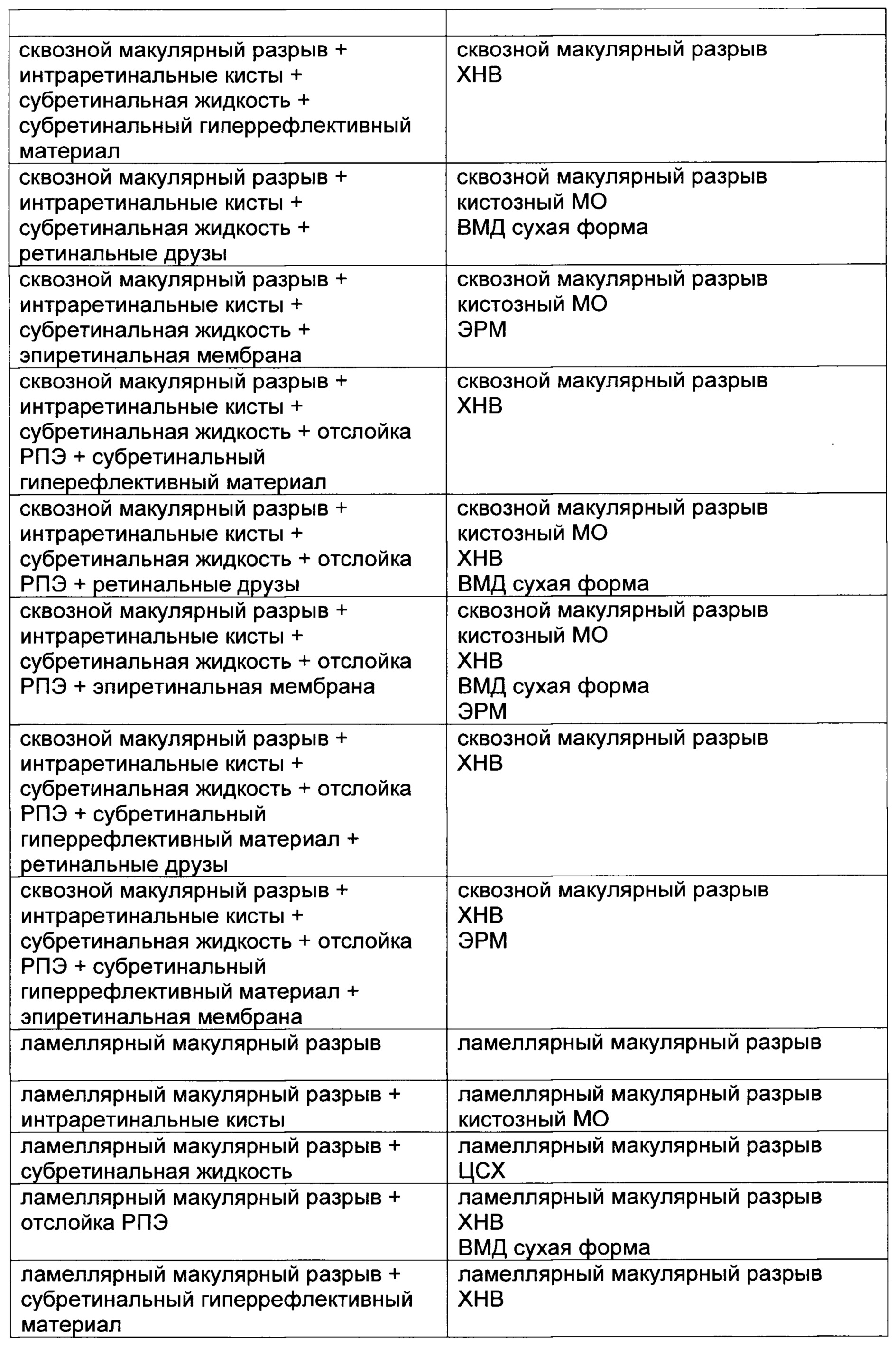 Изобретение относится к системам поддержки принятия врачебных решений (СППВР) и может применяться для визуализации патологических структур, слоев сетчатки глаза и зон разрушения слоев сетчатки на сканах структурной оптической когерентной томографии (ОКТ). На основе наличия и сочетаний обнаруженных патологических признаков осуществляется дифференциально-диагностический поиск наиболее вероятной патологии, либо сочетания патологий. На основе сегментации слоев сетчатки осуществляется поиск зон разрушения слоев сетчатки с целью определения зрительного прогноза пациента. Алгоритм визуализации включает следующие патологические структуры: интраретинальные кисты, субретинальная жидкость, отслойка ретинального пигментного эпителия, субретинальный гиперрефлективный материал, ретинальные друзы, эпиретинальная мембрана, витреомакулярная тракция, сквозной макулярный разрыв, ламеллярный макулярный разрыв. Алгоритм дифференциально-диагностического поиска включает следующие заболевания: диабетический макулярный отек, кистозный макулярный отек, возрастная макулярная дегенерация (сухая форма и хориоидальная неоваскуляризация), центральная серозная хориоретинопатия, аномалии витреомакулярного интерфейса (витреомакулярная тракция, эпиретинальная мембрана, сквозной макулярный разрыв, ламеллярный макулярный разрыв). Алгоритм визуализации слоев сетчатки включает следующие слои: слой нервных волокон, комплекс ганглиозных клеток и внутреннего плексиформного слоя, внутренний ядерный слой, наружный плексиформный слой, комплекс волокон Генле и наружного ядерного слоя, наружная пограничная мембрана, миоидная зона фоторецепторов, эллипсоидная зона фоторецепторов, наружные сегменты фоторецепторов, комплекс ретинального пигментного эпителия и мембраны Бруха, ретинальный пигментный эпителий, мембрана Бруха. Алгоритм поиска зон разрушения слоев сетчатки включает следующие признаки: дезорганизация внутренних слоев сетчатки, деструкция эллипсоидной зоны фоторецепторов, деструкция наружной пограничной мембраны, атрофия ретинального пигментного эпителия. По данным Всемирной организации здравоохранения (ВОЗ), 422 млн человек в мире страдают сахарным диабетом (СД) [1]. Прогнозируемое число больных к 2040 г. составляет 645 миллионов [2]. Диабетическая ретинопатия (ДР) и диабетический макулярный отек (ДМО) являются офтальмологическими осложнениями СД, ведущими (при отсутствии лечения) к слепоте и инвалидности по зрению. Каждый пациент с СД, в зависимости от наличия и тяжести ДР и ДМО, нуждается в офтальмологическом обследовании от одного раза в 2 года до 12 раз в год [3]. Это создает большую нагрузку на систему здравоохранения. Разработка программ скрининга остается серьезной проблемой даже для стран с высокими ресурсами. Согласно исследованиям, около половины пациентов с СД остаются недостаточно диагностированными [4]. ВОЗ рассматривает программы скрининга и раннего выявления патологии как наиболее эффективный инструмент борьбы со слепотой и слабовидением вследствие ДР и ДМО [5]. Возрастная макулярная дегенерация (ВМД) - это хроническое прогрессирующее заболевание, которое характеризуется поражением центральных отделов сетчатки глаза с необратимой потерей центрального зрения. На сегодняшний день в мире насчитывается 170 м