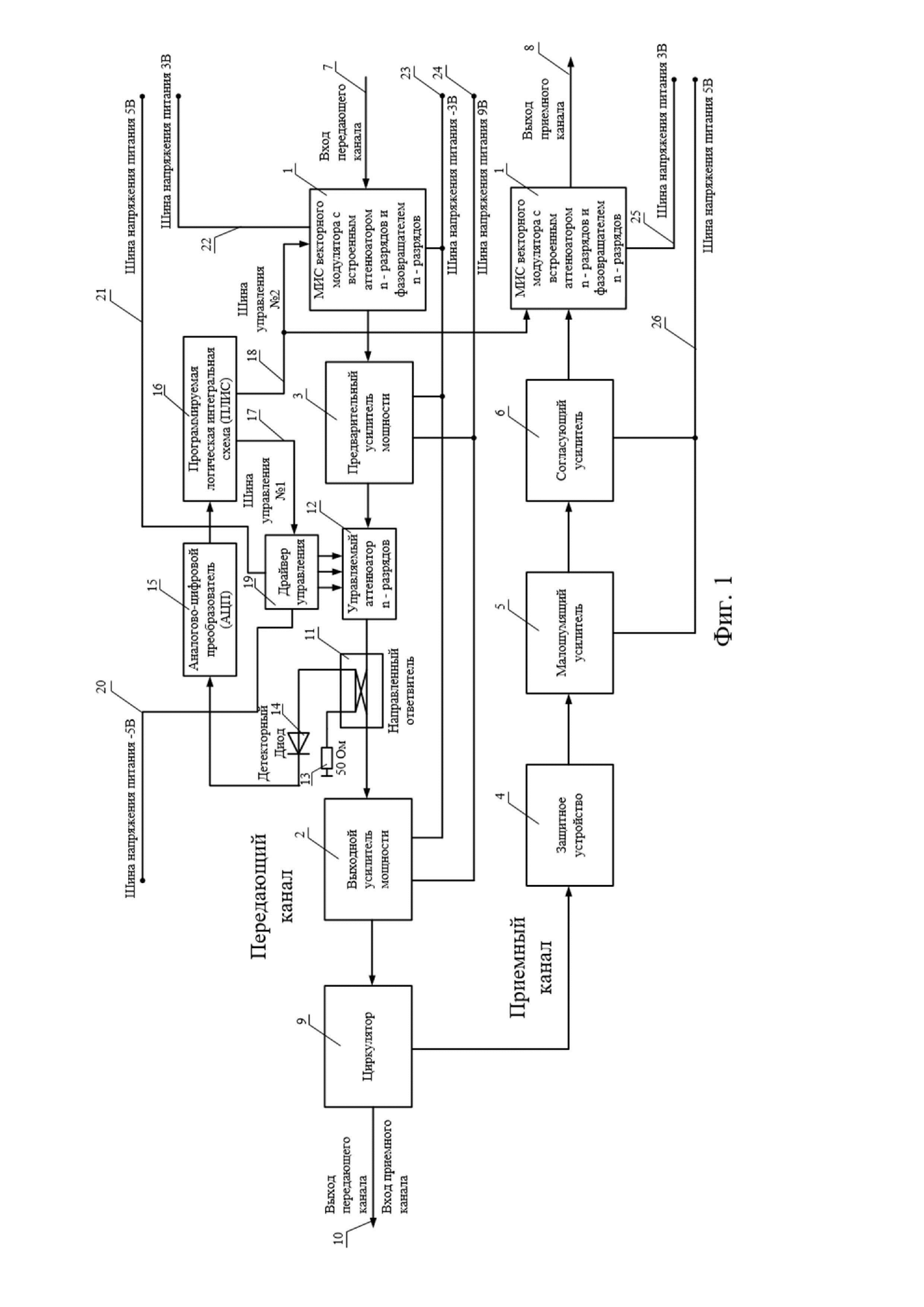 Приемо-передающий модуль активной фазированной антенной решетки X-диапазона частот, содержащий передающий и приемный каналы, включающие циркулятор, модулятор с аттенюатором n-разрядов и фазовращателем n-разрядов, при этом передающий канал включает выходной усилитель мощности, предварительный усилитель мощности, а приемный канал включает защитное устройство, малошумящий усилитель и согласующий усилитель, отличающийся тем, что каждый модулятор выполнен в виде монолитной интегральной схемы (МИС) векторного модулятора со встроенными аттенюатором n-разрядов и фазовращателем n-разрядов, причем вход МИС передающего канала является его входом, выход МИС приемного канала является его выходом, вход МИС приемного канала подключен через согласующий усилитель к малошумящему усилителю, вход которого соединен с выходом защитного устройства, а вход которого соединен с выходом циркулятора, второй выход которого является входом приемного канала и выходом передающего канала, вход циркулятора соединен с выходом выходного усилителя мощности, ко входу которого подключен выход направленного ответвителя, а вход которого подключен к выходу управляемого аттенюатора n-разрядов, вход которого подключен к выходу предварительного усилителя мощности, вход которого соединен с МИС передающего канала, ответвляющая часть направленного ответвителя содержит согласованную нагрузку с волновым сопротивлением 50 Ом и детекторный диод, к выходу которого подключен вход аналогово-цифрового преобразователя, выход которого подключен к входу программируемой логической интегральной схемы, имеющей две шины управления, к первой подключен вход драйвера управления, выходы которого соединены со входами управляемого аттенюатора n-разрядов, а ко второй шине управления подключены входы управления МИС приемного и передающего каналов, при этом каждый активный элемент имеет шину напряжения питания.