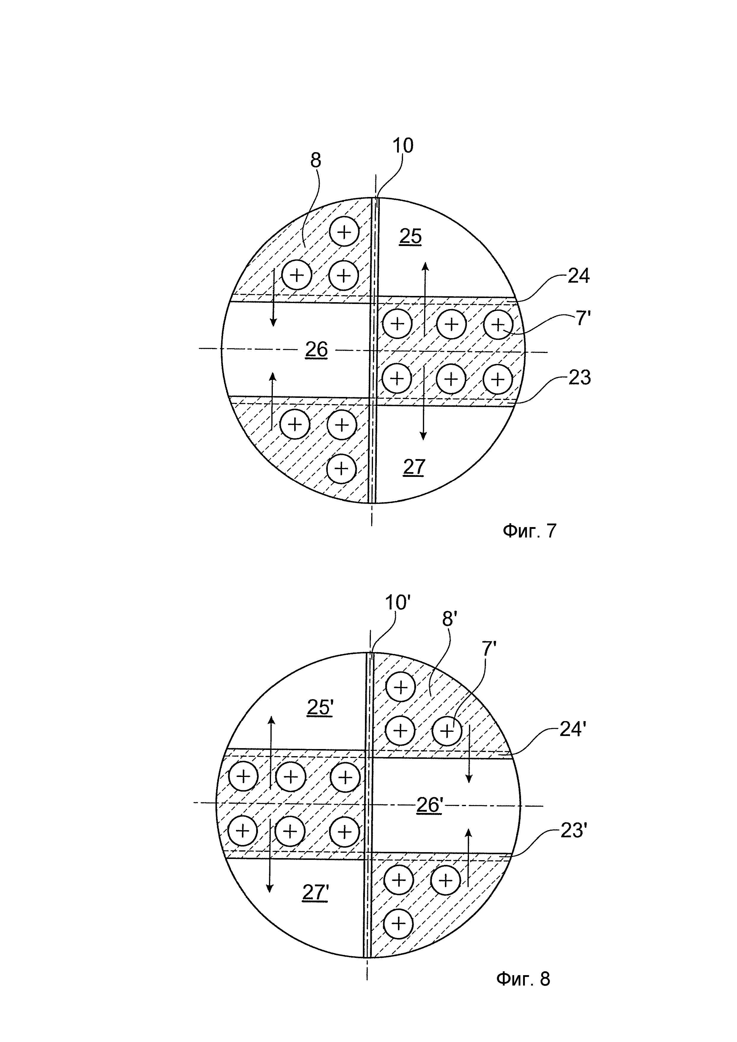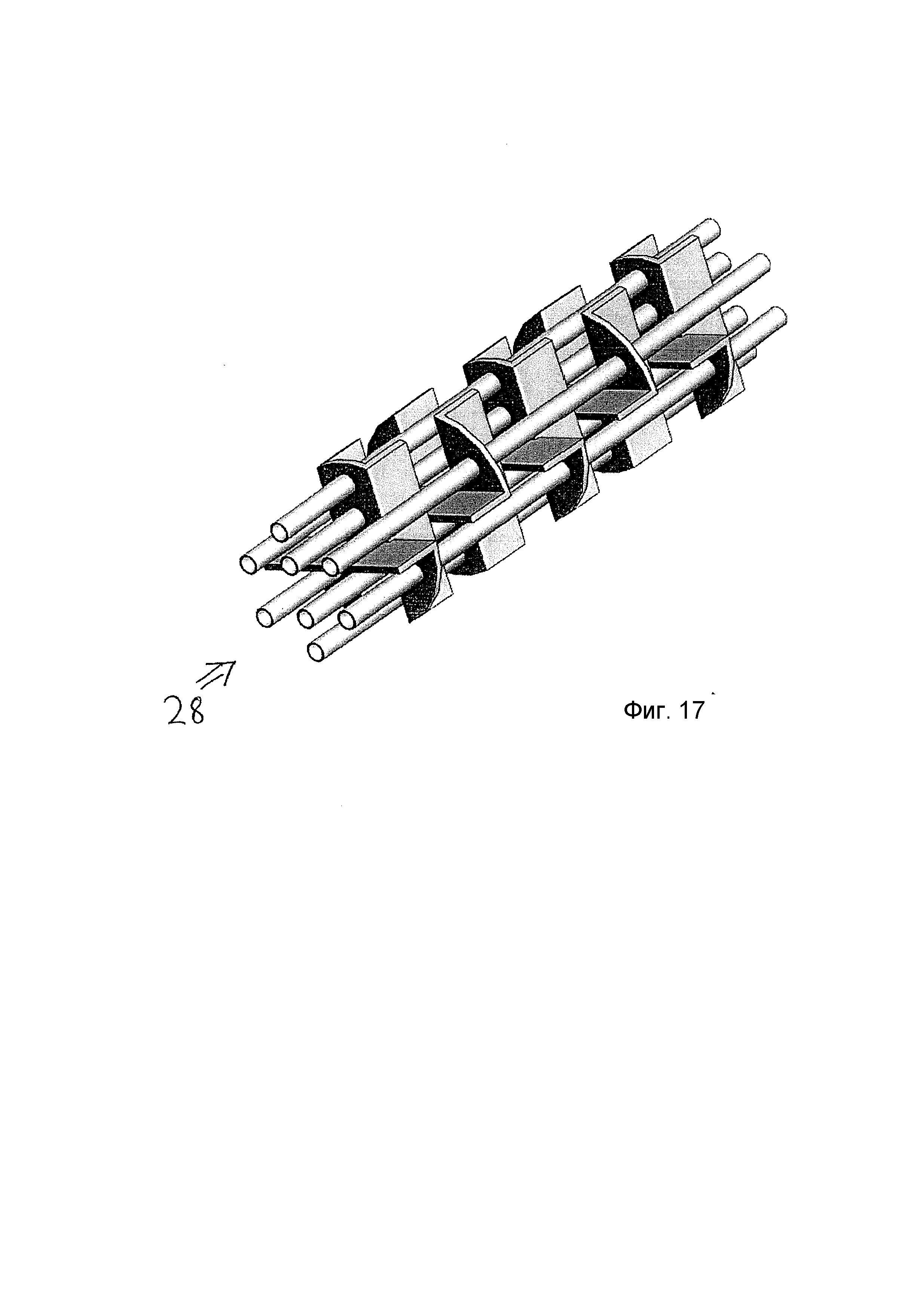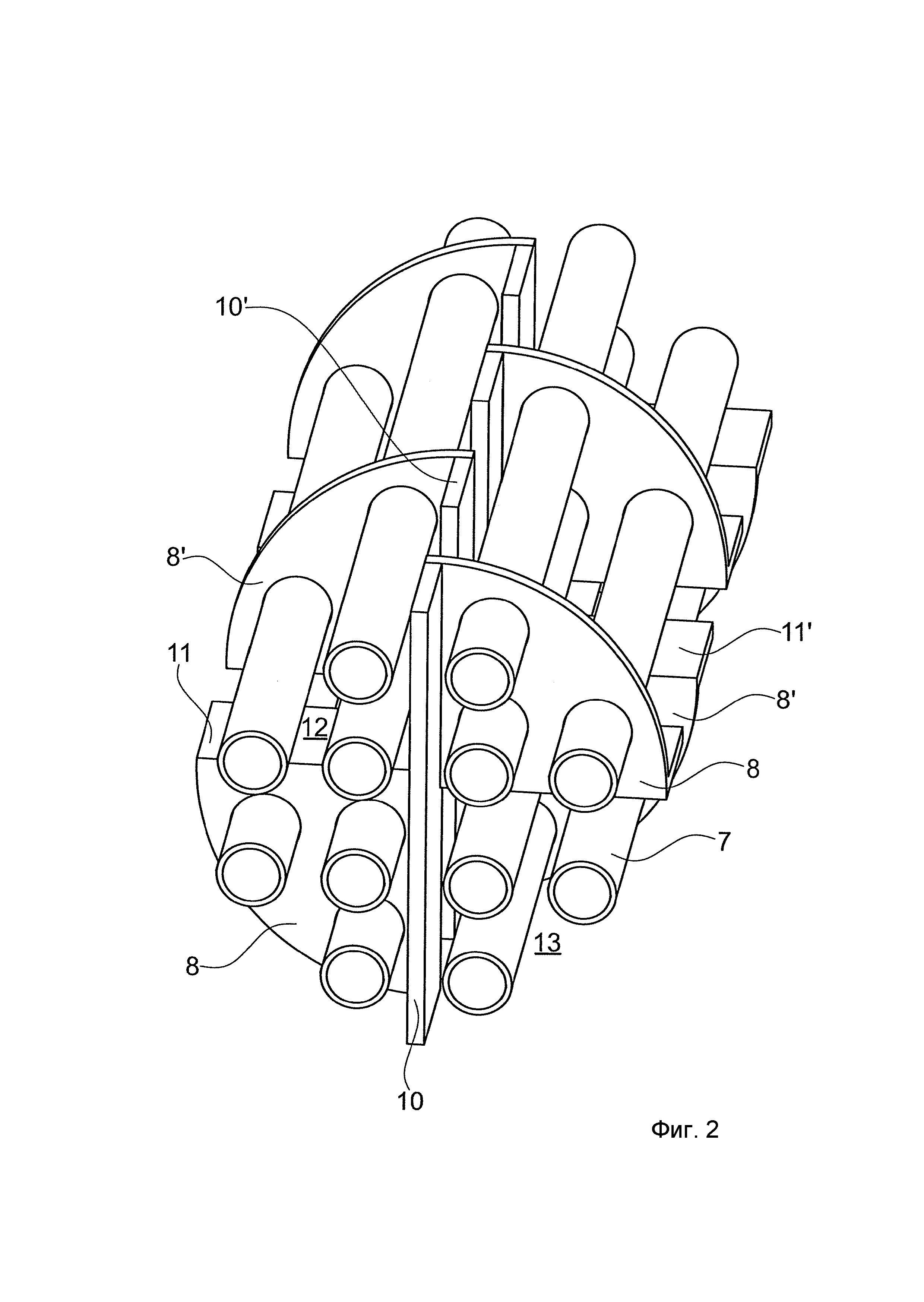 Изобретение относится к секционному теплообменнику, имеющему узлы (которые могут, но не должны быть выполнены в виде встроенных элементов), выполненные из отклоняющих поверхностей и направляющих перегородок в межтрубном пространстве, согласно ограничительной части пункта 1 формулы изобретения 1. Поскольку секционные теплообменники в большинстве случаев изготавливаются из металлического материала, часто говорят об отклоняющих листах вместо отклоняющих поверхностей. В настоящем описании, напротив, используется понятие "отклоняющие поверхности", чтобы пояснить, что возможность их применения не ограничена теплообменниками из металлического материала. Секции могут состоять из труб, по которым проводят теплопередающую среду (например, теплоноситель или хладагент, нагреваемый или охлаждаемый циркулирующим в межтрубном пространстве продуктом). Вместо этого, однако, могут применяться другие объединенные в секции теплообменные элементы, например, электрические нагревательные стержни, электрические нагревательные змеевики и т.п. В дальнейшем для большей простоты изложения говорится о "трубах" или "трубных секциях", причем, тем не менее, согласно сказанному подразумевается, что под этим понимаются также другие элементы теплообмена удлиненной формы, такие, как нагревательные стержни. Обычная конструкция отклоняющих листов или, соответственно, поверхностей служит для направления потока, проводя поток текучей среды в межтрубном пространстве частично под углом к направлению труб и частично параллельно им. Эти листы содержат отверстия в соответствии с расстоянием между трубами, установлены перпендикулярно трубам и содержат окна в форме сегментов для прохождения текучей среды в осевом направлении. Другие известные варианты осуществления состоят попеременно из дисков и колец. Они устанавливаются при турбулентном (для текучих сред с низкой вязкостью) и ламинарном (для вязких текучих сред) потоке в стандартном исполнении. Относительно других деталей функционирования и конструкции приводится ссылка на Теплотехнический Атлас Союза немецких инженеров (6-е издание), разделы Gg5 и Ob7. Эти отклоняющие поверхности улучшают передачу тепла посредством более или менее выраженного потока, направленного под углом к трубам. Однако они не вызывают перемешивания текучей среды. Это относится особенно к ламинарному потоку вязких текучих сред. Поскольку этих материалы вследствие их свойств имеют более низкие коэффициенты теплопередачи, желательно их прохождение вокруг труб (Теплотехнический Атлас VDI, раздел Ob4). Для вязких средств, которые требуется охлаждать или нагревать, вязкость может существенно изменяться с изменением температуры. Наконец, частичные потоки, которые имеют различные истории изменения температуры во времени (пути прохождения потока), имеют существенно различающиеся свойства. Это особенно относится к вязкости. Отсутствие постоянного перемешивания ведет к образованию предпочтительных путей и мертвых зон, так называемому неправильному распределению. Это может приводить к полному отказу теплообменника, но также и к ухудшению свойств изделия. Схожие проблемы имеют место, если теплообменник должен применяться для в качестве реактора полимеризации или других экзотермических реакции для вязких текучих материал