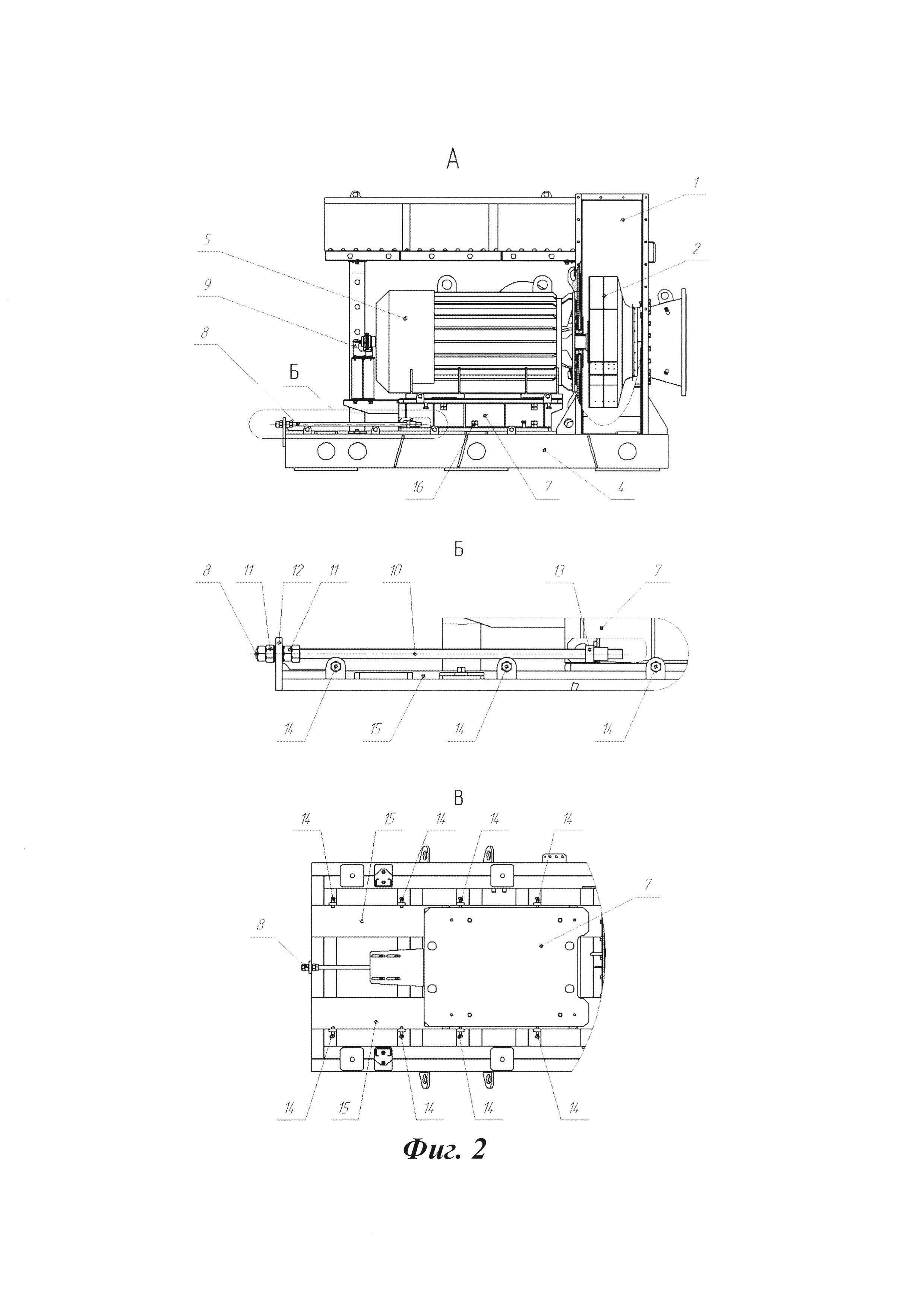 Вентилятор центробежный газовый для удаления метановоздушных смесей (ВЦГ), состоящий из спирального корпуса, основной рамы, закрепленного на ней подрамника электродвигателя, электродвигателя, рабочего колеса, отличающийся тем, что спиральный корпус выполнен неразборным и жестко закреплен на основной раме, подрамник электродвигателя оснащен механизмом перемещения, состоящим из винта перемещения подрамника, гаек ограничительных, упорной пластины, прикрепленной к раме, резьбовой втулки, вваренной в подрамник электродвигателя, рабочее колесо выполнено облегченным из высокопрочной легированной стали, полости лопаток которого заполнены жестким двухкомпонентным пенополиуретаном высокой плотности с закрытой ячеистой структурой, при этом рабочее колесо закреплено непосредственно на валу электродвигателя, к электродвигателю прикреплен фланец, являющийся частью спирального корпуса, электродвигатель установлен на подрамник электродвигателя, а токосъемное устройство снятия статического электричества выполнено в виде металло-графитовой щетки, закрепленной в щеткодержателе и прижатой им к контактной шайбе, выполненной из латуни либо меди и прикрепленной к торцу второго конца вала электродвигателя прижимными болтами.
