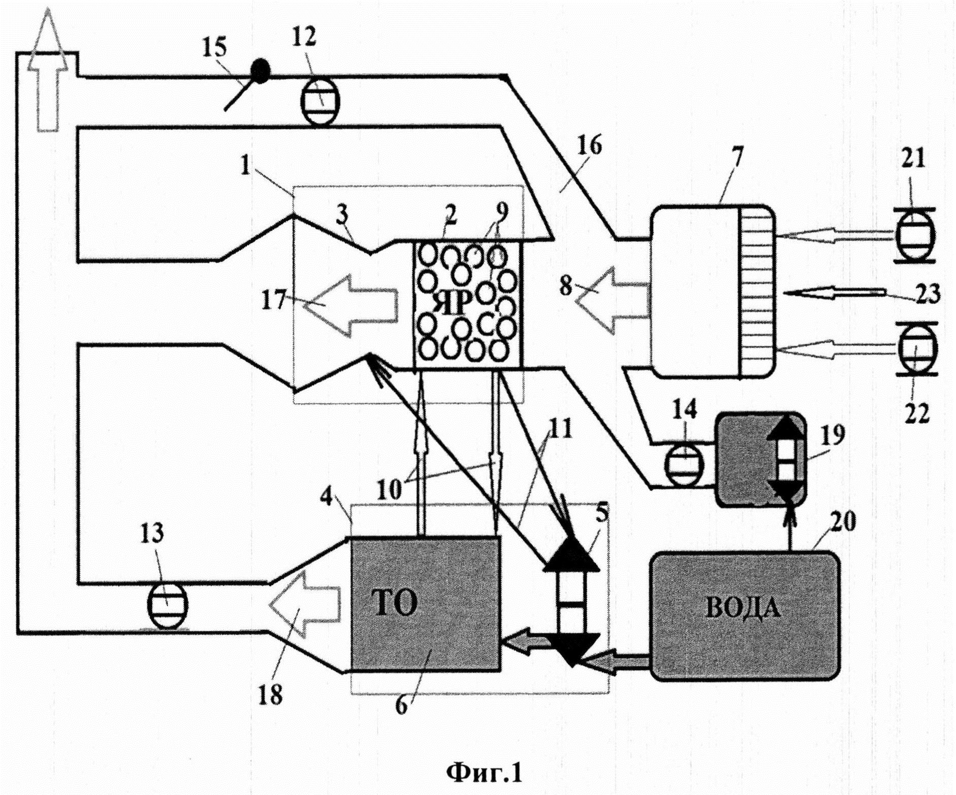 Область техники Изобретение относится к области ракетной техники, а именно к ракетным двигателям с ядерным источником нагревания рабочего тела, в частности воды, в ядерном реакторе, и может найти применение в ракетно-космической области. Наиболее эффективно использование изобретения в области энергомашиностроения и предназначено для осуществления испытаний энергоустановок ядерных ракетных двигателей (ЯРД) с последующим проведением контроля параметров в составе космического аппарата в космосе. Уровень техники Во время наземных испытаний ЯРД необходимо подтвердить соответствие, полученных параметров, заданных в техническом задании на изделие. Необходимо получить информацию о развиваемой тяге, распределение температур по конструкции ЯРД, стойкости материалов к температуре до 3000К и газовому потоку, работу системы съема остаточного тепловыделения в реакторе, работу теплообменника-испарителя рабочего тела воды и его производительность, работу приводов системы управления и защиты (СУЗ) при разогреве и многое другое. Известен способ создания реактивной тяги (патент РФ №2064086) за счет выбрасывания из сопла двигателя в окружающее пространство высокоэнергетических осколков деления, образующихся в ЯРД, в котором в разреженной плазме делящегося вещества протекает реакция резонансного деления движущегося делящегося вещества с тепловыми нейтронами. Недостатками прототипа являются: наличие очень большого количества опасных и токсичных делящихся веществ, например,239Pu в количестве нескольких кг/час, выбрасываемых в окружающую среду, что не приемлемо и запрещено правилами использования ядерной энергии на Земле. Известен способ получения результатов реальных процессов в ракетном двигателе путем соответствующего пересчета испытаний модели при условии, что модель подобна натуре. Модель подобна натуре, если будут соблюдены следующие три условия: - обеспечено геометрическое подобие модели и натуры; - физические константы модели пропорциональны соответствующим константам натурного процесса; - критерии подобия для натуры и модели равны между собой. Вполне естественно, что точное соблюдение всех условий подобия возможно лишь в очень редких случаях, поэтому на практике все чаще прибегают к методам приближенного подобия при моделировании сложных физических процессов. Модельные испытания не исключают натурные, но позволяют решить ряд задач, в результате которых можно значительно сократить экономические затраты на экспериментальную отработку и создание экспериментальной базы. Стенд модельных испытаний включает: огневой бокс для размещения объекта испытания на специальной силовой раме, силоизмерительное устройство, расходные и сливные емкости рабочего тела (горючего и окислителя), баллоны со сжатыми газами, стендовое оборудование, аппаратуру измерения и управления, систему вентиляции, насосные агрегаты, систему энергоснабжения и др. /А.Г. Галеев, В.Н. Иванов, А.В. Катенин, В.А. Лисейкин, В.П. Пикетов, А.Д. Поляхов, Г.Г. Сайдов, А.А. Шибанов. МЕТОДОЛОГИЯ ЭКСПЕРИМЕНТАЛЬНОЙ ОТРАБОТКИ ЖРД И ДУ, ОСНОВЫ ПРОВЕДЕНИЯ ИСПЫТАНИЙ И УСТРОЙСТВА ИСПЫТАТЕЛЬНЫХ СТЕНДОВ. Монография Подписано к исп. 12.01.2015 г. Усл. пен.л. 27,3. Тираж 1000 экз. Заказ 010-М Киров, МЦНИП http://mcnip.ru e-mail: izdatel@mcnip.ru/. Недостатком данного способа является то, что он не позволяет п