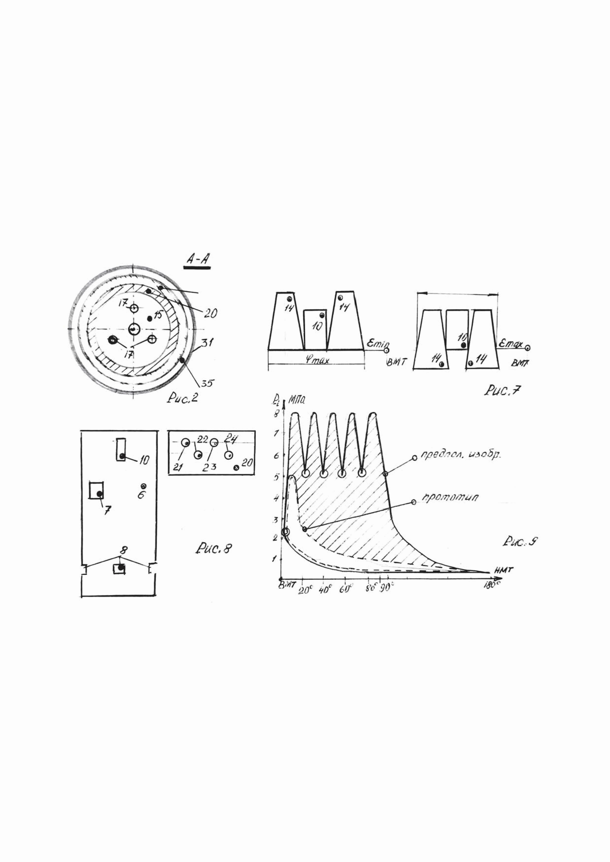 Бензин.Предлагаемое изобретение 1 Диаметр поршня, Дп в мм 50 50 2 Ход поршня, Хп в мм 65 100 3 Хп/Дп 1,3 2,0 4 Степень сжатия, СС 9 20 5 Топливо АИ 92 АИ 92 6 Ринд. макс., МПа 4 9 7 Индикаторная Мощность, N, кВт 10 30 8 Удельный расход топлива g, грамм/квт 280 гр/кВт 120 гр/кВт 9 Продолжительность в град об. Двигателя воздействия Р и выше 5 мПа 0 град. 1 ад.