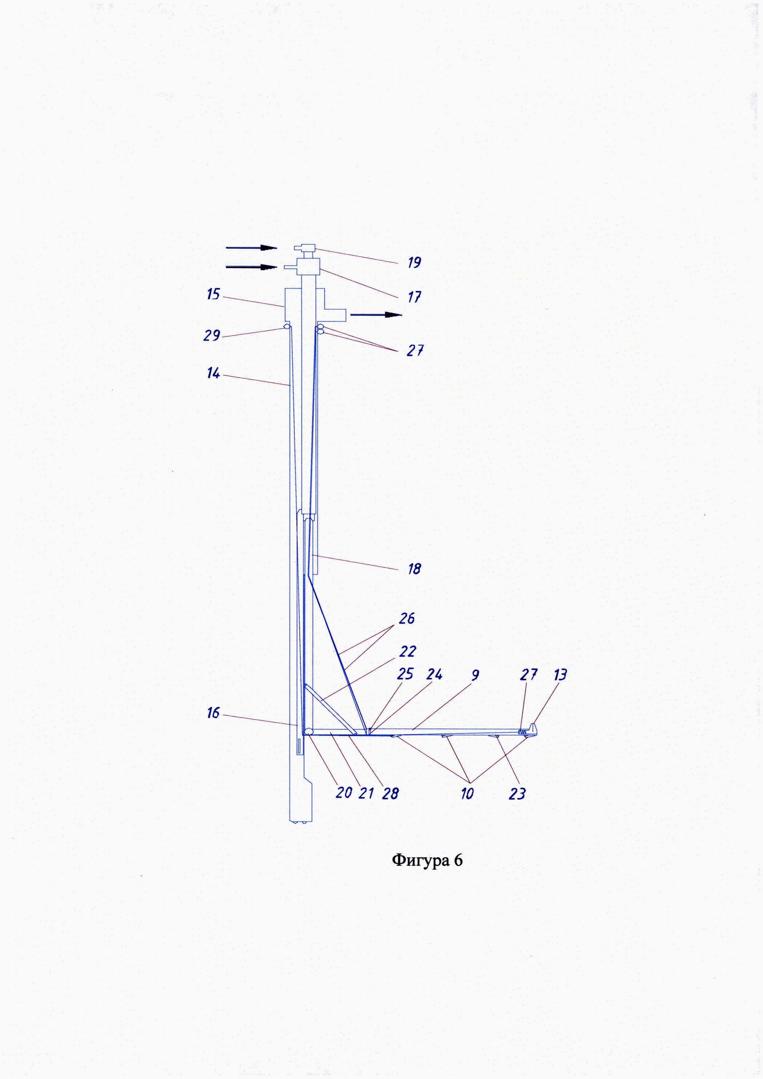 Предлагаемое техническое решение относится к горному делу и может быть использовано при разработке твердых полезных ископаемых способом скважинной гидродобычи, в строительном деле при сооружении через скважины подземных хранилищ в осадочных горных породах. Известен способ скважинной гидродобычи полезных ископаемых, включающий отработку полигона круглыми в плане камерами с оставлением устойчивых межкамерных целиков, при котором радиус камеры последовательно увеличивается при круговом размыве сменными гидромониторными стволами [1]. Устройство для реализации данного способа представляет собой скважинный эрлифтно-гидромониторный снаряд, состоящий из пульповой, воздушной и водяной труб, в котором на нижнем конце водяной трубы установлено шарнирное колено со сменными гидромониторными стволами различной длины [2]. Недостатки данного способа и устройства для его осуществления заключаются в больших потерях полезного ископаемого в межкамерных целиках (40%) и затратах времени на демонтаж и монтаж скважинного снаряда для замены сменных гидромониторных стволов. Наиболее близким к заявленному техническому решению, относящемуся к способу скважинной гидродобычи полезных ископаемых, является отработка полигона рядами круглых в плане подземных камер с оставлением междурядных целиков, которые отрабатываются после гидравлической закладки ранее отработанных рядов скважин [3]. При этом размывают полусферическую камеру при выводе ствола из вертикального в горизонтальное положение. Известно устройство для реализации данного способа, в котором на нижнем конце водяной трубы установлено шарнирное колено и длинный гидромониторный ствол с боковыми насадками, обеспечивающими размыв вдоль ствола в вертикальной плоскости и смыв разрушенных пород в сторону приемного устройства эрлифта [4]. Недостатки указанного способа и устройства для его осуществления заключаются в низкой эффективности, связанной с затратами на гидравлическую закладку рядов отработанных подземных камер, и большом разубоживании (в 3-4 раза), при отработке маломощных пластов полезного ископаемого в результате размыва полусферической камеры, так как размыв маломощного продуктивного пласта в горизонтальном положении гидромониторного ствола и круговом вращении скважинного снаряда, когда боковые насадки направлены вниз, невозможен. Решаемая задача заключается в повышении эффективности скважинной гидродобычи полезных ископаемых и дистанционности при управлении работой устройства. При этом снижаются затраты на добычу полезных ископаемых за счет сокращения времени выполнения операций и разубоживания полезного ископаемого благодаря избирательной выемки пород продуктивного пласта, увеличивается извлечение полезного ископаемого в результате управления процессом посадки кровли продуктивного пласта. Кроме этого, конструкция устройства обеспечивает дистанционность управления скважинным снарядом в процессе добычи. Достижение технического результата обеспечивается при использовании известного способа, включающего бурение рядов технологических скважин, последовательный монтаж скважинного снаряда с гидромониторным стволом в вертикальном положении, отработку полигона рядами круглых в плане подземных камер путем размыва полусферического секто