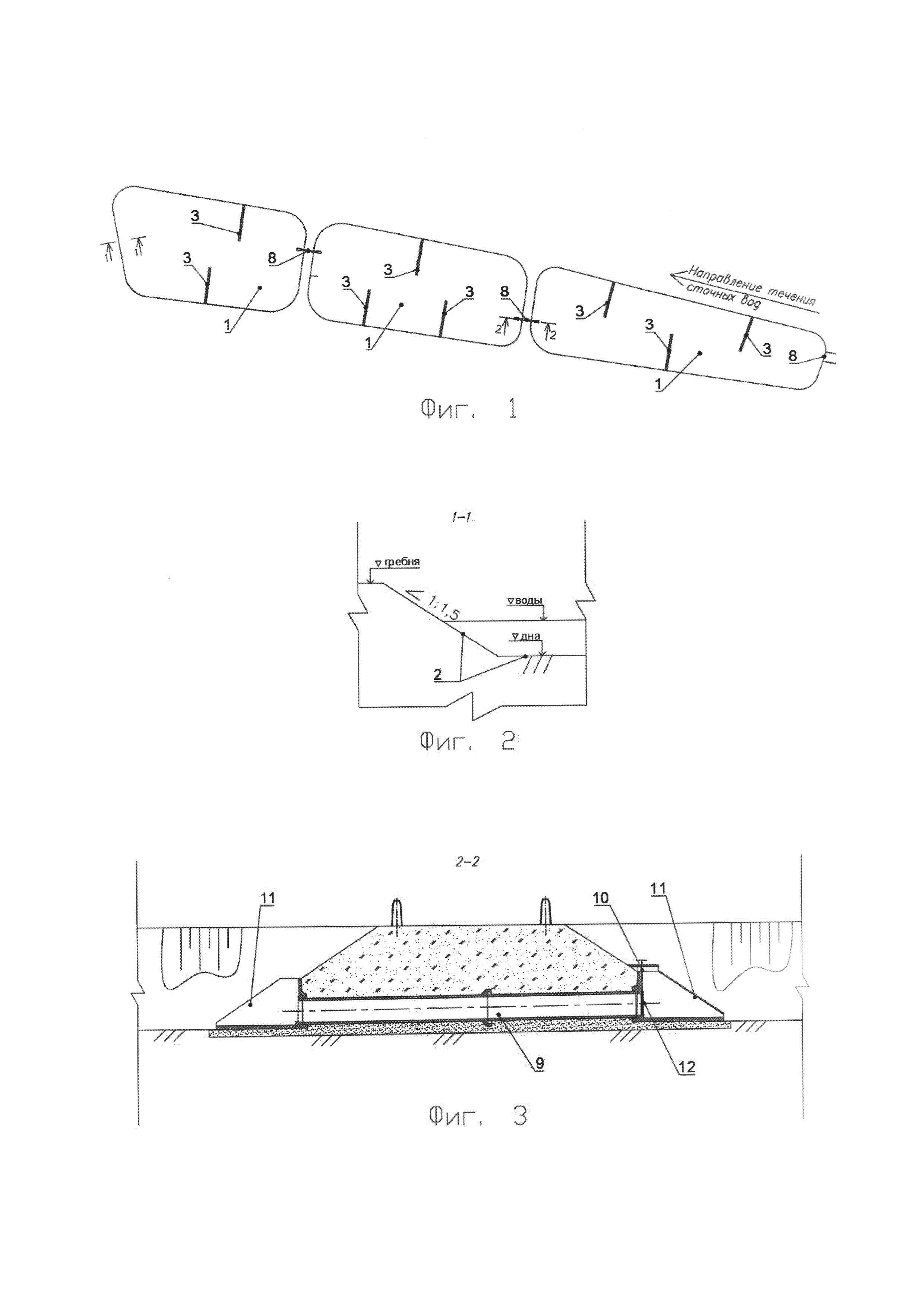 Пруд-испаритель дренажного стока, состоящий из трех отсеков, покрытых гидроизоляционной полиэтиленовой мембраной, используются для интенсивного испарения, гидравлически связанных между собой и подводящим каналом через регулирующие устройства, один из отсеков использован для аккумуляции, отличающийся тем, что отсеки расположены последовательно, и каждый из них снабжен струенаправляющими шпорами, выполненными из десяти фильтрующих устройств, установленных в ряд для образования змеевидного течения, шпоры расположены в отсеках в шахматном порядке с примыканием к берегу, каждое фильтрующее устройство состоит из двух составных частей, выполненных из сеток для габионов, при этом нижняя часть использована как основание, заполненное твердым сыпучим наполнителем, а верхняя - для заполнения растительными остатками с целью образования среды, благоприятной развитию микроорганизмов, участвующих в биологической очистке дренажного стока, причем регулирующие устройства снабжены плоскими щитовыми затворами для регулирования объемов поступающих дренажных стоков.