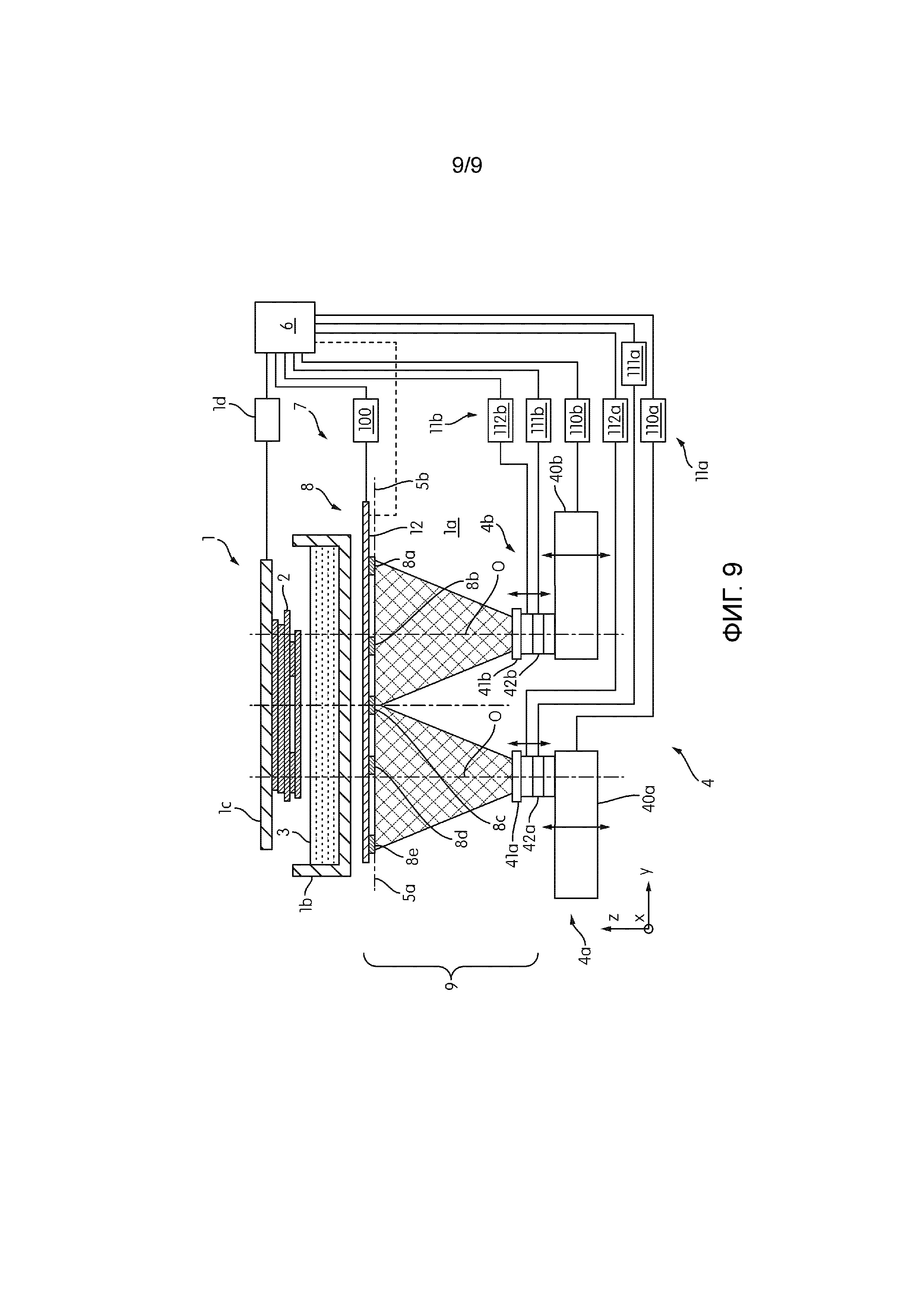 1. Стереолитографическое устройство (1) для генерирования трехмерного объекта (2) из фотоотверждаемого вещества (3), содержащее: оптический блок (4) для проецирования изображения на фотоотверждаемое вещество (3) для отверждения фотоотверждаемого вещества (3), осажденного в фокусном слое (5); блок (6) управления для управления оптическим блоком (4), отличающееся тем, что дополнительно содержит: блок (7) обнаружения, который содержит: средство (8) обнаружения, которое размещено с возможностью перемещения на участке (9) обнаружения для обнаружения в процессе генерирования или на протяжении паузы в генерировании по меньшей мере части изображения, проецируемого оптическим блоком (4), и для вывода сигнала, указывающего обнаруженное изображение, на блок (6) управления; и первое приводное средство (10) для перемещения средства (8) обнаружения в участок (9) обнаружения или из него, и при этом оптический блок (4) дополнительно содержит: второе приводное средство (11), которое связано с оптическим блоком (4) для перемещения фокусного слоя (5) в участок (9) обнаружения или из него, причем блок (6) управления дополнительно выполнен с возможностью управления первым приводным блоком (10) и вторым приводным средством (11) и регулировки оптического блока (4) и/или изменения изображения, подлежащего проекции, на основании сигнала, указывающего обнаруженное изображение. 2. Стереолитографическое устройство (1) по п. 1, отличающееся тем, что первое приводное средство (10) дополнительно выполнено с возможностью перемещения средства (8) обнаружения в участок (9) обнаружения или из него в направлении (X), перпендикулярном оптической оси (O). 3. Стереолитографическое устройство (1) по п. 1 или 2, отличающееся тем, что второе приводное средство (11) выполнено с возможностью перемещения фокального слоя (5) в участок (9) обнаружения или из него вдоль оптической оси (O). 4. Стереолитографическое устройство (1) по любому из пп. 1-3, отличающееся тем, что блок (7) обнаружения является съемным. 5. Стереолитографическое устройство (1) по любому из пп. 1-4, отличающееся тем, что средство (8) обнаружения содержит один или более датчиков (8a-8e). 6. Стереолитографическое устройство (1) по п. 5, отличающееся тем, что один или более датчиков (8a-8g), каждый из которых содержит активную зону (80) датчика, например CMOS-камеру, и/или один или более датчиков (8a-8g) пригодны для обнаружения длины волны экспозиции оптическим блоком (4). 7. Стереолитографическое устройство (1) по п. 5 или 6, отличающееся тем, что средство (8) обнаружения содержит кронштейн (12) для поддержки датчиков (8a-8e) в матрице, причем первое приводное средство (10) связано с кронштейном (12) и дополнительно выполнено с возможностью перемещения кронштейна (12) в участок (9) обнаружения или из него, причем кронштейн (12) располагается параллельно поверхности фотоотверждаемого вещества (3), которая обращена к оптическому блоку (4). 8. Стереолитографическое устройство (1) по любому из пп. 1-7, отличающееся тем, что второе приводное средство (11) дополнительно выполнено с возможностью независимого вращения оптического блока (4) относительно трех взаимно перпендикулярных направлений (X, Y, Z), причем одно из упомянутых направлений (Z) перпендикулярно поверхности фотоотверждаемого вещества (3), обращенной к оптическому блоку (4), и блок (6) управления дополнительно выполнен с возможностью регулировк