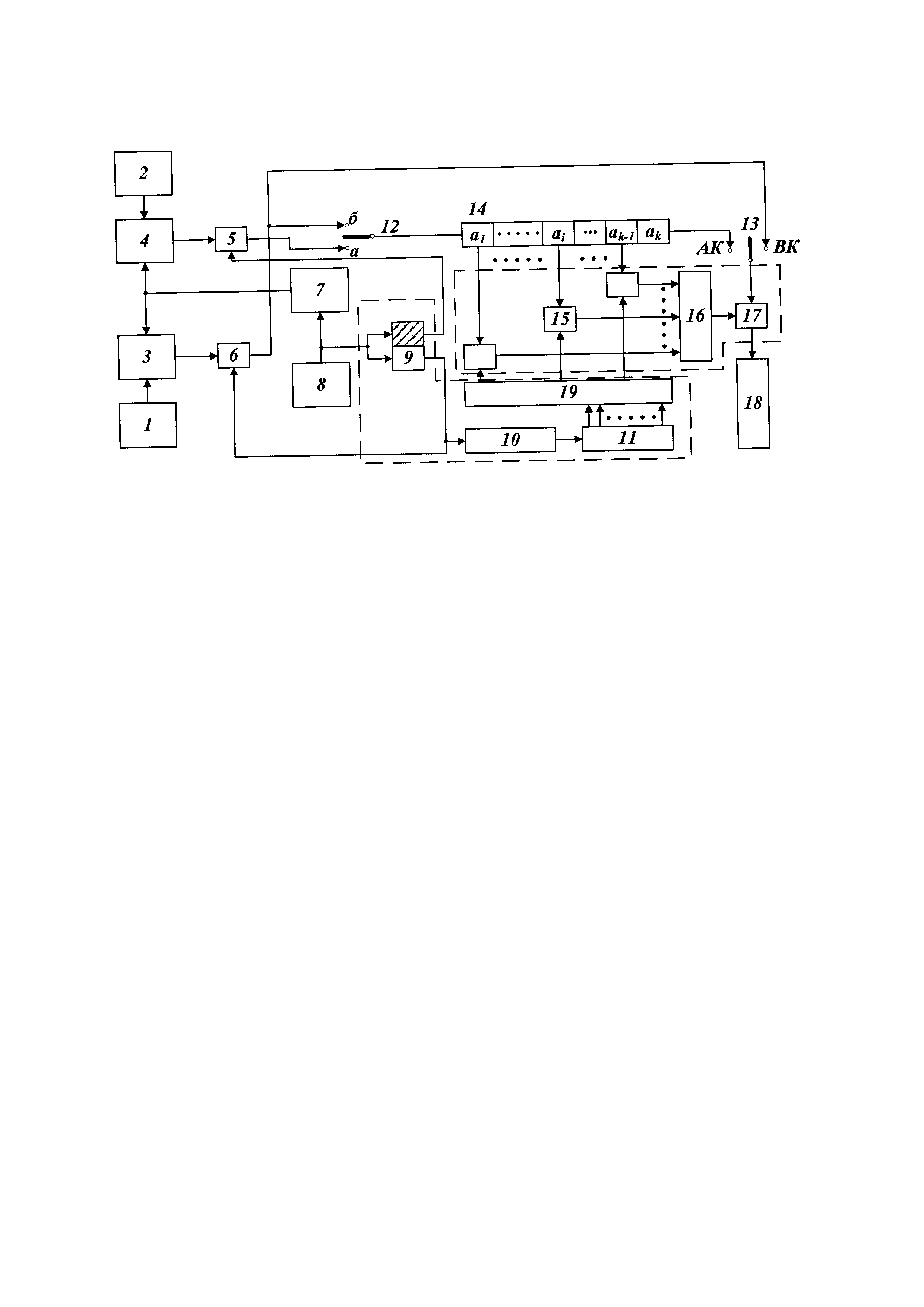 Изобретение относится к областям радиотехники и измерительной техники и может быть использовано в устройствах измерения коэффициента корреляции случайного сигнала, в устройствах оценки параметров случайного сигнала аппаратуры управления и передачи информации, предназначенным для корреляционного анализа случайных процессов, представленных цифровыми кодами. Большое количество корреляторов описано в [Жовинский В.И., Арховский В.Ф. Корреляционные устройства. М.: Энергия, 1974], однако многие из них сложны в технической реализации, имеют большой аппаратный объем и низкое быстродействие, наиболее близким аналогом является цифровой коррелятор [Патент RU 2735488 С1 Российская Федерация, МПК G06F 17/15 (2006.01) цифровой коррелятор / О.В. Чернояров и др./ ФГБОУ ВО Майкопский государственный университет (RU). - №2020113740, заявл. 03.04.2020, опубликовано: 03.11.2020 Бюл. №31]. Предлагаемый коррелятор отличается тем, что в нем используется один генератор равномерно распределенных случайных чисел, связанный с двумя схемами сравнения, подключенными через вентили и переключатель к регистру сдвига, используемому в качестве устройства задержки. Причем разрядные его выходы связаны через схемы совпадения, вторые входы которых подключены к дешифратору, с общей собирательной схемой. Последняя через дополнительную схему совпадения соединена с выходным счетчиком. Сущность изобретения поясняется чертежом, на котором изображена функциональная схема знакового цифрового коррелятора, где: 1, 2 - генераторы кодов исследуемых сигналов; 3, 4 - схемы сравнения кодов; 5, 6 - вентили; 7 - генератор равномерно распределенных случайных чисел; 8 - генератор тактовых импульсов; 9 - триггер управления; 10 - делитель частоты; 11 - первый счетчик; 12, 13 - переключатели; 14 - сдвигающий регистр; 15 - схемы совпадения; 16 - собирательная схема; 17 - дополнительная схема совпадения; 18 - второй счетчик; 19 - дешифратор. Работа предлагаемого устройства состоит в следующем. В тактовые моменты времени, задаваемые генератором 8 через триггер 9, текущее значение исследуемой случайной функции с генератора 2 сравнивается на схеме 4 с вырабатываемым в каждый тактовый момент времени генератором 7 равномерно распределенным случайным числом. На выходе схемы 4 появляется импульс, если текущее значение случайного кода входного сигнала не меньше, чем случайное число. Вырабатываемая таким образом на выходе схемы 4 последовательность двоичных сигналов «1» и «0» поступает через вентиль 5 и переключатель 12 в к-разрядный регистр сдвига 14. Информация в регистре сдвига по каждому тактовому импульсу сдвигается на один разряд вправо. Информация, хранящаяся в регистре сдвига, является основной для получения корреляционной функции исследуемого случайного процесса. Выходы регистра сдвига соединены со входами схем совпадения 15, которые поочередно опрашиваются сигналами с дешифратора 19 с частотой ƒ/N, где ƒ - частота поступления тактовых импульсов с триггера 9. Устройство опроса работает следующим образом. На вход делителя частоты 10 поступают импульсы с частотой ƒ от триггера 9, связанного с генератором 8 тактовых импульсов. На выходе делителя появляются импульсы с частотой ƒ/N и поступают на вход счетчика 11 на n разрядов. Число разрядов n выбирается так, что 2n = к. Выходы счетчиков соединены со входами дешифратора. На выходах дешифратора 