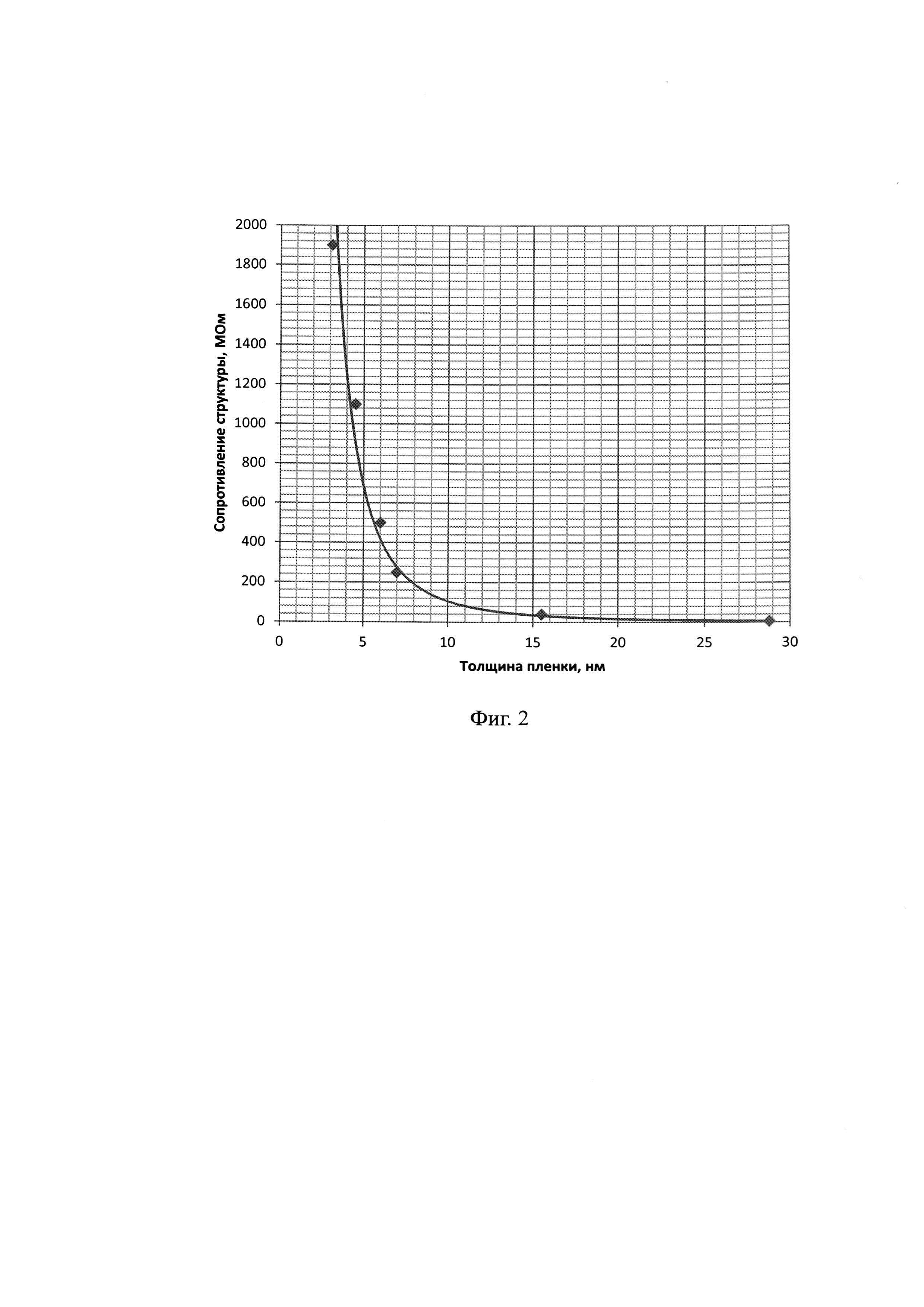 В качестве наглядной демонстрации возможности нанесения тонких сплошных пленок на сложные 3D поверхности была выбрана подложка микроканальной пластины (МКП). МКП представляет собой стеклянный диск диаметром 25 мм, толщиной 300 мкм, в котором образованы порядка 5 миллионов тонких каналов. Диаметр каждого канала составляет 5 мкм. Таким образом, МКП имеет высокое аспектное отношение толщины пластины к диаметру канала, которое составляет 60. В качестве прекурсоров для роста пленки оксида олова использовались тетраэтилолово и озон. В качестве прекурсоров для оксида индия использовались этилдиметилиндий ((СН3)2In(С2H5)) и озон. Время подачи прекурсоров составляло 150 мс для этилдиметилиндия и тетраэтилолова, а для озона 5 с. Температура в реакторе составляла 280°С. Состав оксида индия и олова определялся чередованием слоев МН, где на 80% оксида индия приходилось 20% оксида олова. На Фиг. 2 приведена зависимость сопротивления полученной структуры от толщины пленки оксида индия и олова.