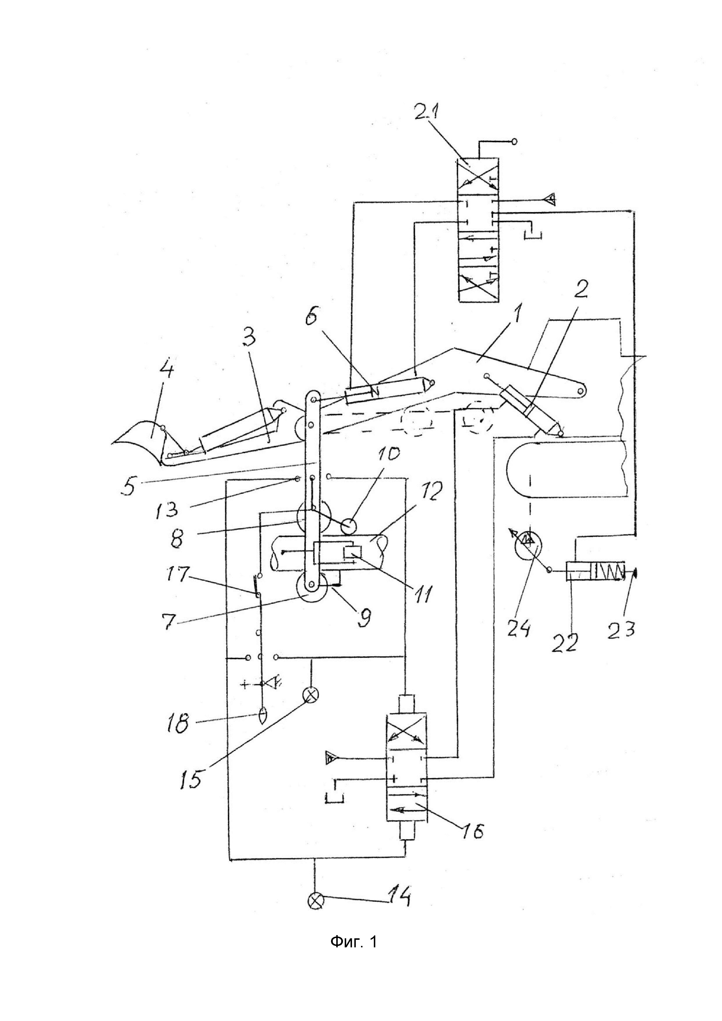 1. Рабочее оборудование одноковшового экскаватора, содержащее стрелу, рукоять, ковш с гидроприводами, рабочий орган для отрывки трубопроводов и средство ориентации рабочего органа относительно трубопровода, отличающееся тем, что оно снабжено дополнительной рукоятью с гидроцилиндром привода, регулируемым гидродвигателем, гидроцилиндром управления, датчиками горизонтального и вертикального перемещения, причем шарнирно и соосно со штатной рукоятью установлена дополнительная рукоять с консольно-установленным на ее нижнем конце рабочим органом для отрывки трубопровода, выполненным в виде шнековой фрезы и проволочной щетки с приводами вращения, а гидроцилиндр привода дополнительной рукояти сообщен гидролиниями с четырехпозиционным гидрораспределителем, выполненным с возможностью сообщения, в одной из позиций золотника, со штоковой полостью гидроцилиндра управления, в поршневой полости которого установлен упругий элемент с механизмом регулирования силы упругости, а шток гидроцилиндра управления шарнирно соединен с органом управления регулируемого гидродвигателя привода ходового оборудования базовой машины, при этом датчики перемещения установлены на дополнительной стреле с возможностью односторонней связи с трубопроводом и контакты датчика вертикального перемещения соединены электролиниями с катушками электроуправляемого гидрораспределителя привода подъема стрелы и со светозвуковыми сигнализаторами, а контакты датчика бокового горизонтального перемещения соединены электролиниями со светозвуковыми сигнализаторами бокового смещения. 2. Рабочее оборудование одноковшового экскаватора по п. 1, отличающееся тем, что светозвуковые сигнализаторы установлены в кабине машиниста на пульте управления.