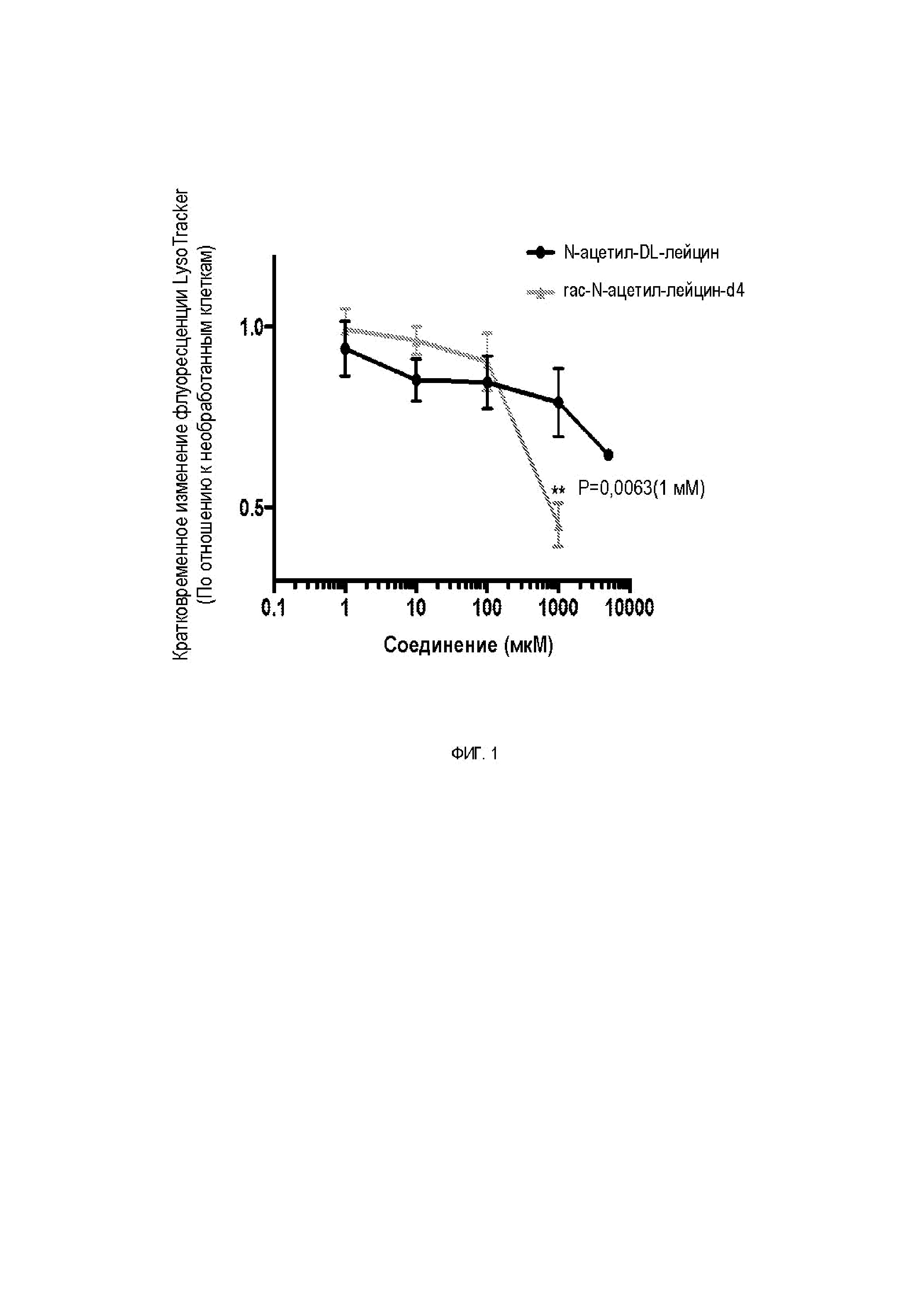 Ацетиллейцин-2, 3, 3, 4--d4 (обозначенный как rac-N-ацетил-лейцин-d4) показал значительно больший эффект, чем у ацетиллейцин (обозначенный как N-ацетил-DL-лейцин). Например, 1 мМ ацетиллейцин-2, 3, 3, 4-d4показал значительное снижение уровня флуоресценции LysoTracker по сравнению с 1 мМ ацетиллейцином. Эффекты наблюдались как в клеточной линии NPC CHO, так и в клеточной линии фибробластов человека Tay-Sachs, AB Variant. Результаты показаны на фиг. 1 и фиг. 2.