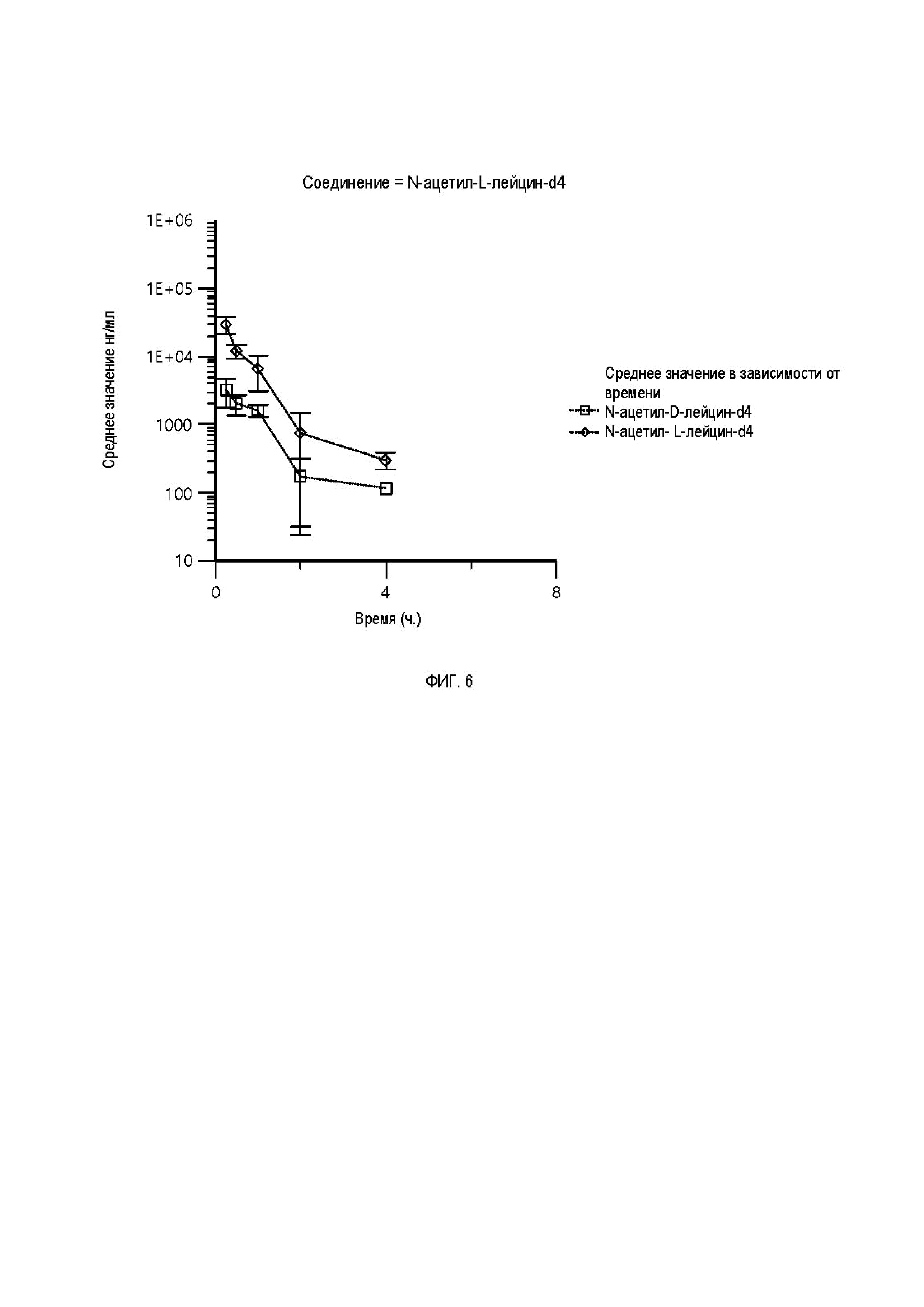 После п.о. введения ацетиллейцин-2, 3, 3, 4-d4 (1) в номинальной дозе 100 мг/кг, Cmax ацетил-D-лейцин-2, 3, 3, 4-d4, 3230 нг/мл, была достигнута через 0, 25 ч после введения дозы с AUClast 3150 ч * нг/мл; Cmax ацетил-L-лейцин-2, 3, 3, 4-d4 (1), 29300 нг/мл, была достигнута через 0, 25 ч после введения дозы с AUClast, равным 18200 ч * нг/мл. Соотношение L-форма/D-форма составляло 9, 08 для Cmax и 5, 78 для AUClast. См. фиг. 6.