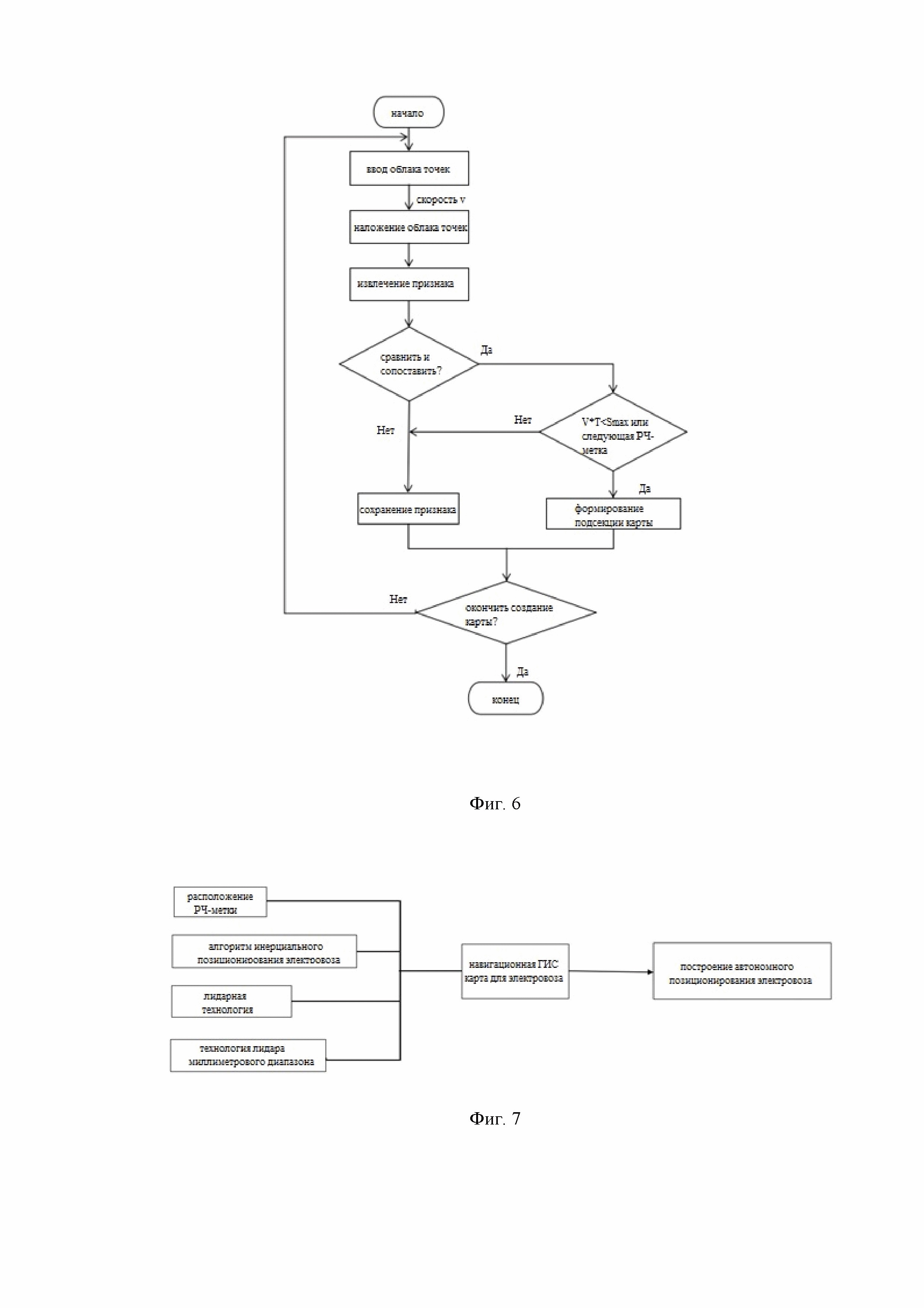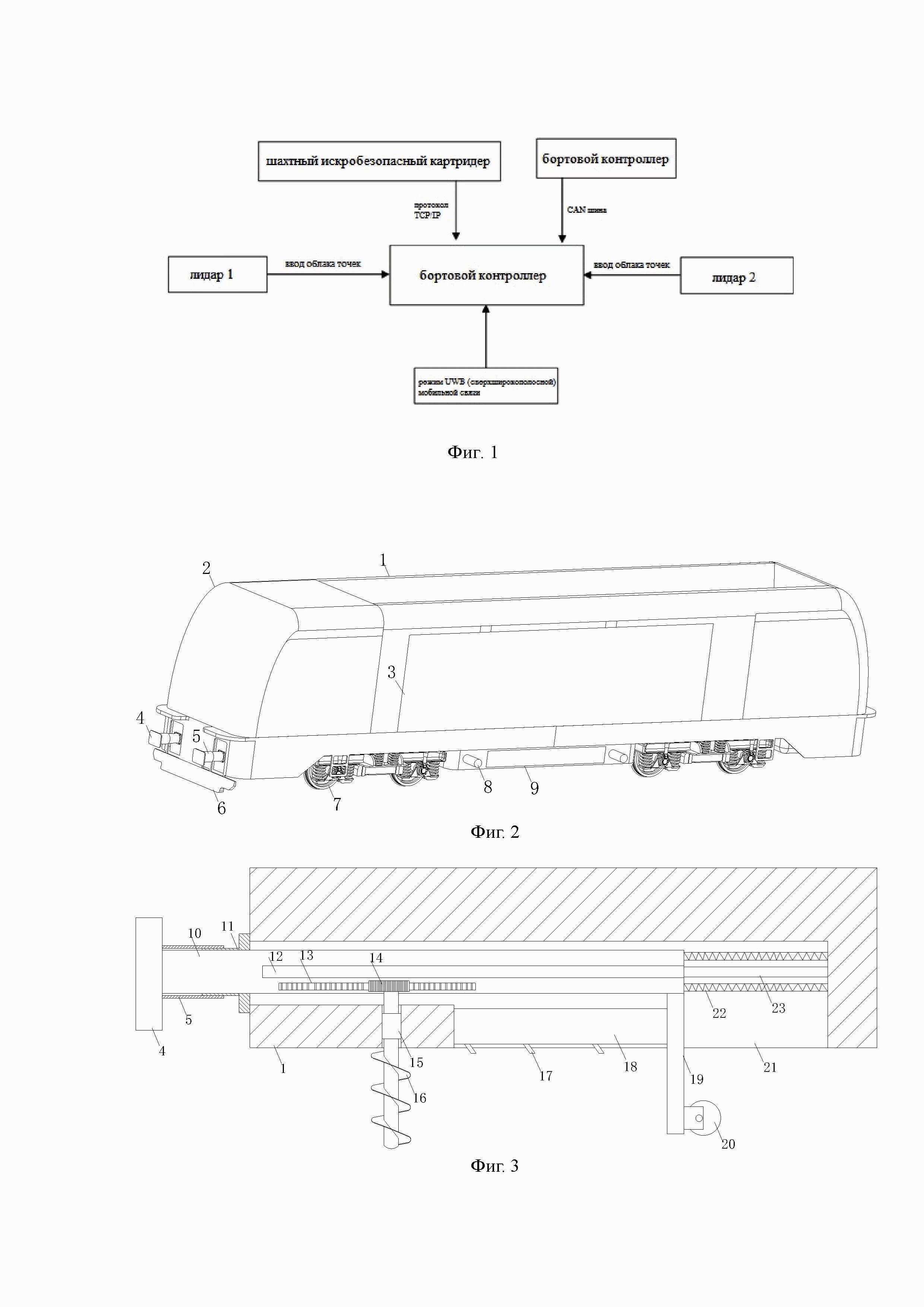 Область техники Изобретение относится к системе позиционирования, в частности к способу автономного позиционирования для шахтного электровоза с взрывобезопасной аккумуляторной батареей. Описание уровня техники Электровозы являются главным видом вспомогательного транспорта в угольных шахтах и выполняют важные задачи транспортировки персонала, оборудования, материалов и т.д. В настоящее время управление электровозом полностью осуществляет машинист, и человеческие факторы, такие как усталость машиниста, могут легко влиять на проблемы с безопасностью, такие как ненамеренное превышение скорости, проезд на красный свет и наезды сзади. В известном уровне техники шахтные электровозы используют главным образом радиочастотный способ совпадения фингерпринтов, чтобы задействовать позиционирование, который в основном применяется во внешней среде или во внутренних местах с хорошей окружающей средой; в отношении позиционирования в ограниченном пространстве, беспроводное позиционирование основано главным образом на таких технологиях как WiFi, Bluetooth или NFC. Точность позиционирования необходимо повышать, и точность позиционирования электровозов не является достаточно точной, что может легко приводить к несчастным случаям. Тормозная система электровоза также представляет собой одну из главных причин несчастных случаев, во время движения электровоз не может очищать мусор на колее, поэтому мусор накапливается в колее и влияет на нормальное использование колес и деталей тормозной системы; в сложных случаях электровоз может сойти с рельсов. Раскрытие изобретения Направленное на проблемы в уровне техники, изобретение предлагает способ автономного позиционирования для шахтного электровоза с взрывобезопасной аккумуляторной батареей. Изобретение может быть осуществлено с применением следующих технических схем. Способ автономного позиционирования для шахтного электровоза с взрывобезопасной аккумуляторной батареей включает следующие этапы: этап S1, построение динамической карты подземной угольной шахты, сканирование окружающей среды лидаром на частоте выше 10 Гц и передача данных на бортовой контроллер, построение динамической карты бортовым контроллером по карте распределения облака точек; этап S2, шахтный электровоз может быть точно позиционирован посредством применения режима статического точного позиционирования, режима динамического точного позиционирования и режима многоколейного поперечного позиционирования; этап S3, посредством объединения множественных режимов динамического позиционирования, когда шахтные электровозы работают нормально, в большинстве случаев применяется лидарное позиционирование, и инерциальное позиционирование применяется на участке, где дорожные признаки не очевидны и где лидар не может осуществлять точное распознавание; пассивная калибровка по идентификационной карте с РЧ-меткой применяется в главных точках дорожного пути, и различные технологии динамического позиционирования объединены, чтобы осуществлять автономное позиционирование электровозов; при этом электровоз включает тормозной механизм, тормозной механизм включает колеса и тормозной диск, электровоз оснащен некоторым множеством колес на обеих сторонах нижней части, тормозной диск соединен с осью электро