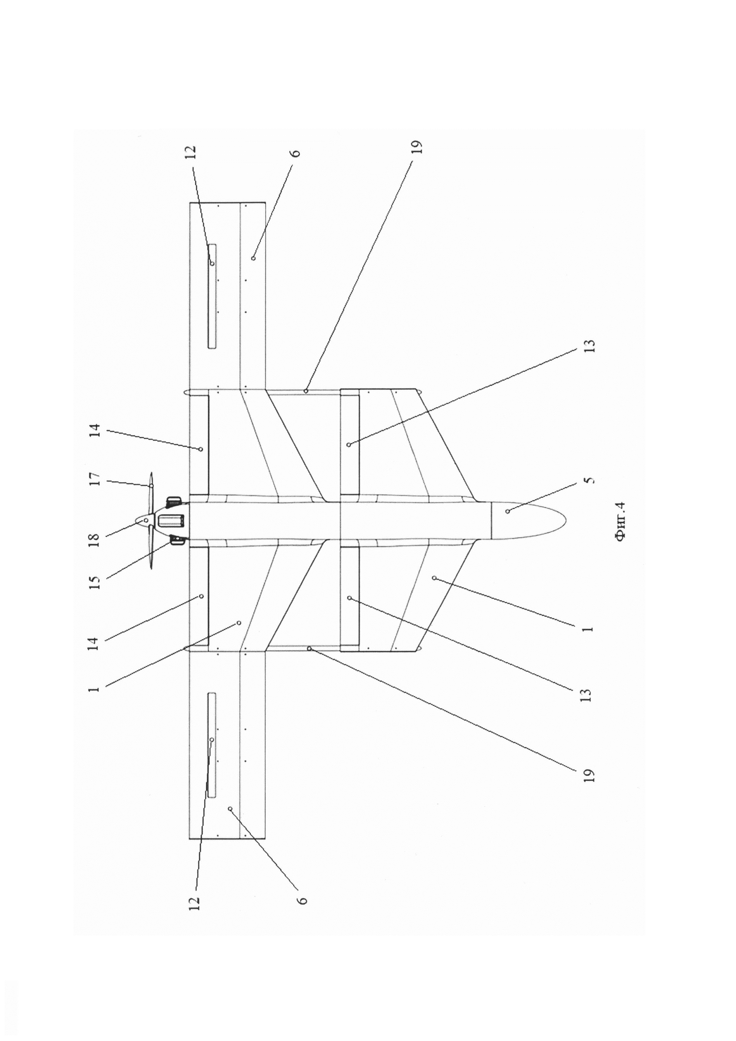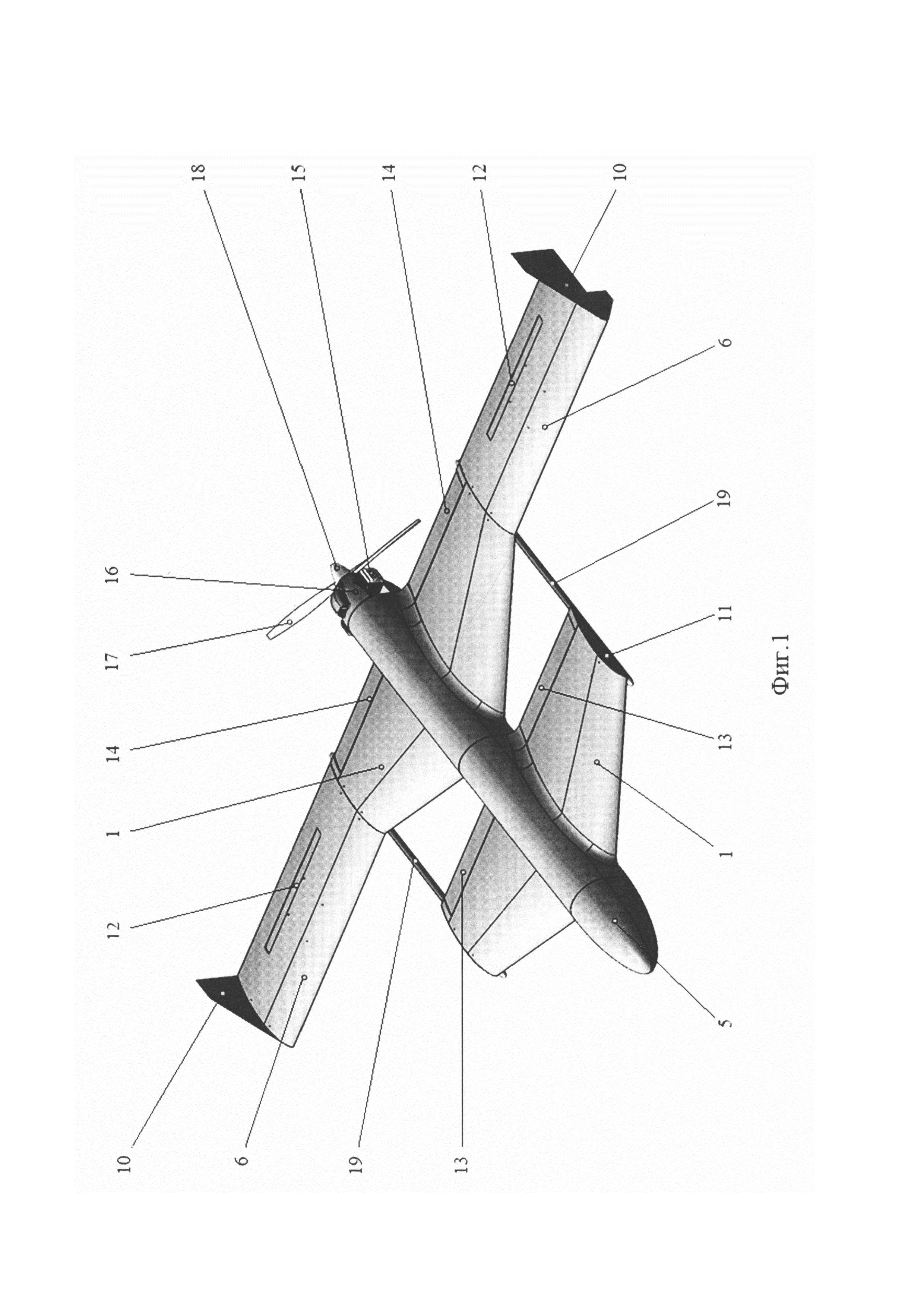2. БПЛА по п.1, отличающийся тем, что центроплан крыла оснащен рулями высоты, а переднее горизонтальное оперение оснащено закрылками, кроме того нижние панели центроплана выполнены с четырьмя технологическими люками и заглушены съемными крышками.